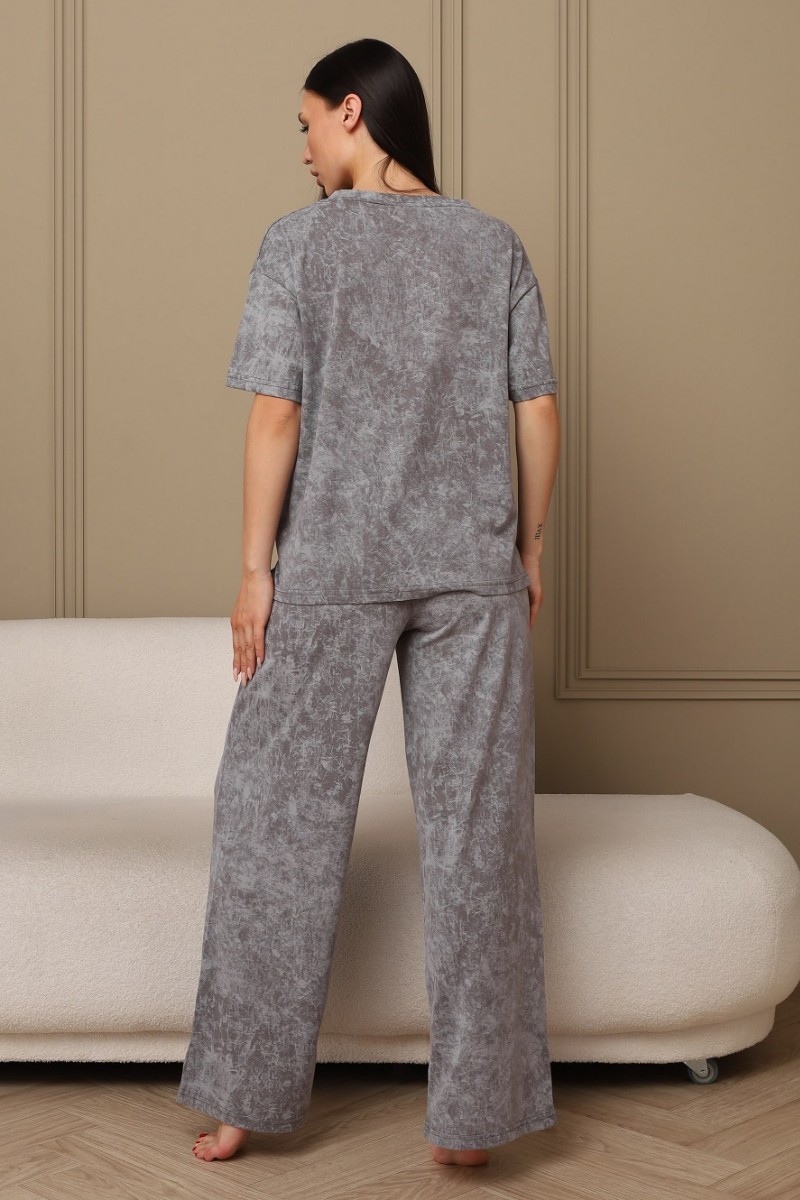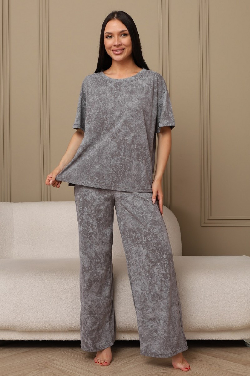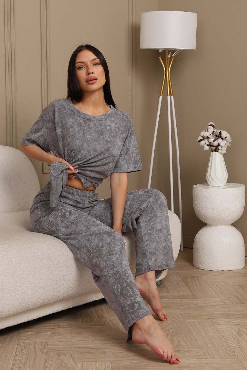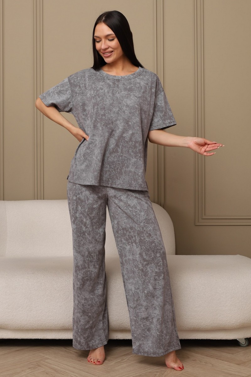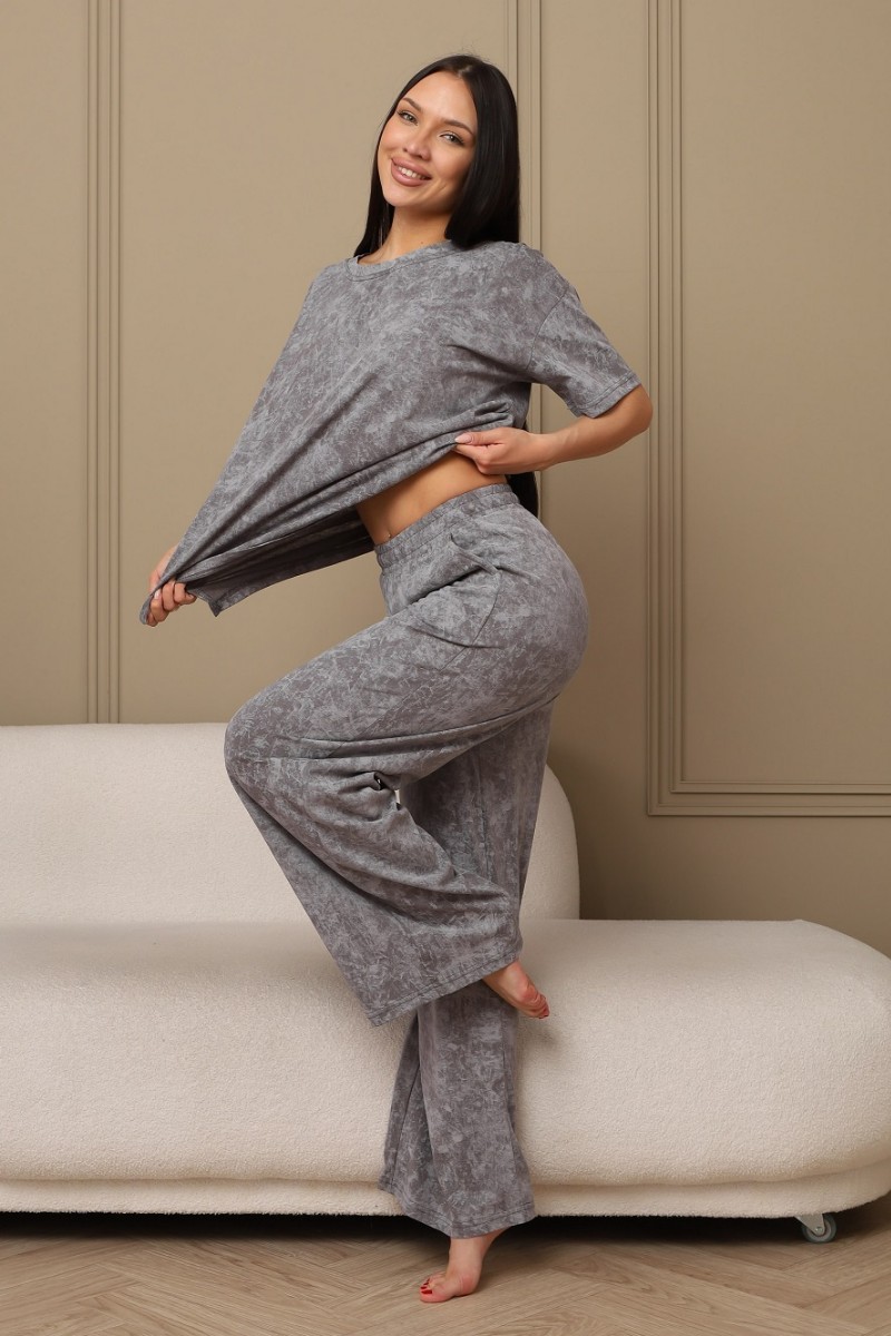 Представляем Вашему вниманию домашний женский костюм двойку, состоящий из футболки оверсайз, с разрезами в боковых швах по низу изделия, и свободных штанов-палаццо, дополненных широким поясом на резинке. Сшиты из качественного хлопкового полотна, позволяющего коже дышать.