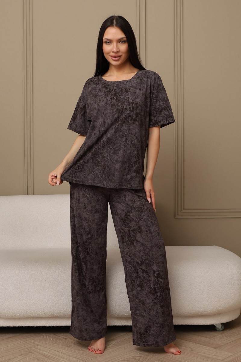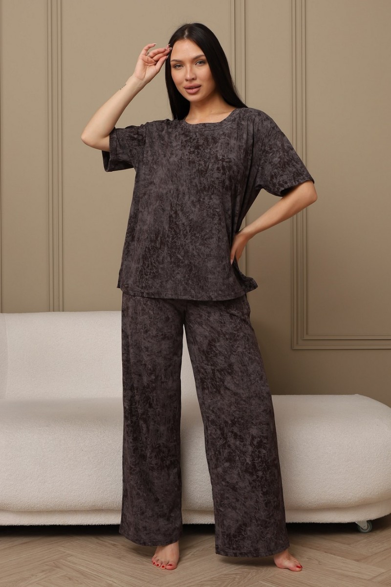 Представляем Вашему вниманию домашний женский костюм двойку, состоящий из футболки оверсайз, с разрезами в боковых швах по низу изделия, и свободных штанов-палаццо, дополненных широким поясом на резинке. Сшиты из качественного хлопкового полотна, позволяющего коже дышать.