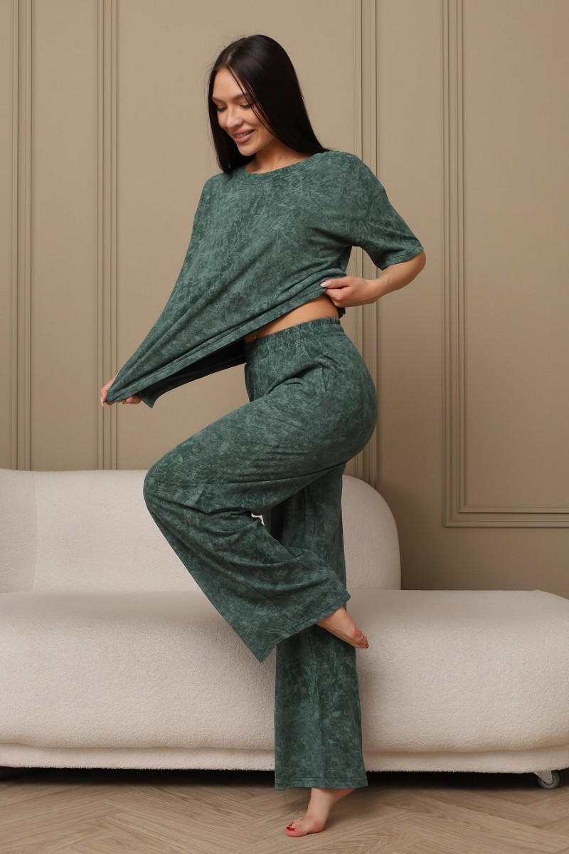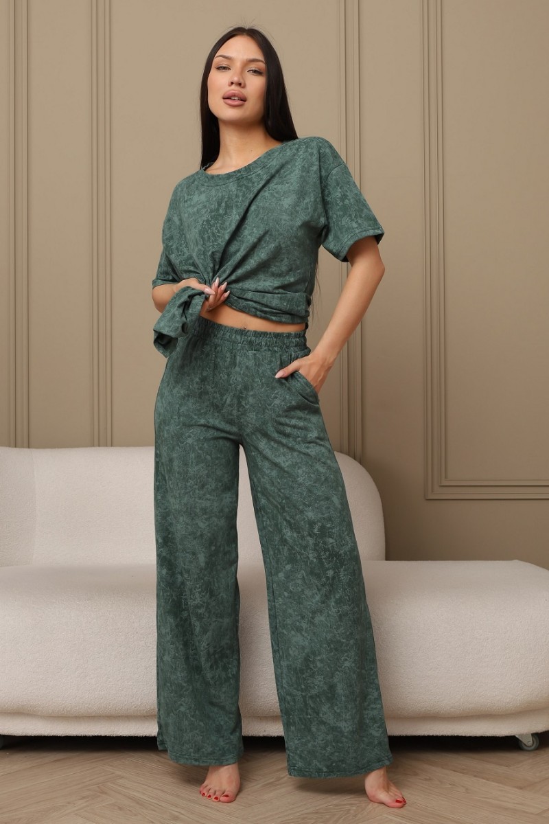 Представляем Вашему вниманию домашний женский костюм двойку, состоящий из футболки оверсайз, с разрезами в боковых швах по низу изделия, и свободных штанов-палаццо, дополненных широким поясом на резинке. Сшиты из качественного хлопкового полотна, позволяющего коже дышать.
