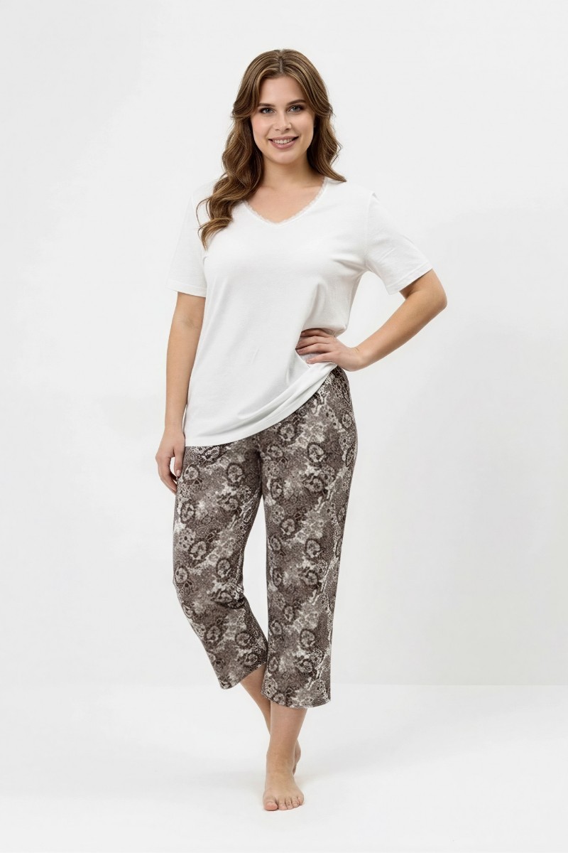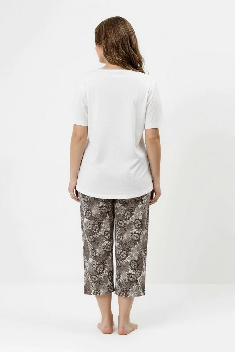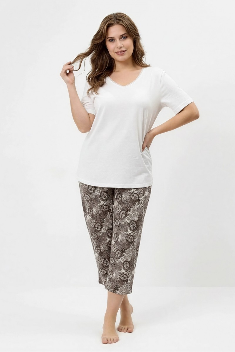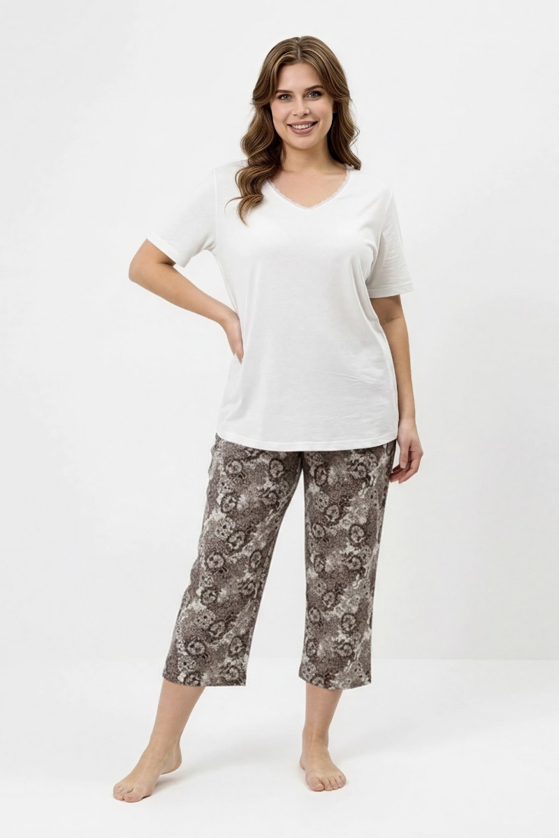 Представляем Вашему вниманию женскую пижаму из трикотажного полотна «кулирка» в комбинации двух видов: гладкокрашеного и с набивным рисунком, состоящая из футболки и бридж. Футболка – из гладкокрашеного полотна, с короткими втачными рукавами и горловиной V-образной формы. Срезы горловины обработаны узким кружевом.Бриджи – из полотна с набивным рисунком, свободные классического покроя, с эластичной тесьмой по талии.