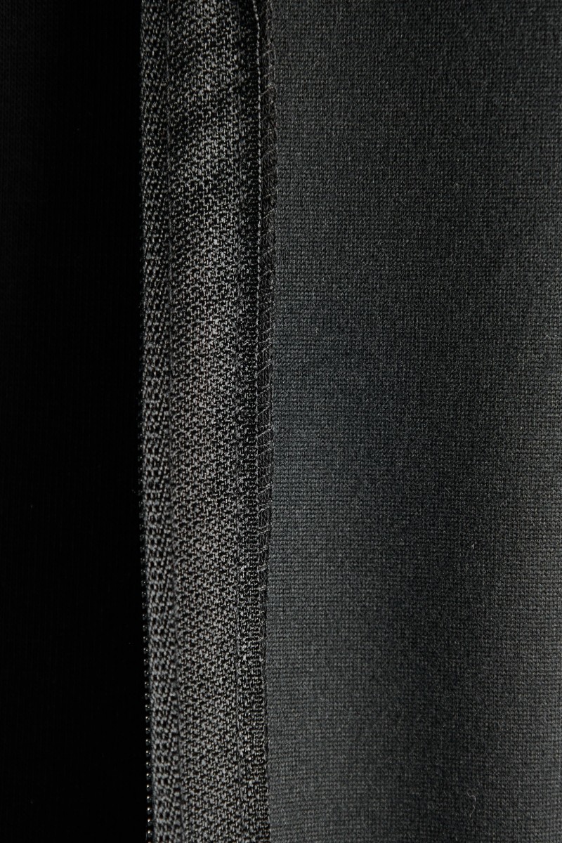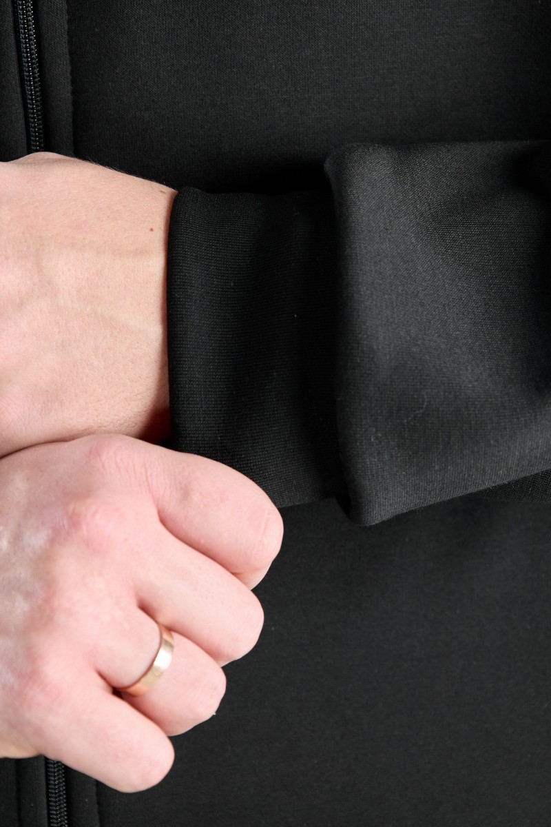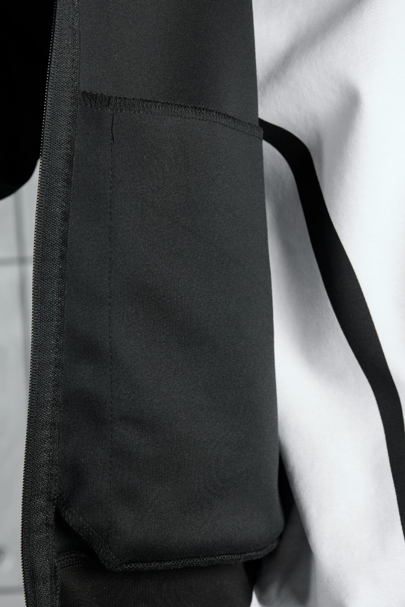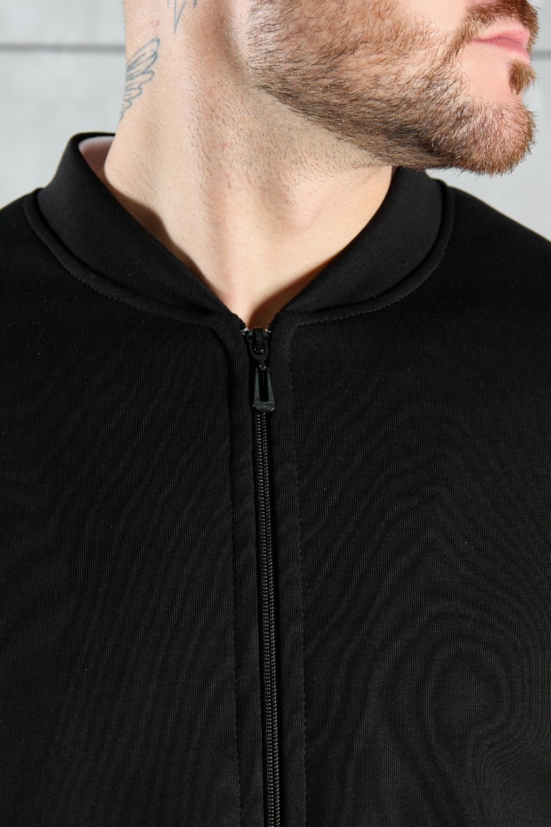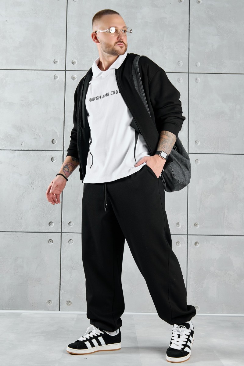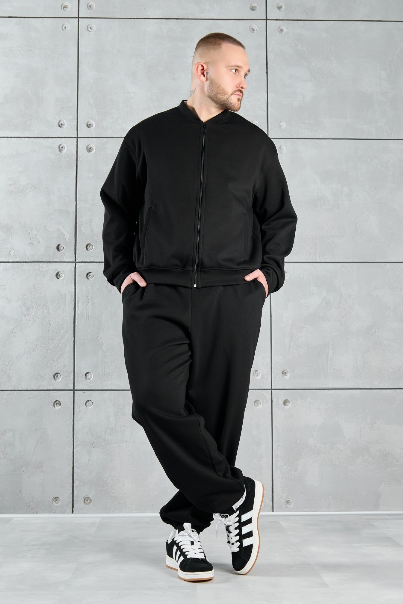 Представляем Вашему вниманию костюм мужской из трикотажного полотна "лининг", состоящий из бомбера и брюк. Бомбер - с длинными втачными рукавами с притачными манжетами, прорезными карманами с листочками на полочках, центральной бортовой застежкой на тесьму "молния", втачным воротником-стойкой с закругленными концами и притачным поясом по низу. По шву притачивания пояса и проймам настрочены отделочные строчки. Брюки - свободного покроя, со смещенными к центрам передних половин боковыми швами, карманами в боковых швах и притачным поясом с эластичной тесьмой внутри. Нижние срезы обработаны подгибкой с эластичной тесьмой. Для регулирования степени прилегания изделия по талии предусмотрен шнурок, вставленный через две обметанные петли в центре пояса спереди.