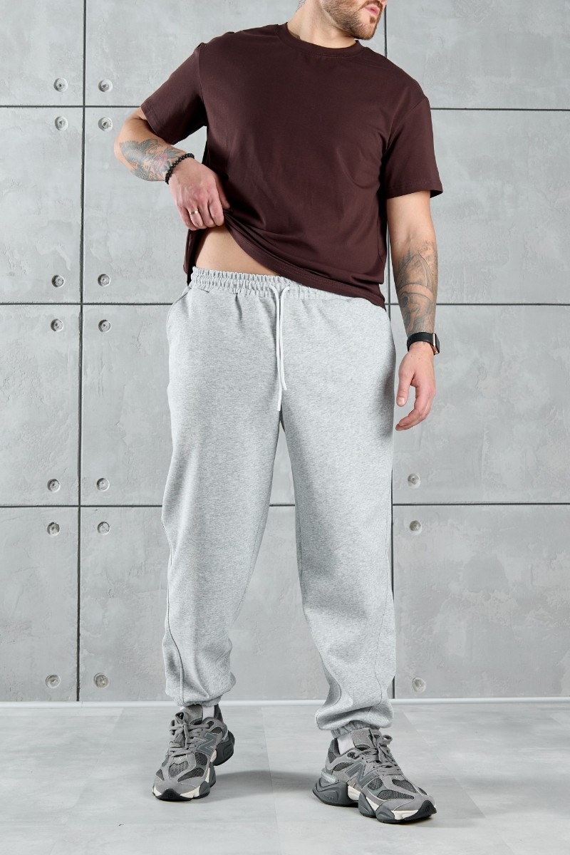Представляем Вашему вниманию брюки мужские из трикотажного полотна "лининг" свободного покроя, со смещенными к центрам передних половин боковыми швами, карманами в боковых швах и притачным поясом с эластичной тесьмой внутри. Нижние срезы обработаны подгибкой с эластичной тесьмой. Для регулирования степени прилегания изделия по талии предусмотрен шнурок, вставленный через две обметанные петли в центре пояса спереди.