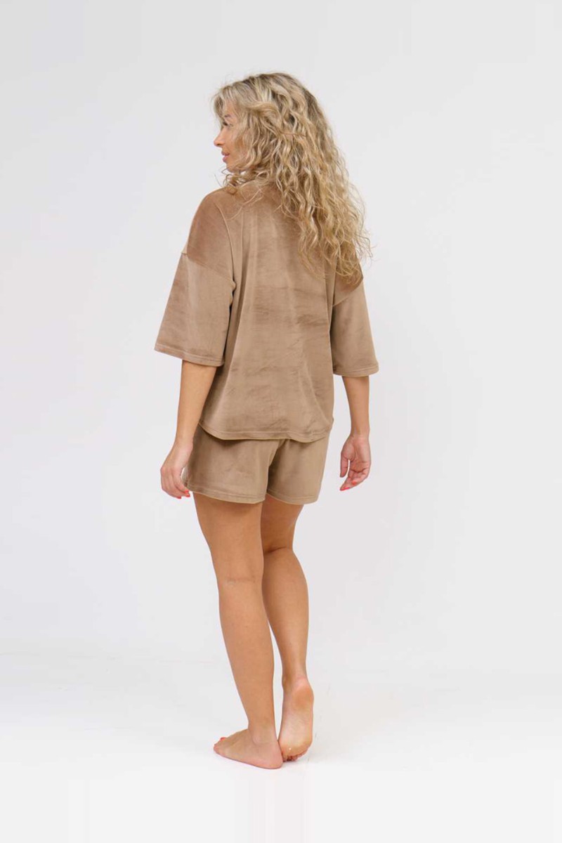 Представляем Вашему вниманию стильный костюм с шортами из велюра. Футболка со спущенным цельнокроеным плечом прямого силуэта. Шорты классические на резинке. Велюровое полотно имеет нежную и мягкую фактуру. Домашний костюм хорошо смотрится, создает привлекательные блики. В данном комплекте вы почувствуете себя королевой.