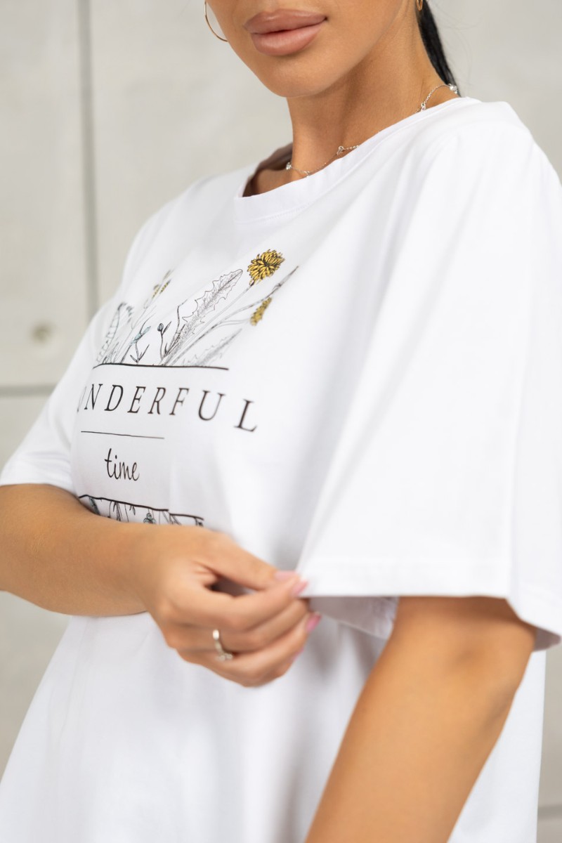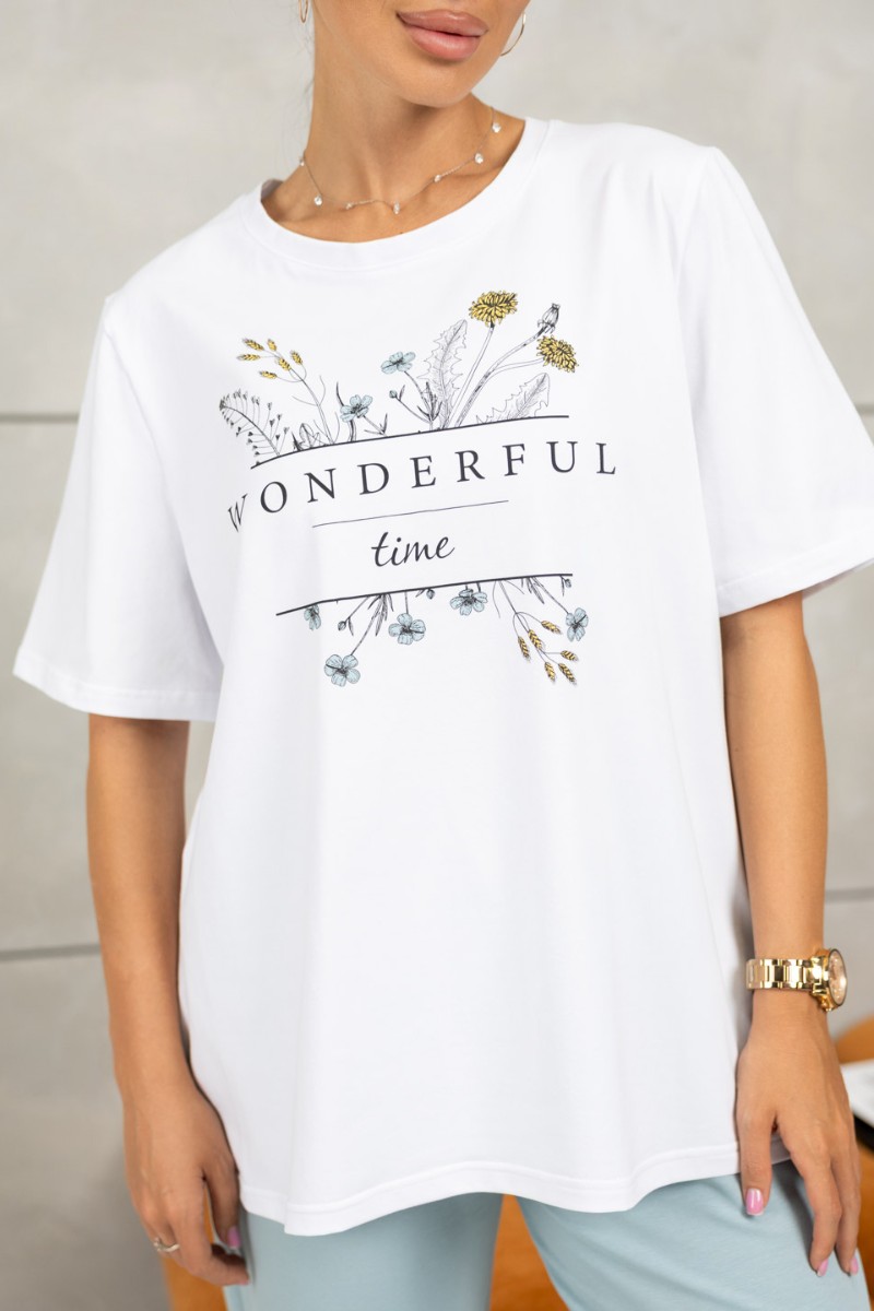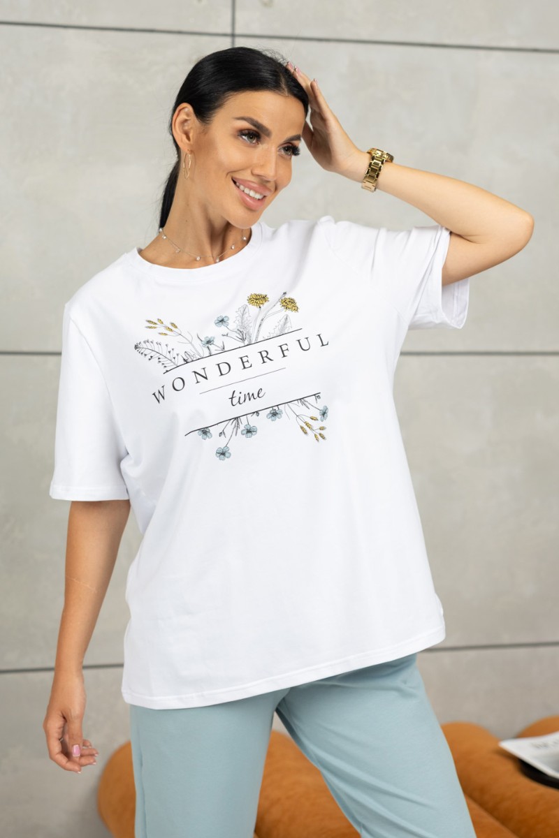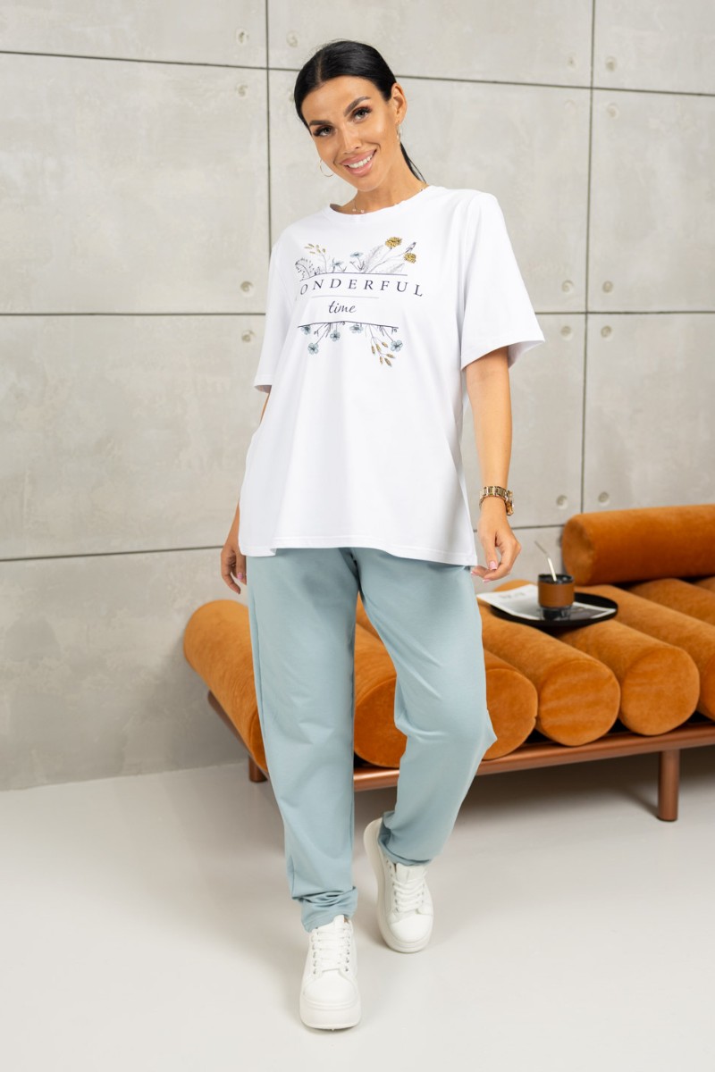 Представляем Вашему вниманию костюм женский - брюки и футболка. Футболка свободного силуэта с удлиненным втачным рукавом и округлой горловиной, на передней части печатный рисунок. Брюки с поясом на резинке, для надежной фиксации и карманами с отрезным бочком.