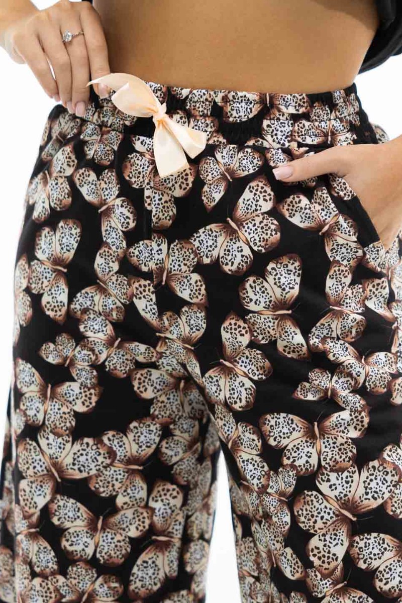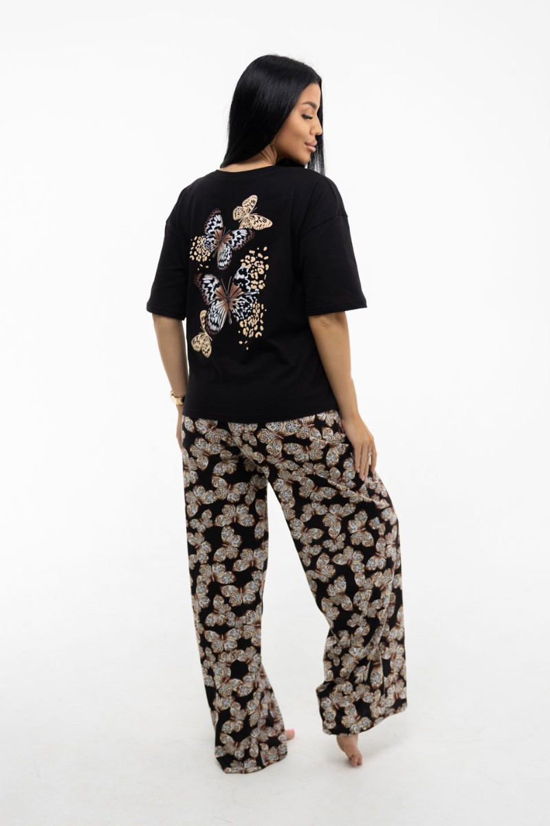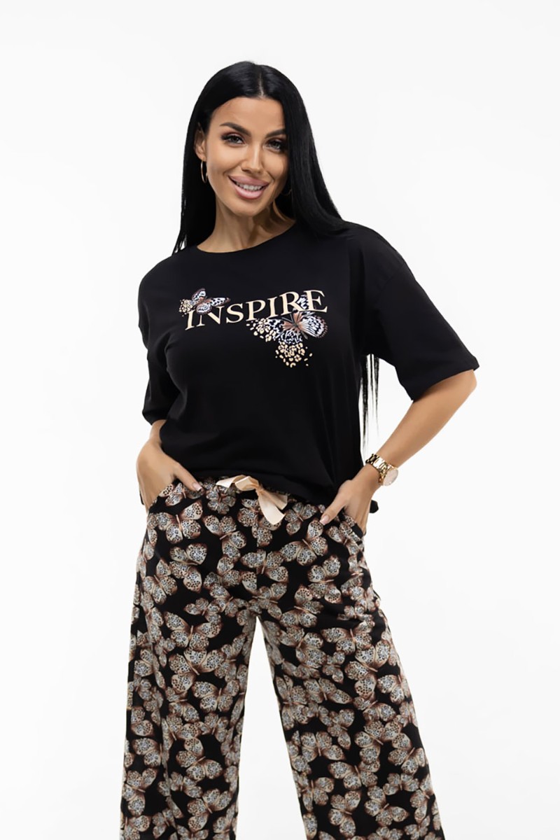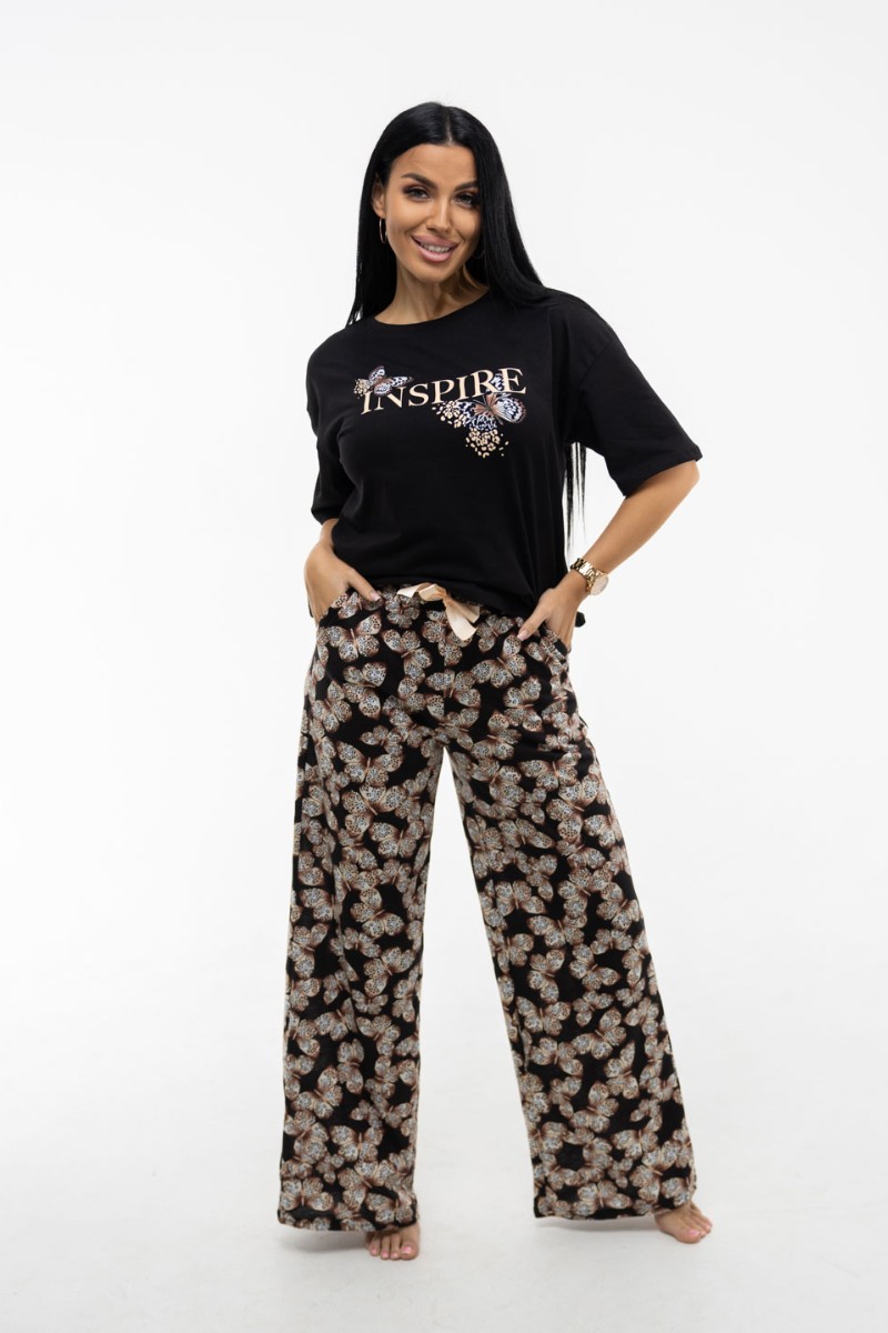 Представляем Вашему вниманию базовый комплект с широкими штанами и крутой футболкой со спущенной линией плеча и двумя стильными печатями. Брюки выполнены из ткани с рисунком, в боковых швах карманы, на поясе декоративный атласный бантик. Принт на футболке идеально подобран к штанам. Элегантный брючный костюм позволит вам ощутить себя настоящей иконой стиля. Закажите свой уникальный пижамный костюм прямо сейчас и подчеркните свою индивидуальность.