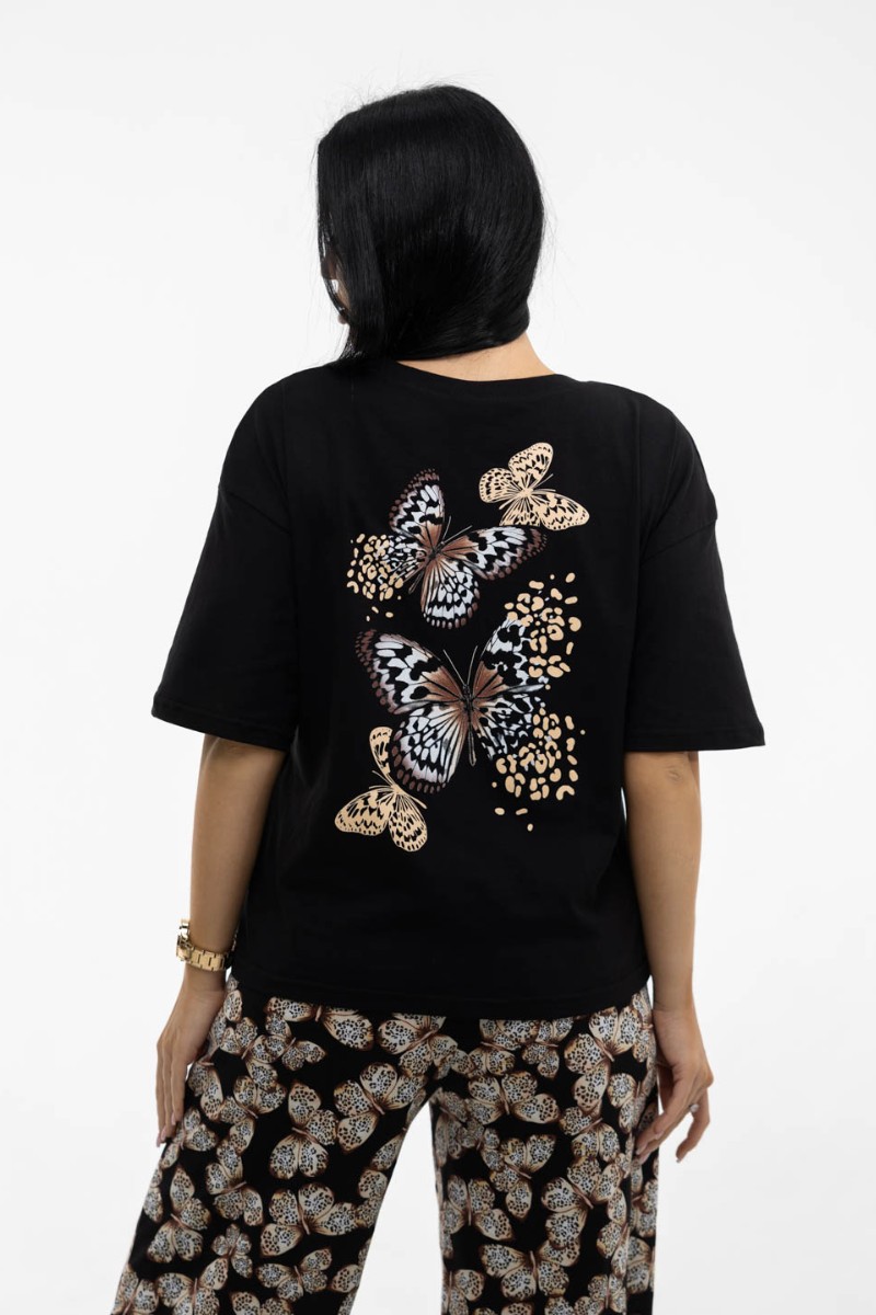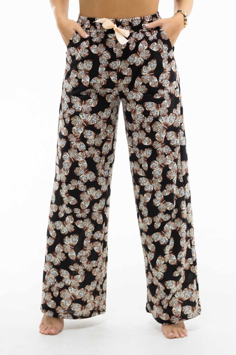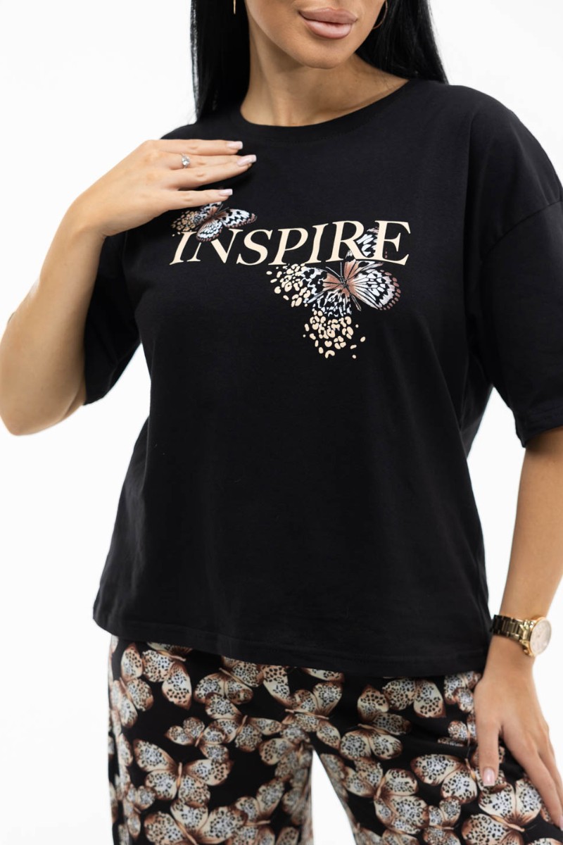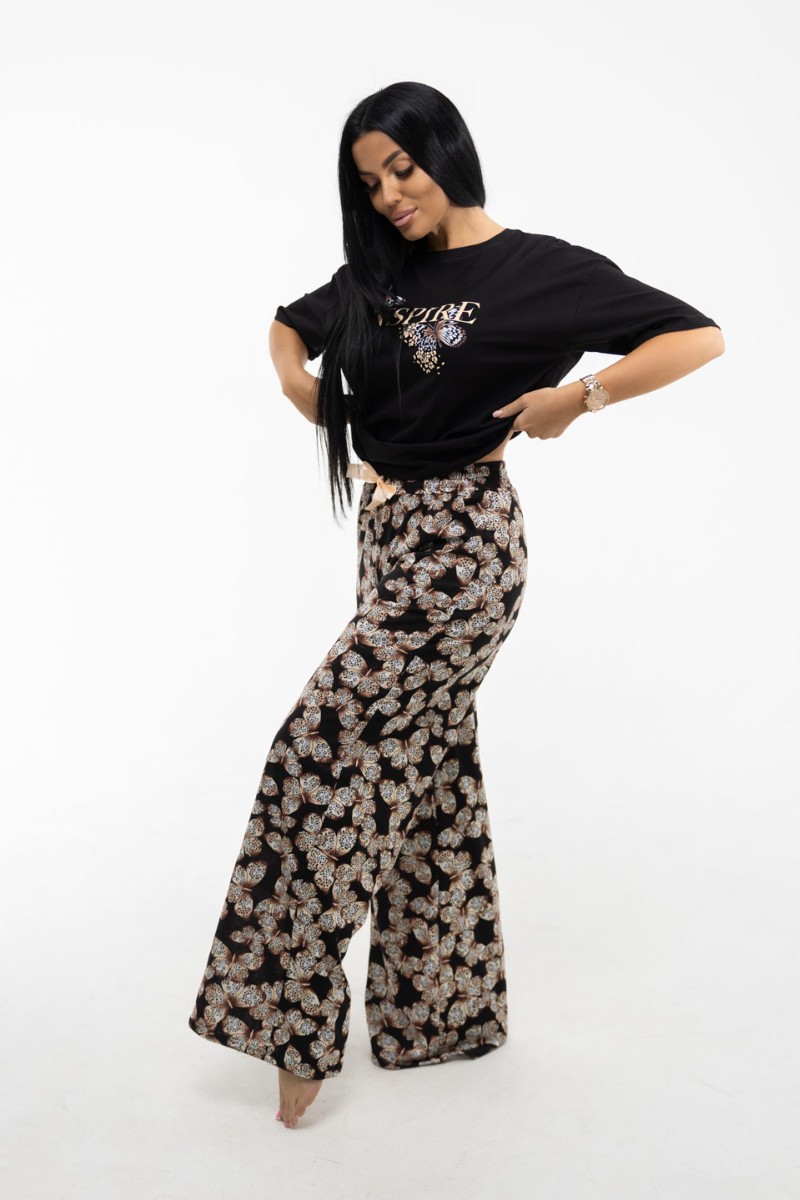 Представляем Вашему вниманию базовый комплект с широкими штанами и крутой футболкой со спущенной линией плеча и двумя стильными печатями. Брюки выполнены из ткани с рисунком, в боковых швах карманы, на поясе декоративный атласный бантик. Принт на футболке идеально подобран к штанам. Элегантный брючный костюм позволит вам ощутить себя настоящей иконой стиля. Закажите свой уникальный пижамный костюм прямо сейчас и подчеркните свою индивидуальность.
