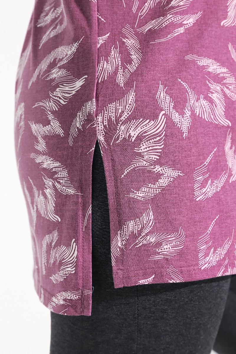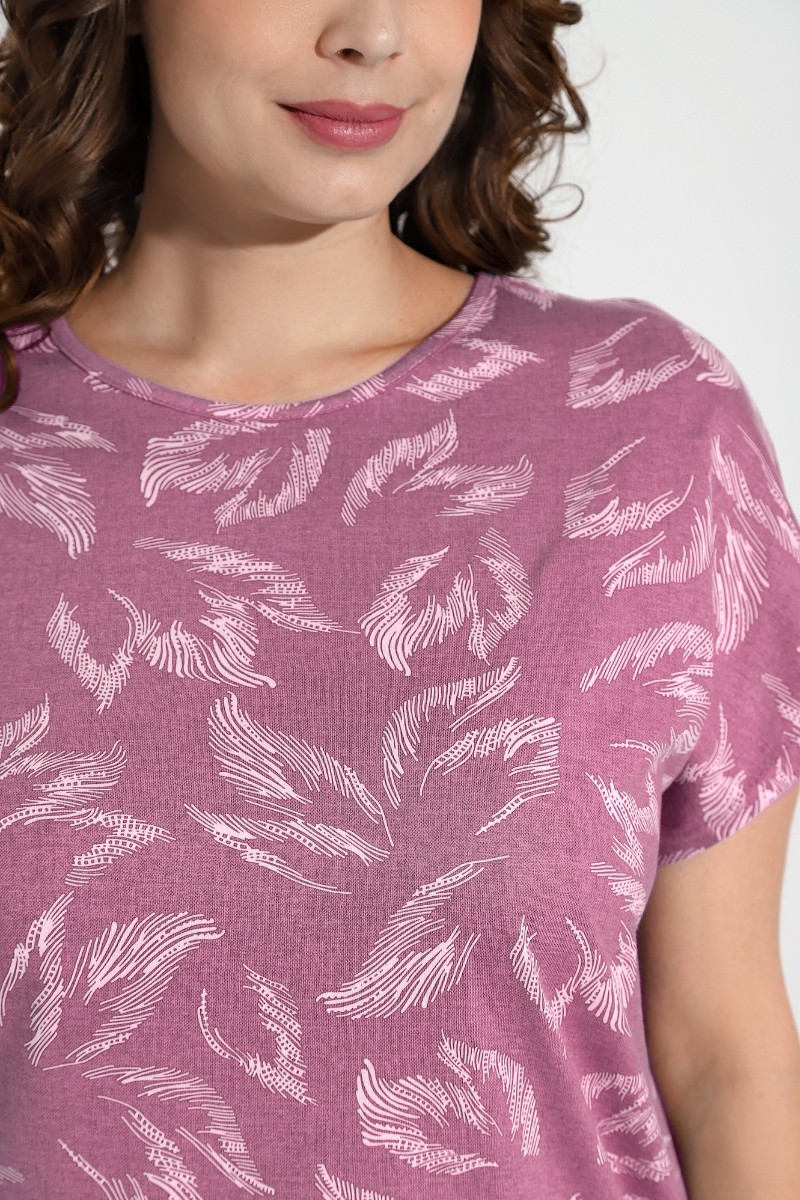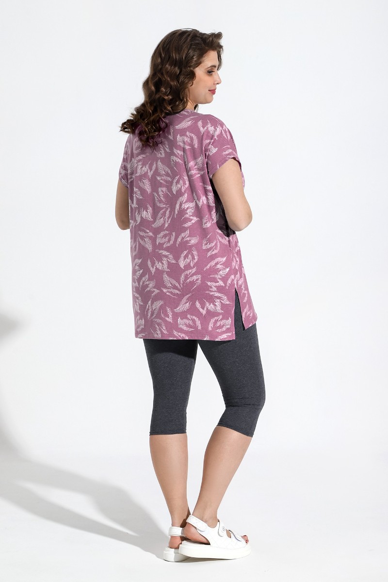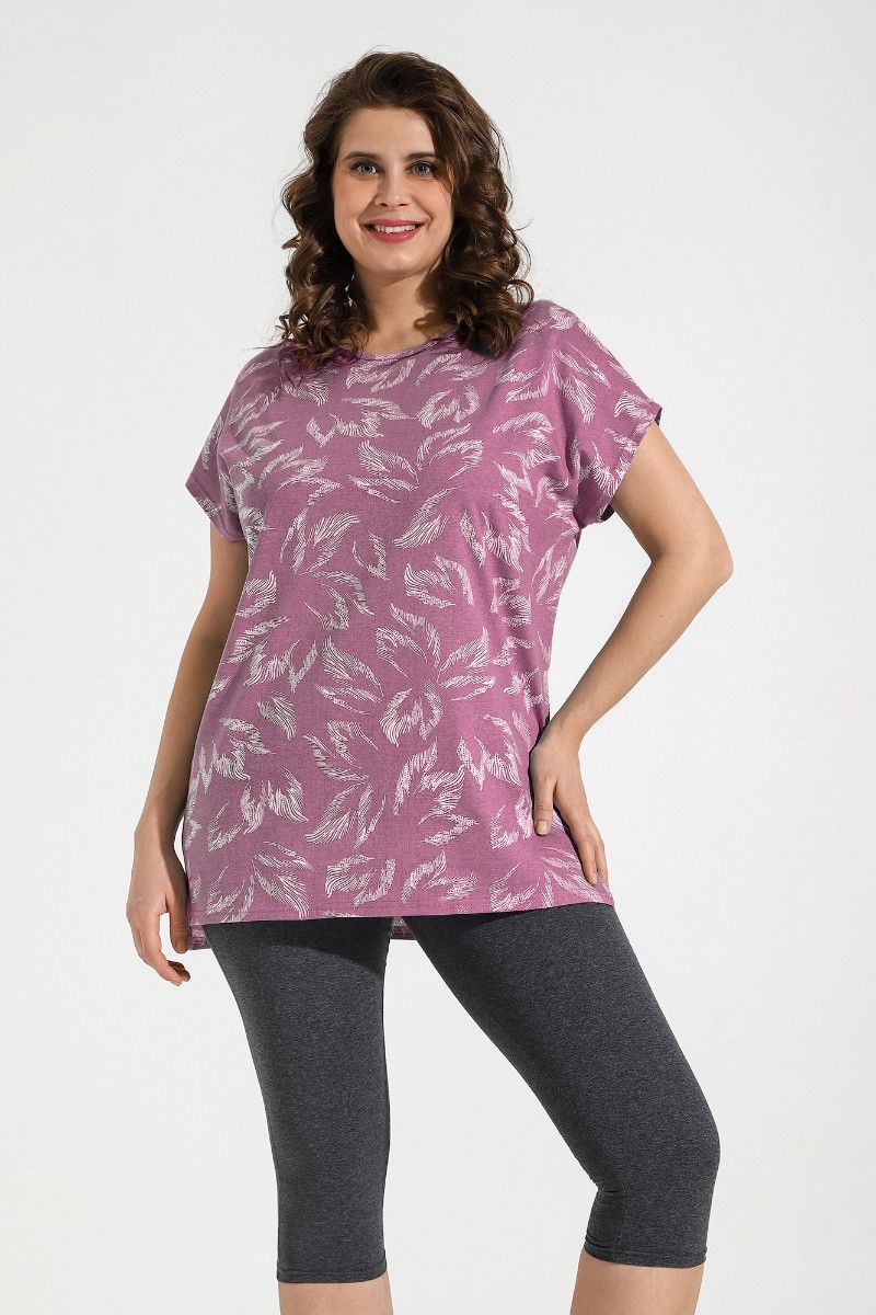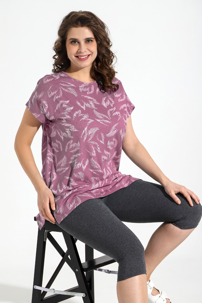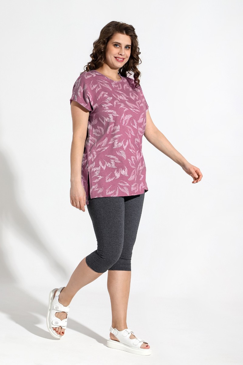 Представляем Вашему вниманию костюм из трикотажного полотна «кулирка» в комбинации двух видов: гладкокрашеного «меланжированного» и с набивным рисунком, состоящий из футболки и бридж.Футболка – из полотна с набивным рисунком, с короткими цельнокроеными рукавами, горловиной овальной формы, окантованной основным материалом и разрезами по боковым швам. Бриджи-велосипедки – из «меланжированного» полотна, классического покроя, с эластичной тесьмой по талии.