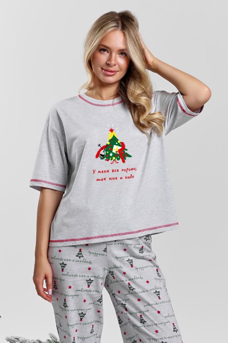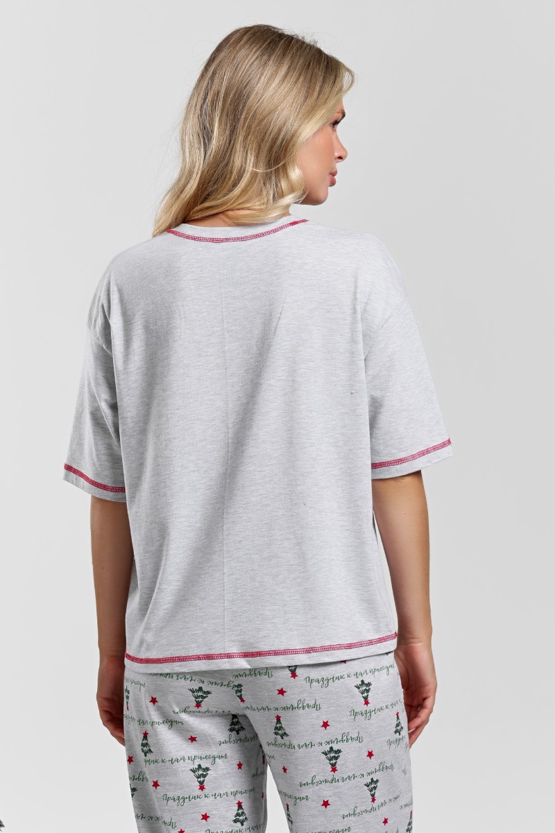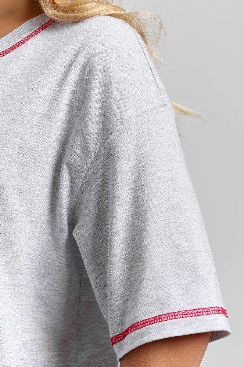 Представляем Вашему вниманию костюм женский из трикотажного полотна "кулирка" в комбинации двух видов: гладкокрашенного красного цвета и с набивным тематическим рисунком на сером фоне , состоящий из футболки и брюк. Футболка - модного силуэта, слегка укороченная свободного покроя, с приспущенным плечом, с втачными рукавами длиной до локтя, горловиной овальной формы, обработанной втачной планкой и принтом в центре переда. По шву втачивания планки настрочена декоративная (5-ниточная) отделочная строчка нитками контрастного цвета Подгибка низа рукавов и изделия так же выполнена с применением декоративной отделочной строчки. Брюки выполнены из полотна с набивным тематическим рисунком, длинные, умеренной ширины, прямые, с эластичной тесьмой по талии.