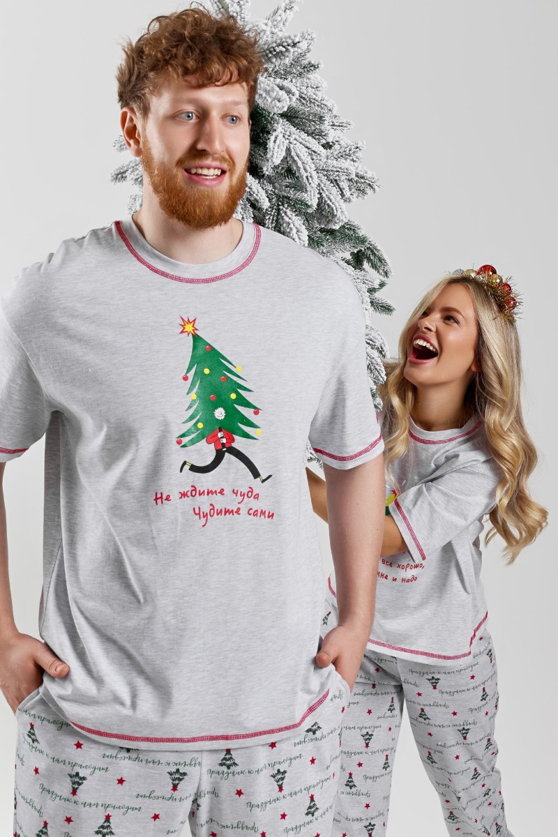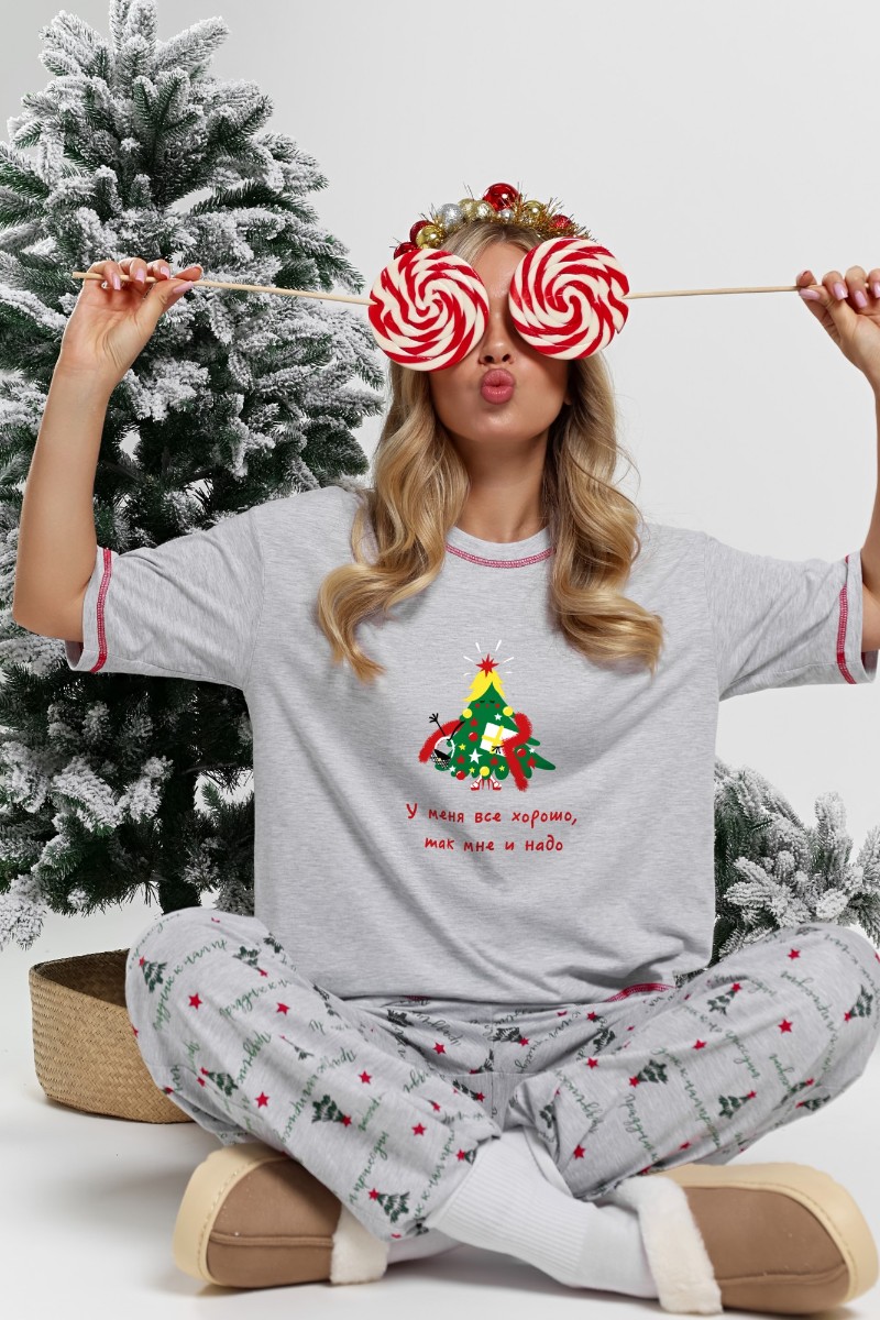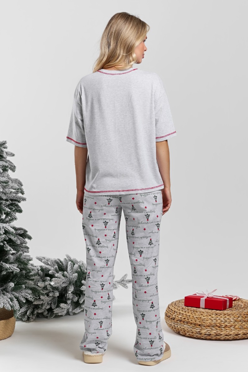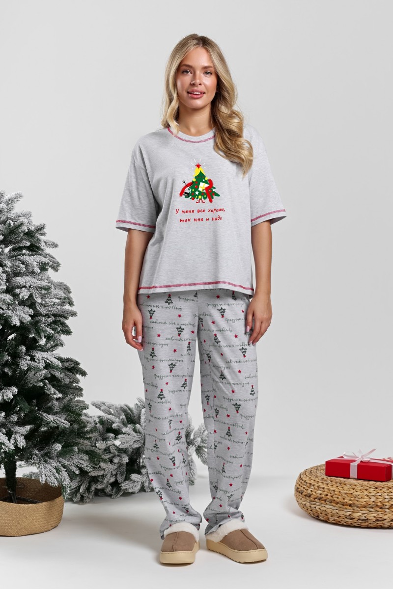 Представляем Вашему вниманию костюм женский из трикотажного полотна "кулирка" в комбинации двух видов: гладкокрашенного красного цвета и с набивным тематическим рисунком на сером фоне , состоящий из футболки и брюк. Футболка - модного силуэта, слегка укороченная свободного покроя, с приспущенным плечом, с втачными рукавами длиной до локтя, горловиной овальной формы, обработанной втачной планкой и принтом в центре переда. По шву втачивания планки настрочена декоративная (5-ниточная) отделочная строчка нитками контрастного цвета Подгибка низа рукавов и изделия так же выполнена с применением декоративной отделочной строчки. Брюки выполнены из полотна с набивным тематическим рисунком, длинные, умеренной ширины, прямые, с эластичной тесьмой по талии.