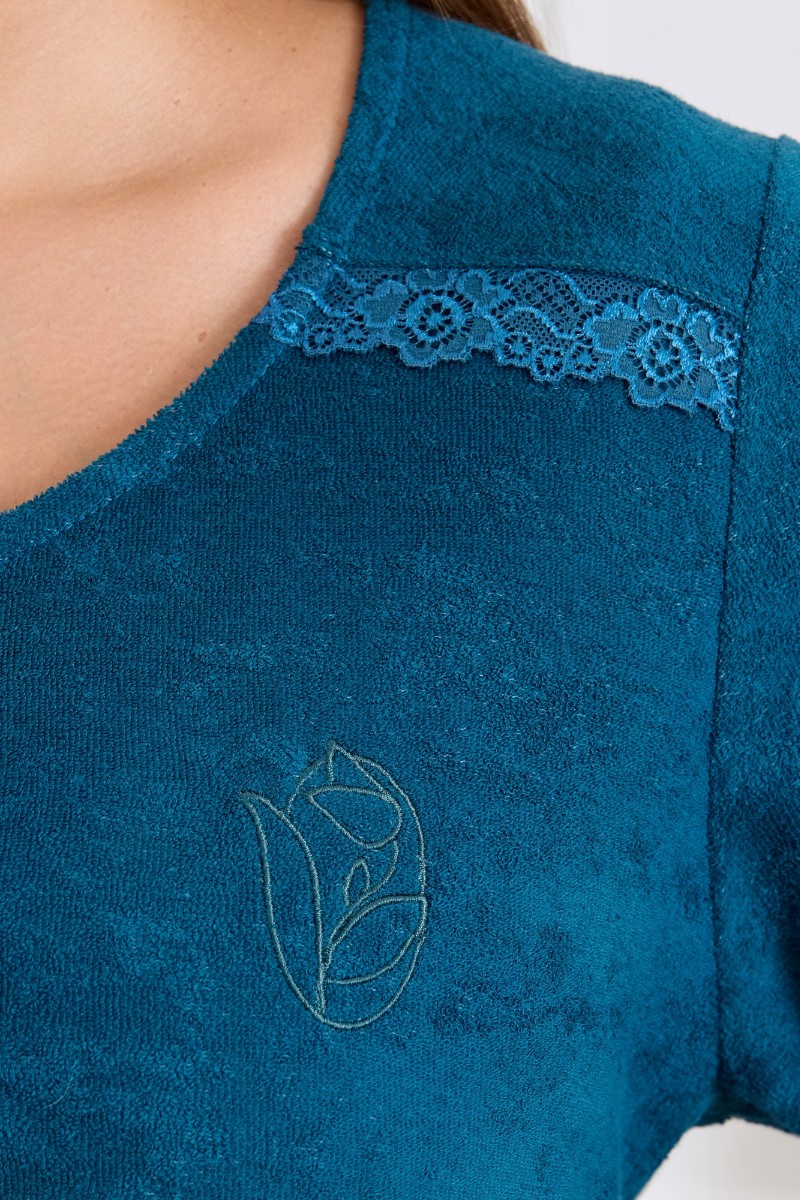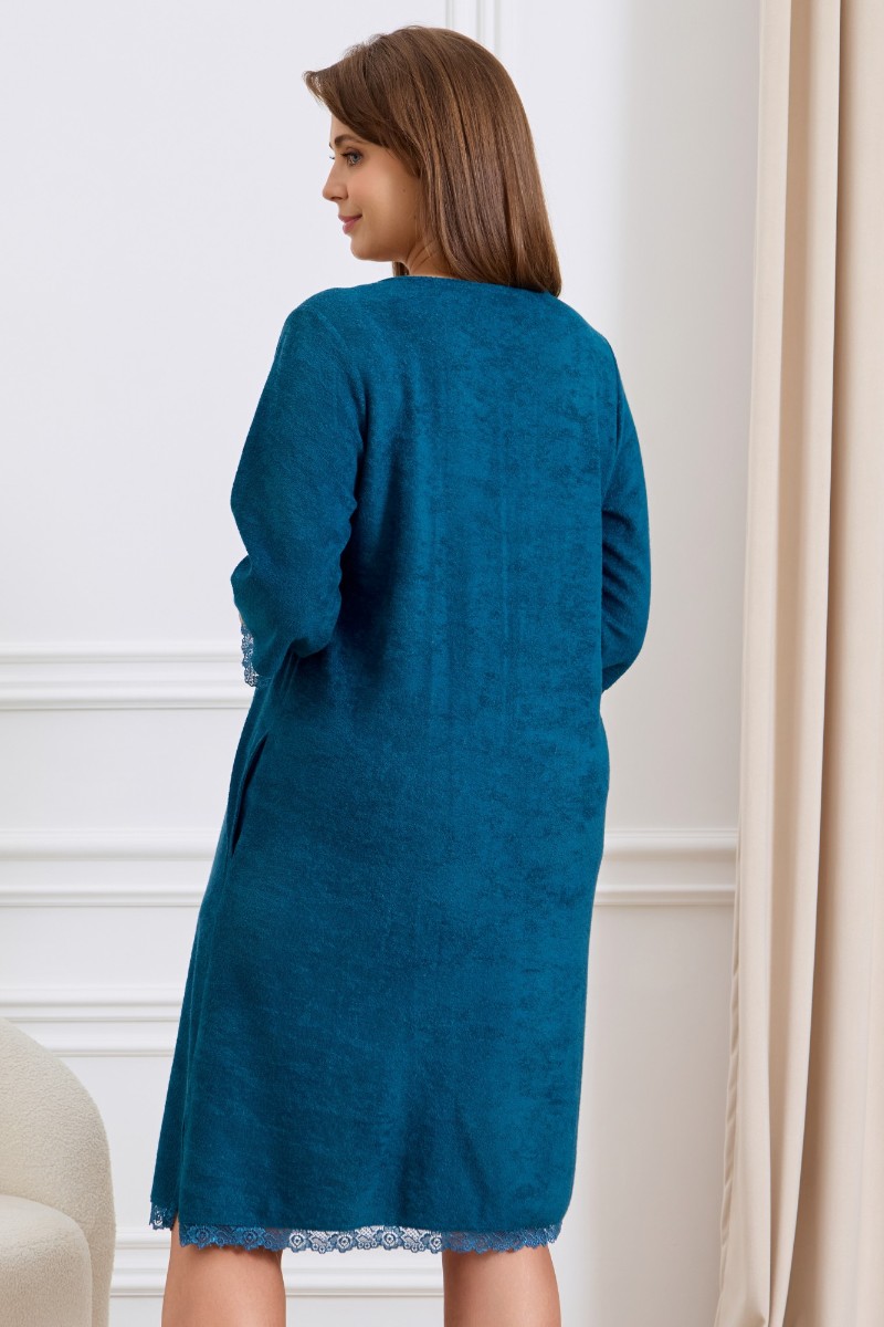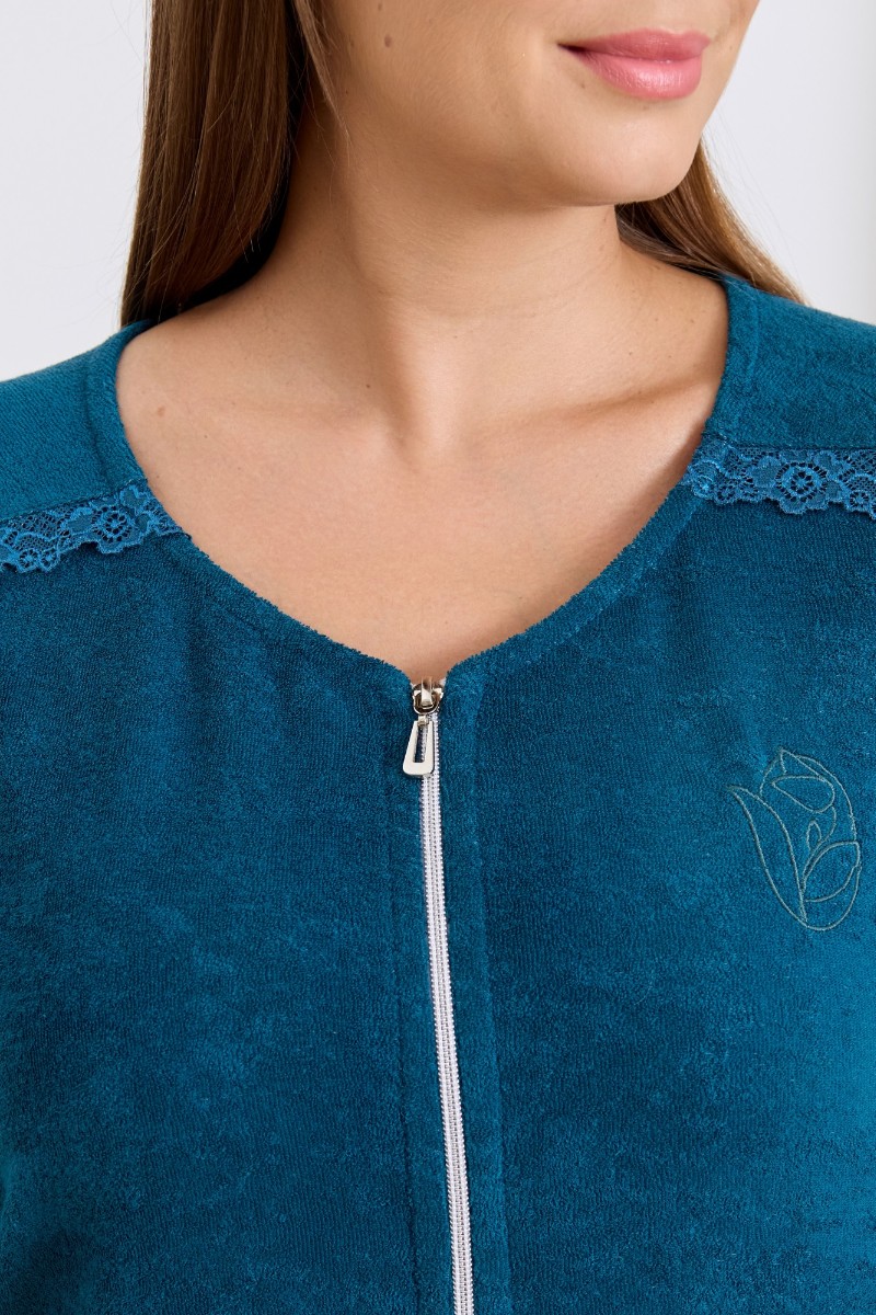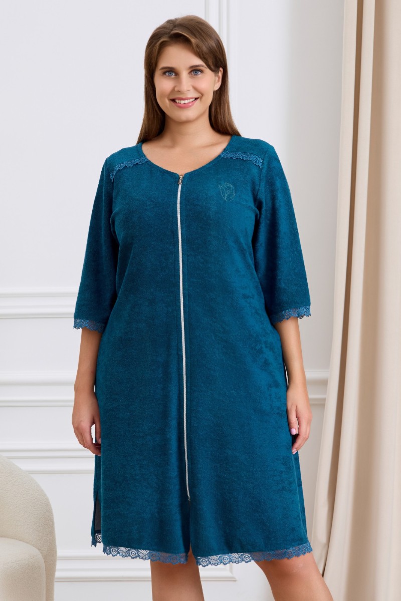 Представляем Вашему вниманию халат женский из гладкокрашенного трикотажного махрового полотна, прямого силуэта, с горловиной овальной формы, втачными рукавами длиной ¾ длины, карманами в боковых швах и центральной бортовой застежкой на тесьму «молния». Полочка – с двумя небольшими косыми кокетками с кружевом в швах соединения кокеток с основными деталями, на левой полочке выполнена вышивка. Нижние срезы рукавов и нижние срезы изделия обработаны кружевом, в боковых швах разрезы.