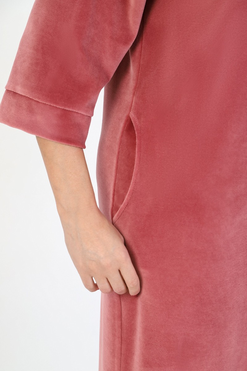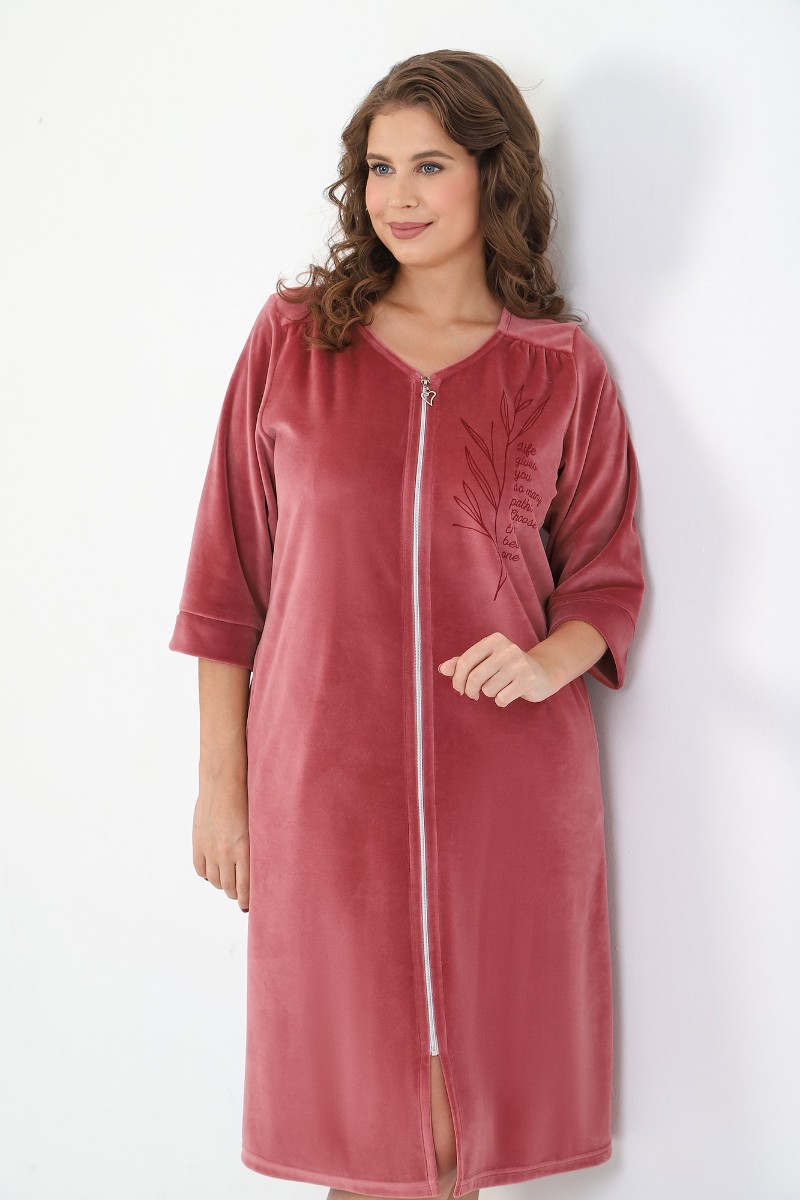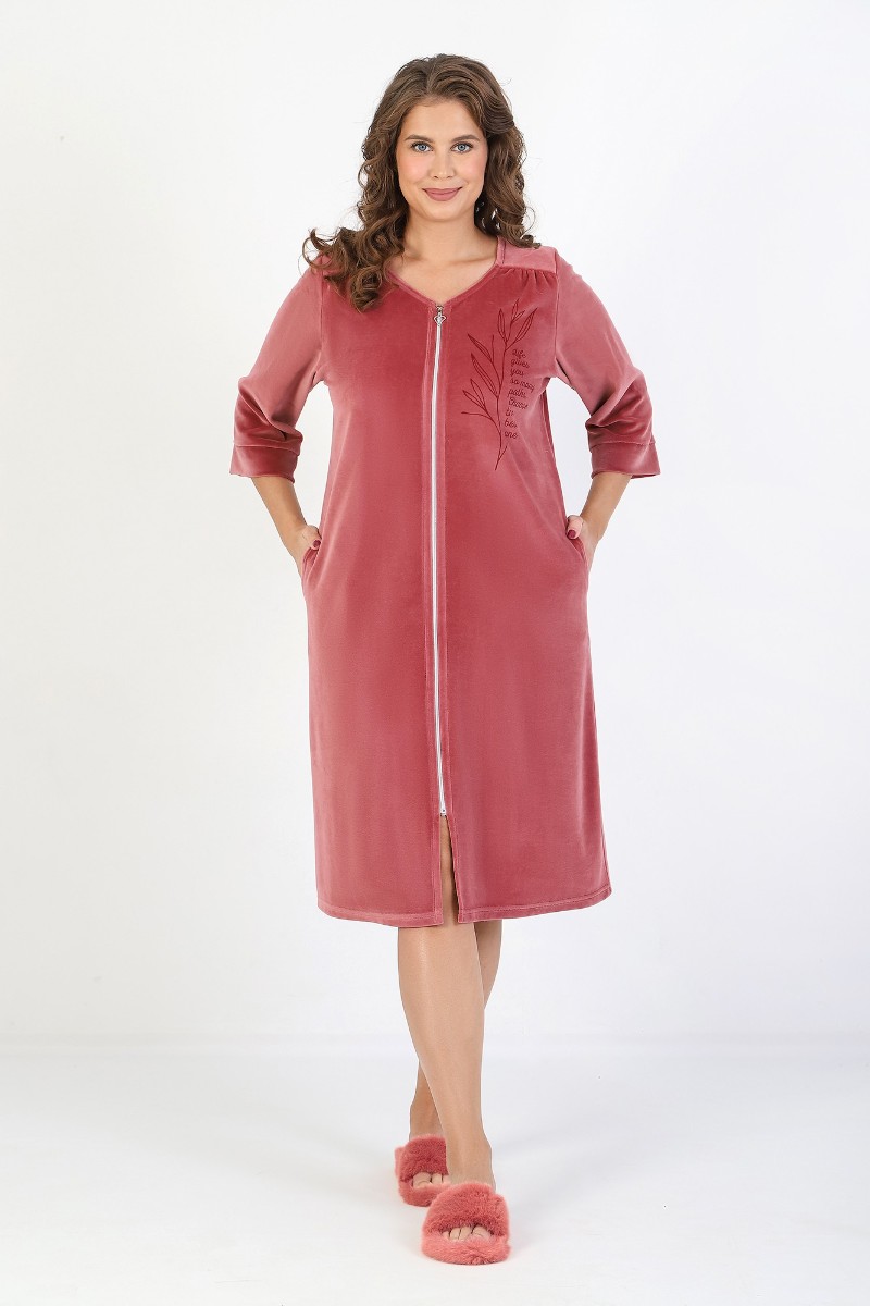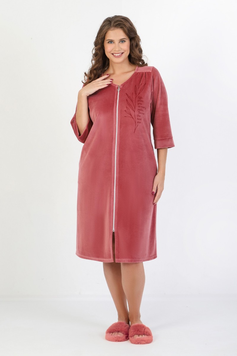 Представляем Вашему вниманию халат женский из гладкокрашеного полотна «велюр», слегка расширенный книзу, с втачными рукавами 3/4 длины, карманами в боковых швах, горловиной V-образной формы, центральной бортовой застежкой на тесьму «молния» и принтом на полочках, выполненным в технике «шелкографии». Плечевые швы изделия переходят на деталь переда, имитируя притачные кокетки со сборкой.