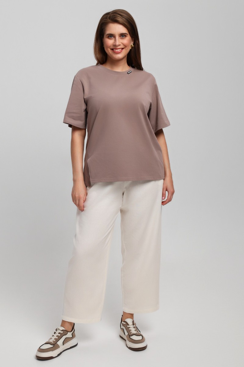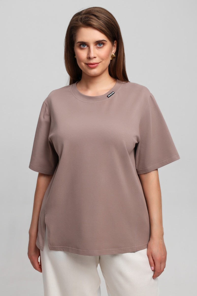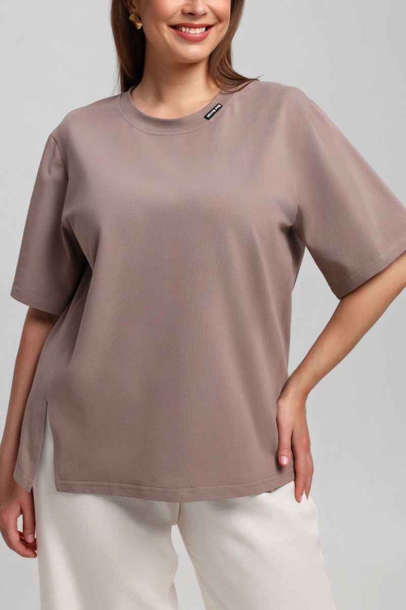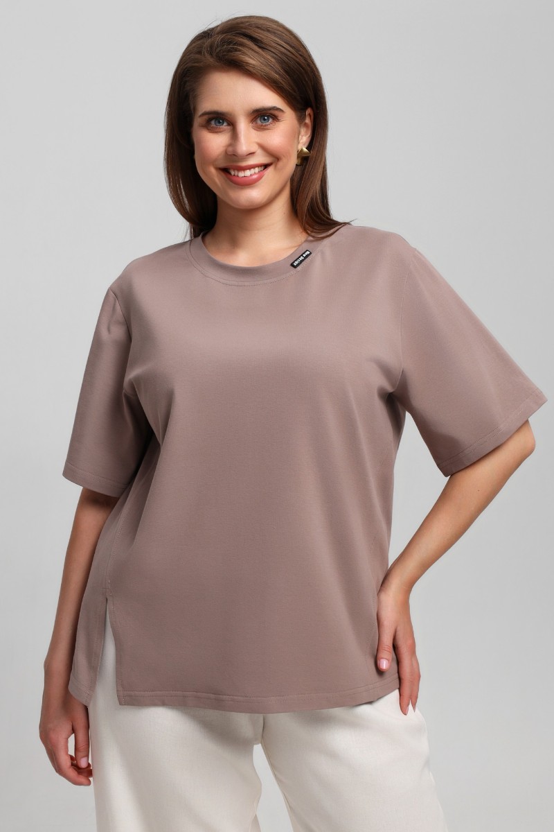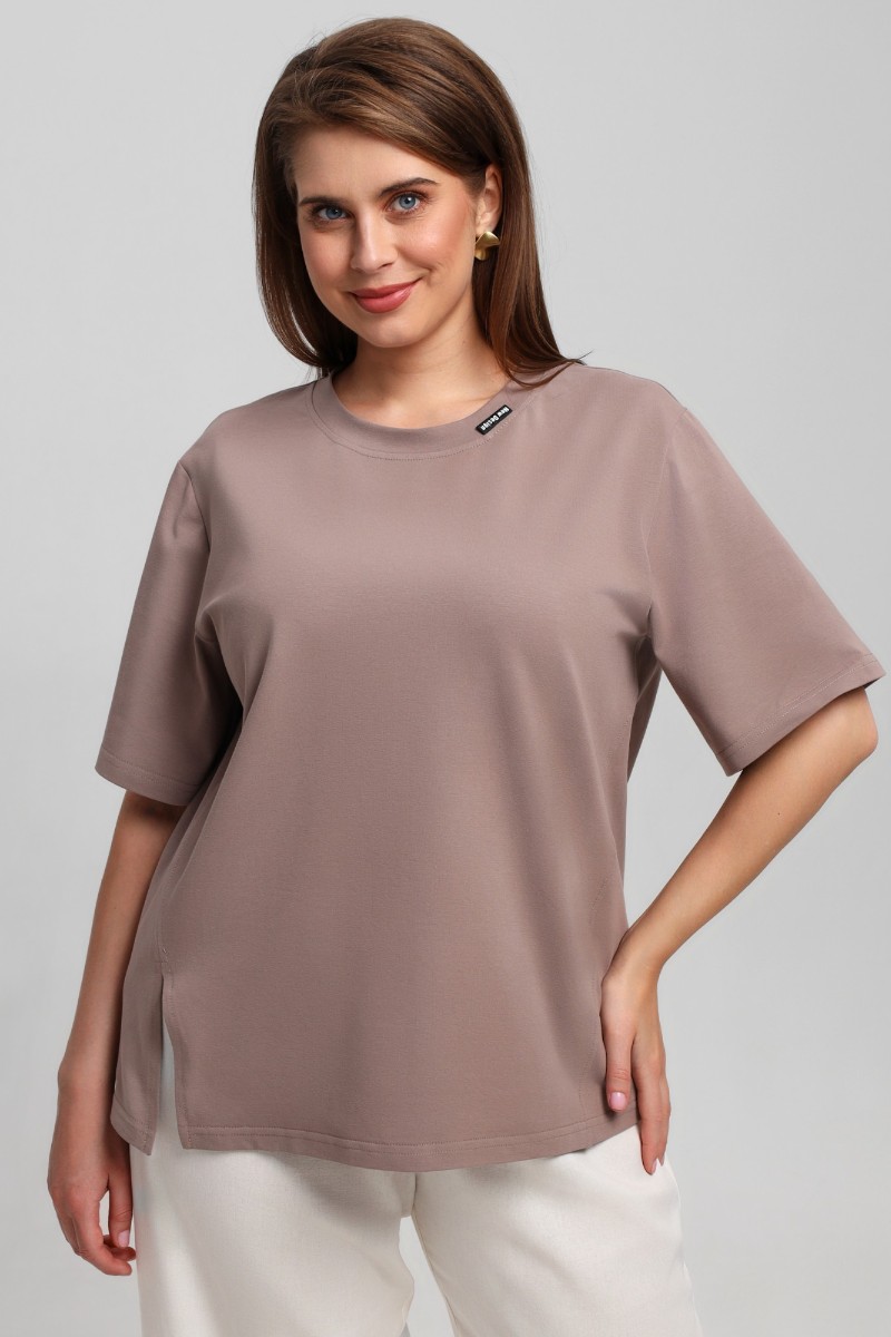 Представляем Вашему вниманию женскую футболку из гладкокрашенного трикотажного полотна «кулирка», свободного силуэта, с боковыми швами, переходящими в рельефы, в правом соединительном шве выполнен разрез. Горловина овальной формы обработана втачной планкой и дополнена декоративным элементом.