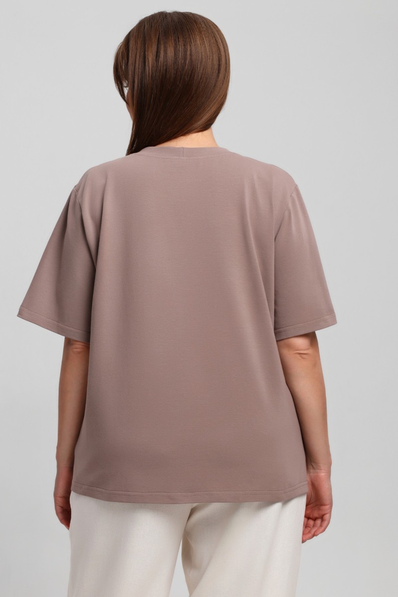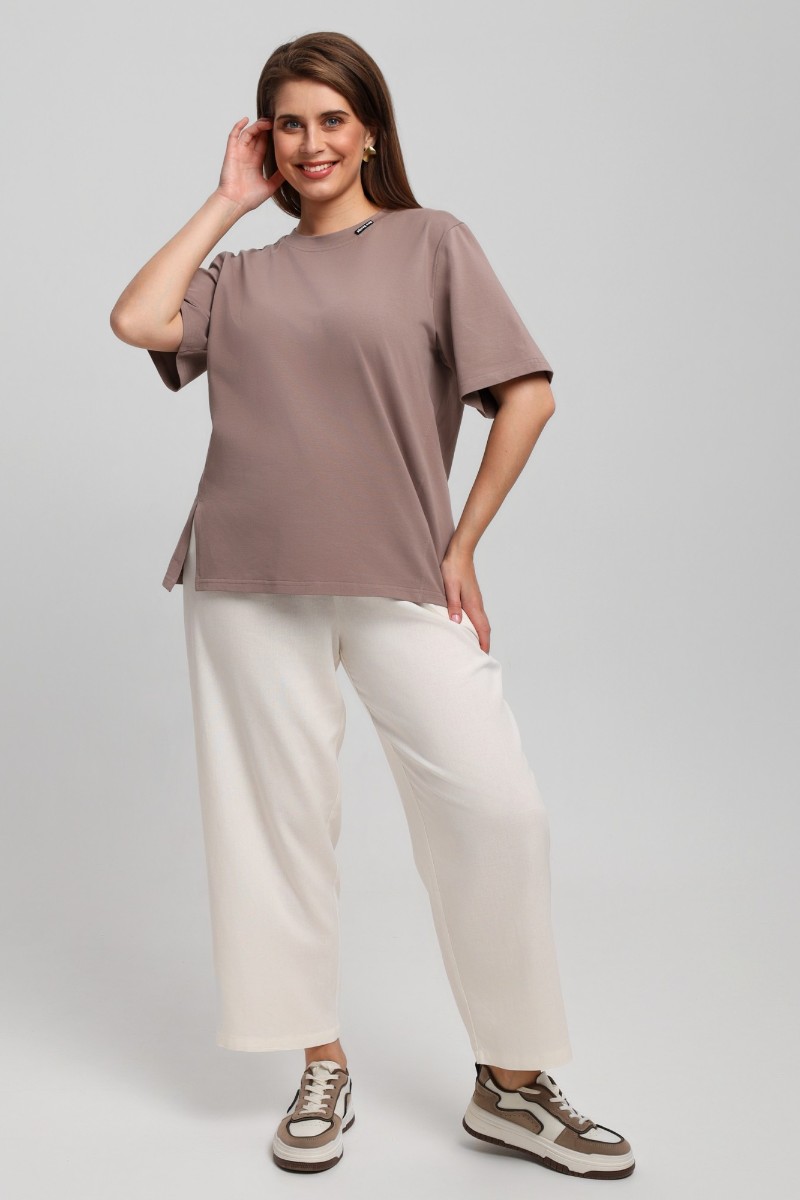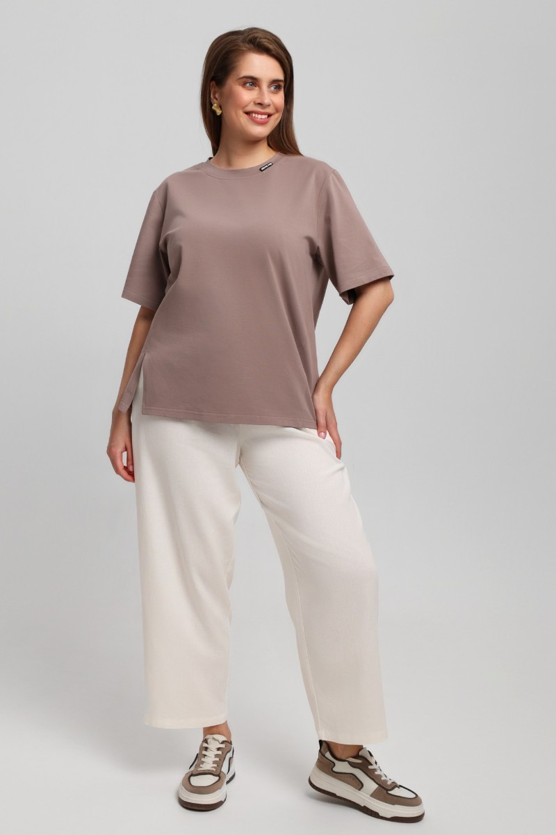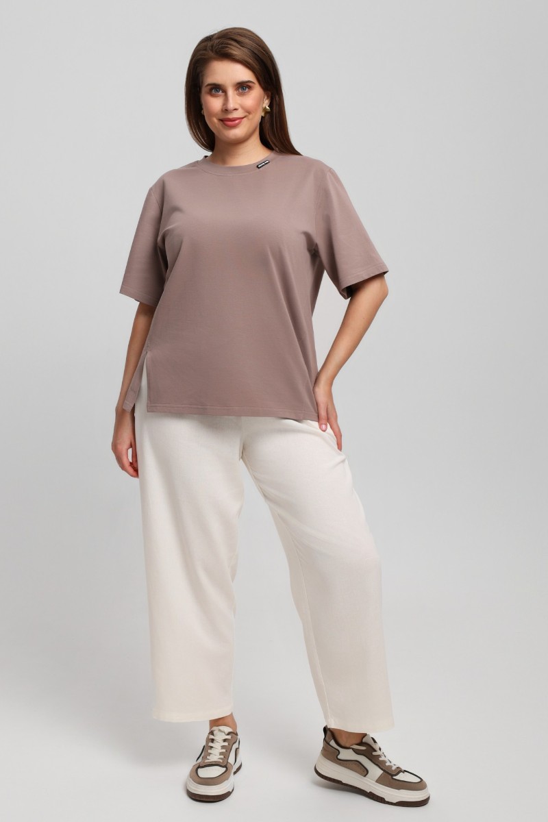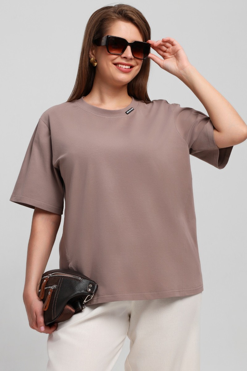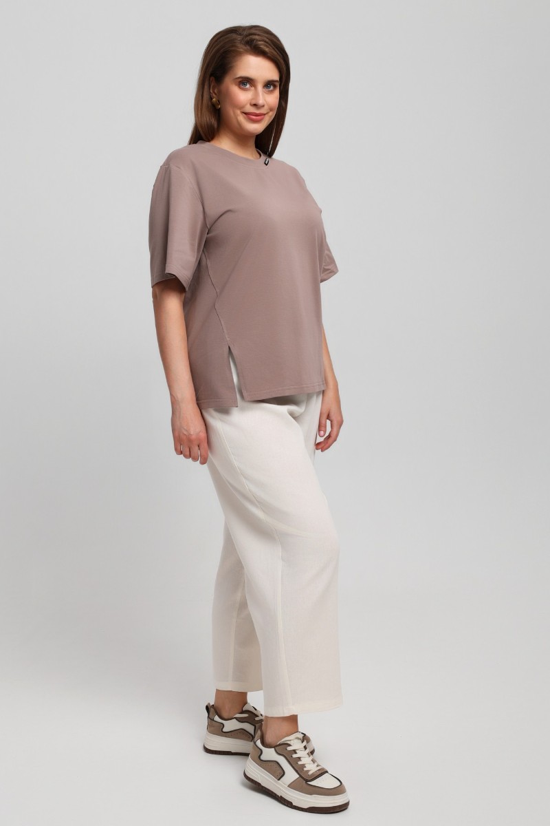 Представляем Вашему вниманию женскую футболку из гладкокрашенного трикотажного полотна «кулирка», свободного силуэта, с боковыми швами, переходящими в рельефы, в правом соединительном шве выполнен разрез. Горловина овальной формы обработана втачной планкой и дополнена декоративным элементом.