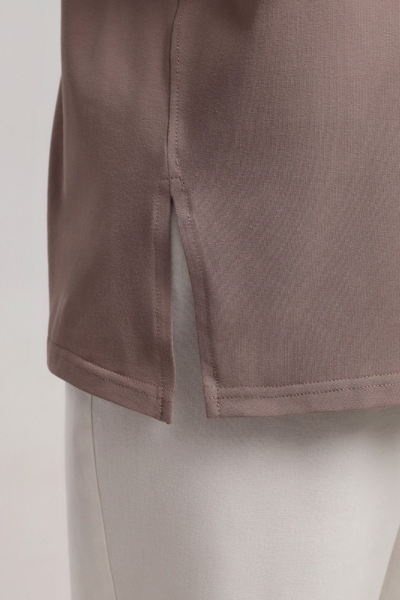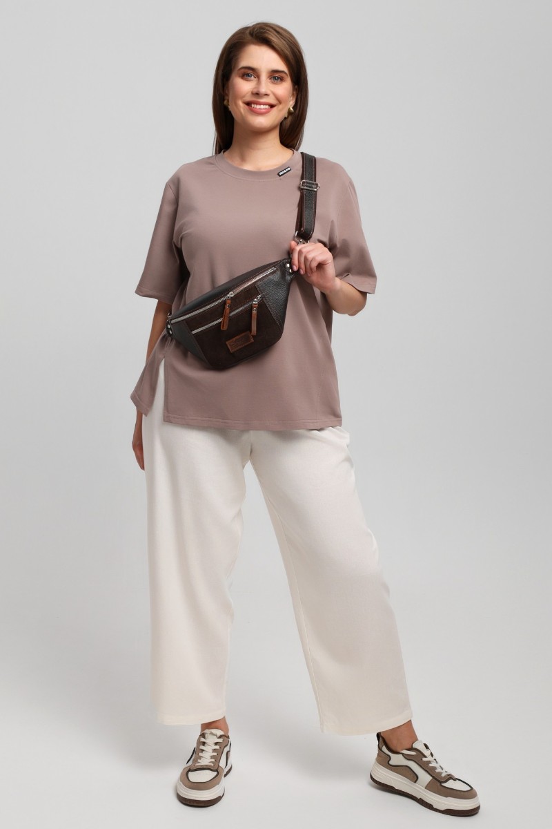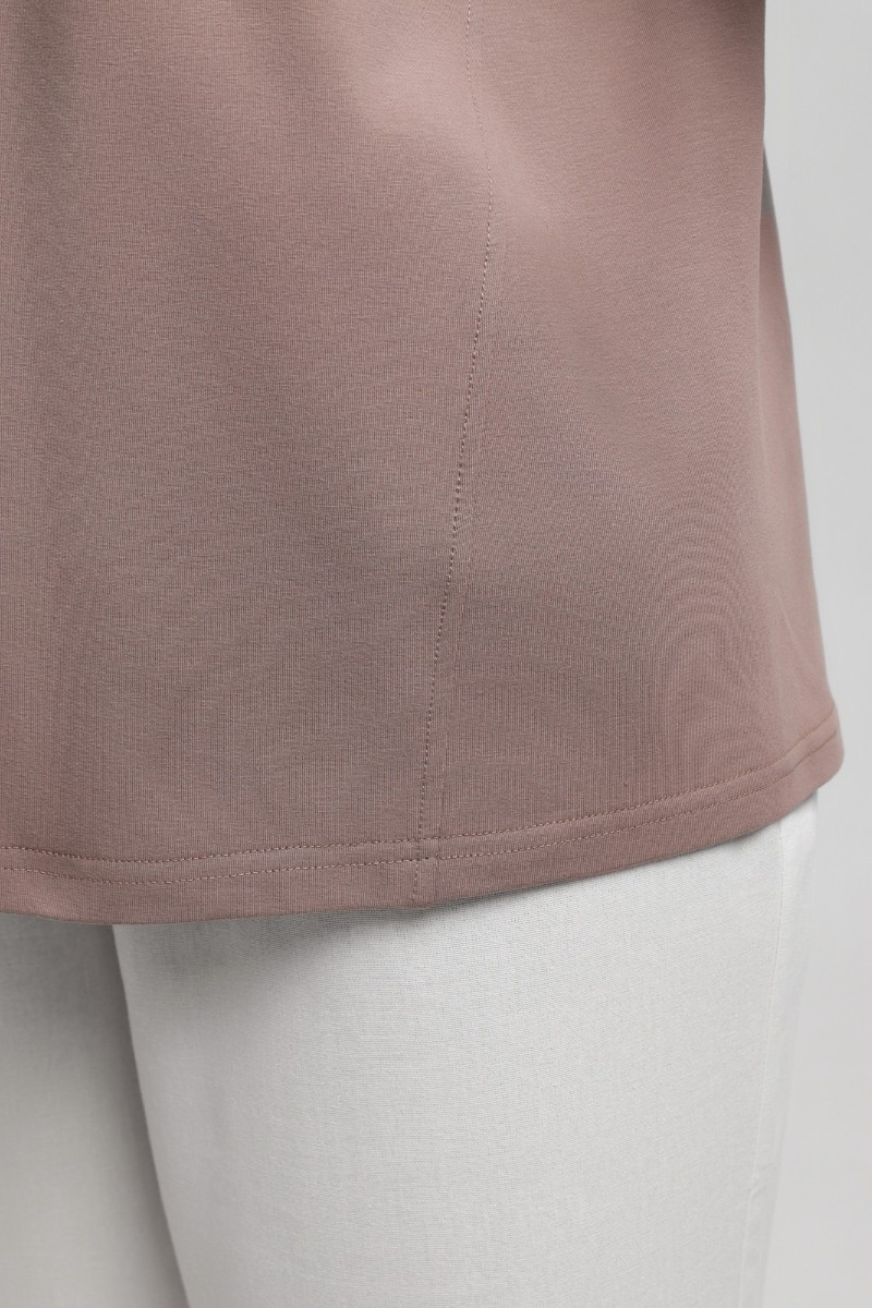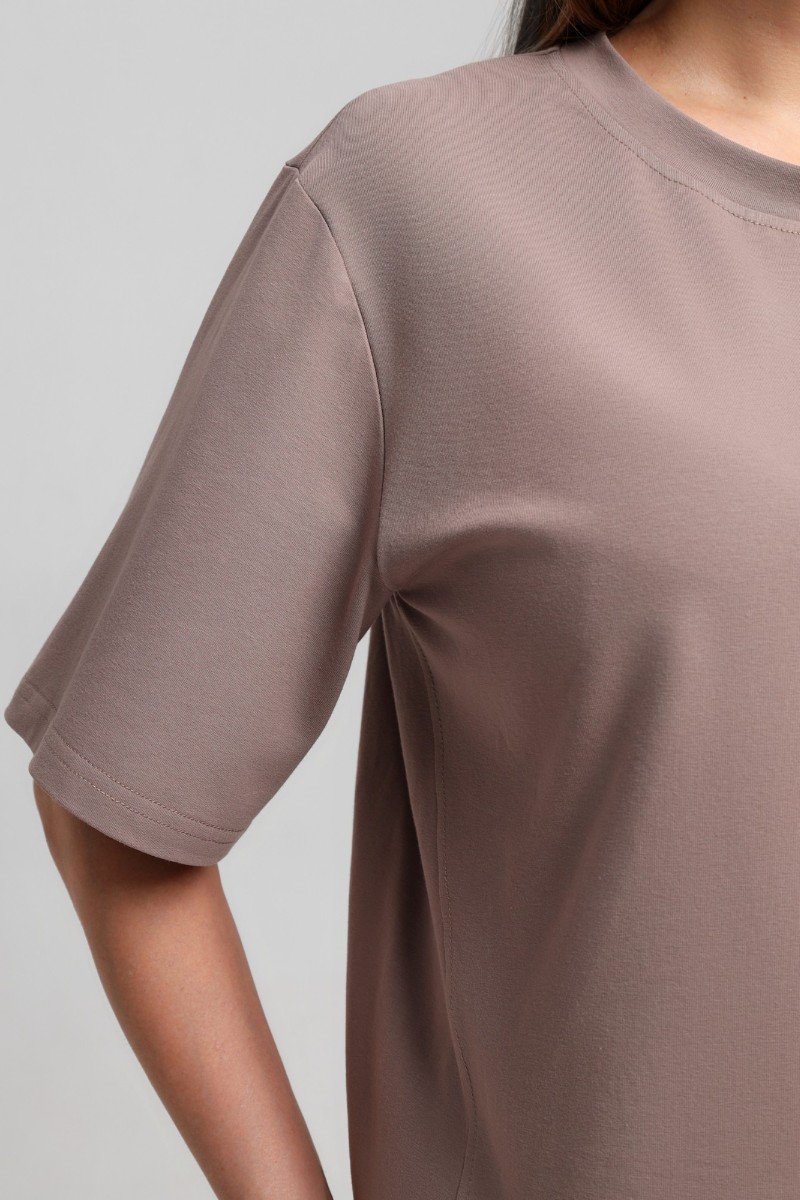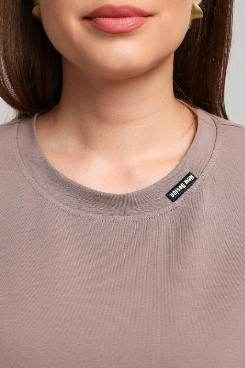 Представляем Вашему вниманию женскую футболку из гладкокрашенного трикотажного полотна «кулирка», свободного силуэта, с боковыми швами, переходящими в рельефы, в правом соединительном шве выполнен разрез. Горловина овальной формы обработана втачной планкой и дополнена декоративным элементом.