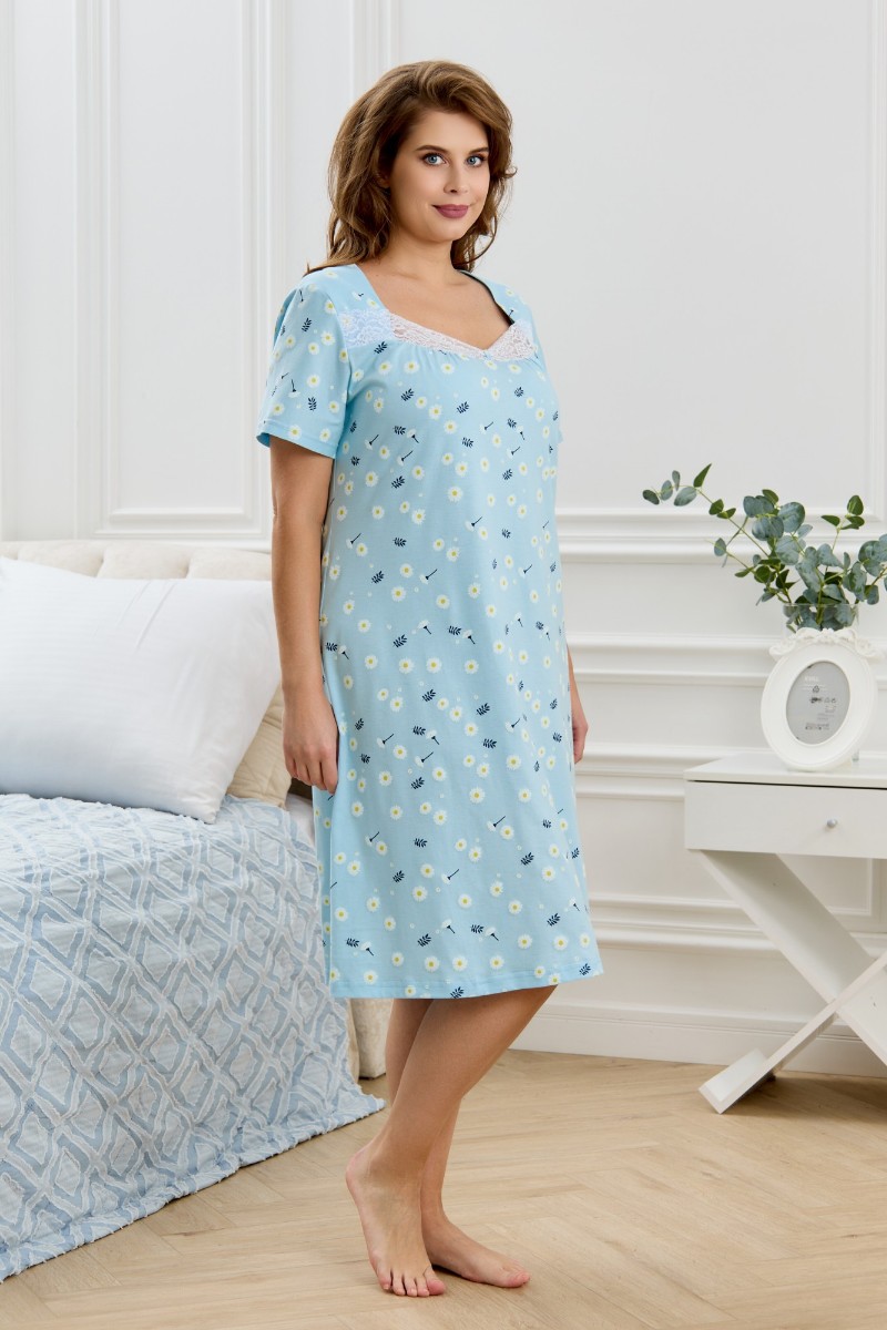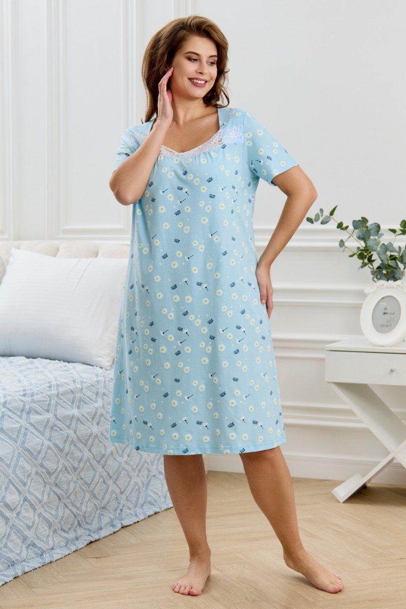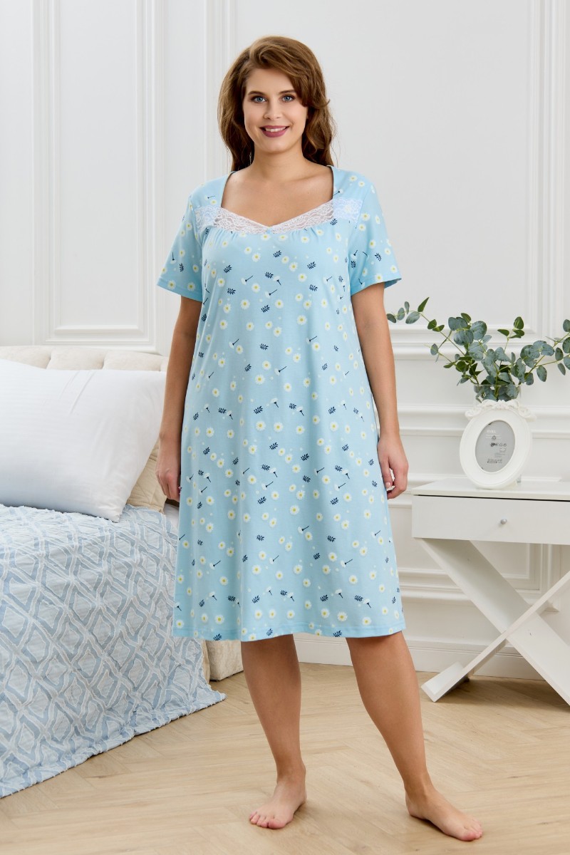 Представляем Вашему вниманию женскую сорочку из трикотажного полотна «кулирка» с набивным рисунком, свободного кроя, слегка расширенная книзу, с короткими втачными рукавами. Полочка – с двойными кокетками, кружевом в шве соединения кокеток с основной деталью и декоративной вставкой «петлей» для достижения небольшого эффекта драпировки. Основная деталь переда присборена по шву притачивания кокетки.