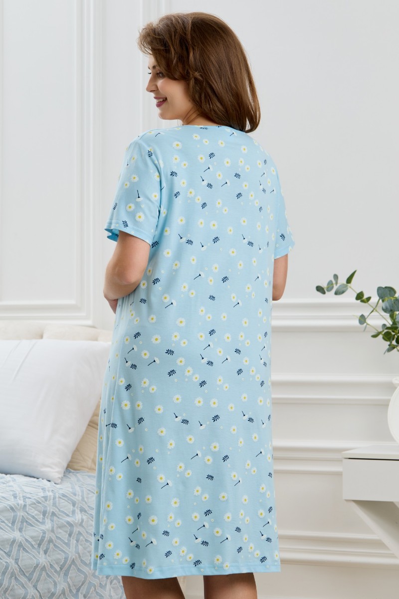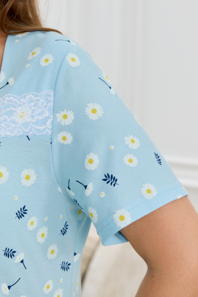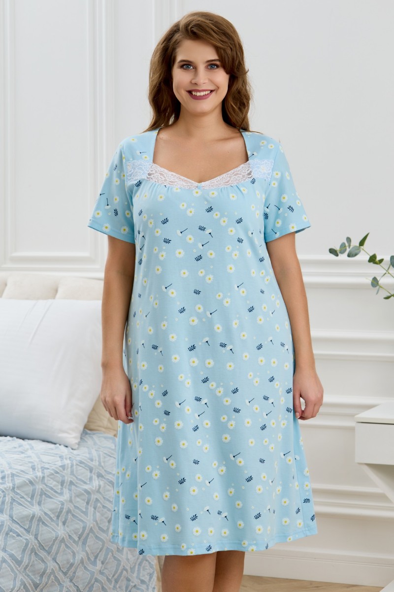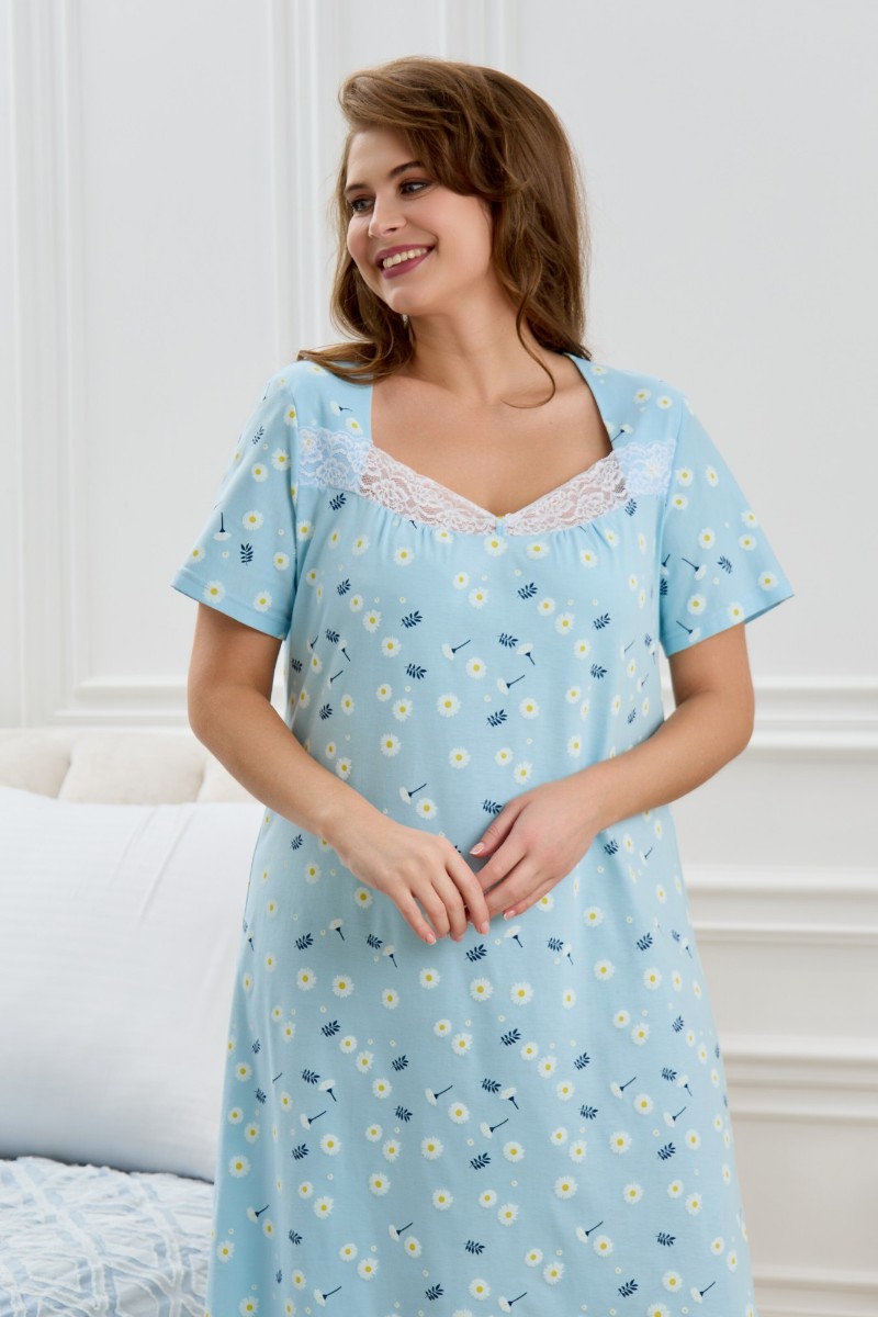 Представляем Вашему вниманию женскую сорочку из трикотажного полотна «кулирка» с набивным рисунком, свободного кроя, слегка расширенная книзу, с короткими втачными рукавами. Полочка – с двойными кокетками, кружевом в шве соединения кокеток с основной деталью и декоративной вставкой «петлей» для достижения небольшого эффекта драпировки. Основная деталь переда присборена по шву притачивания кокетки.