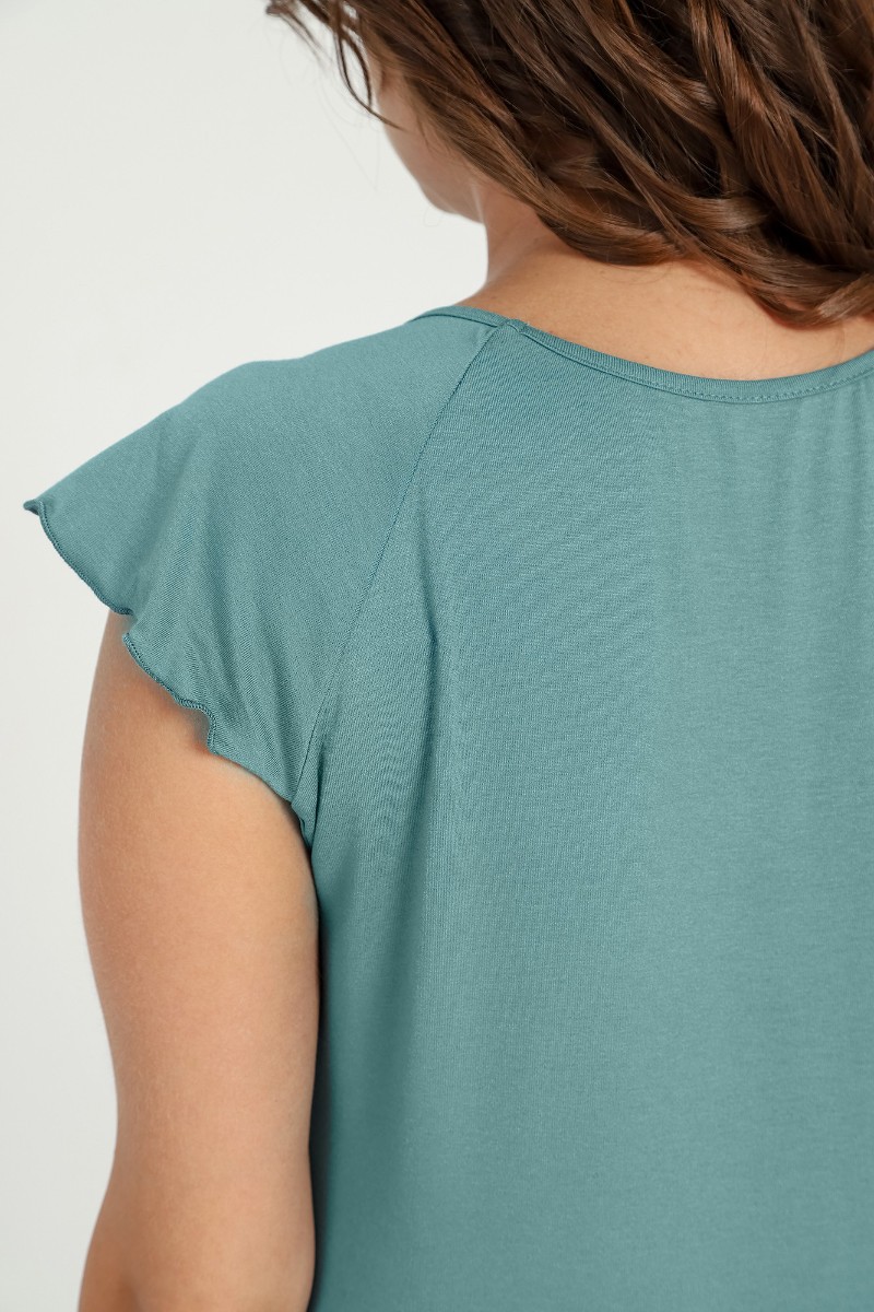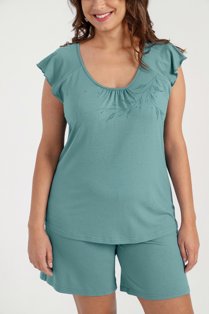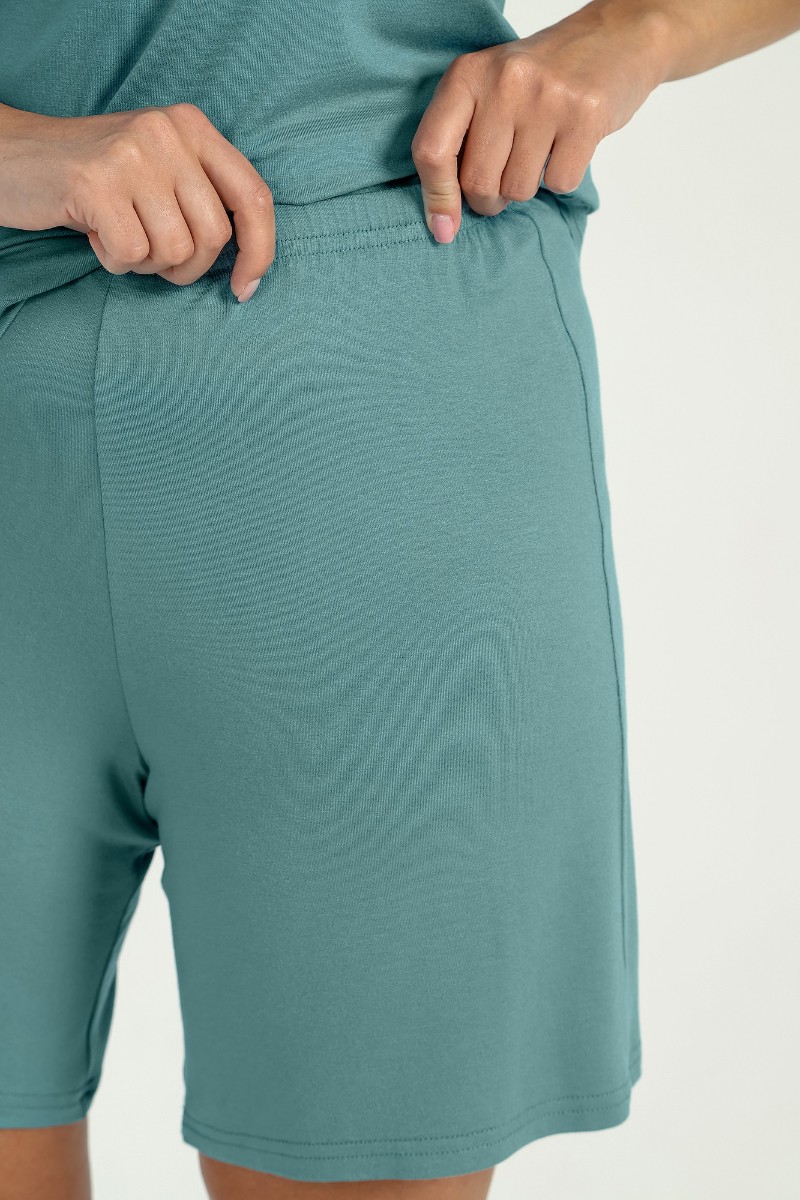 Представляем Вашему вниманию женскую пижаму из гладкокрашенного трикотажного вискозного полотна, состоящая из футболки и шорт. Футболка - слегка расширенная книзу, с короткими рукавами покроя «реглан» и горловиной овальной формы. Проймы и горловина окантованы основным материалом. По срезу горловины выполнена небольшая сборка. Нижние срезы рукавов обработаны узкой обметочной строчкой. Шорты – свободного покроя, удлиненные, с эластичной тесьмой по талии.
