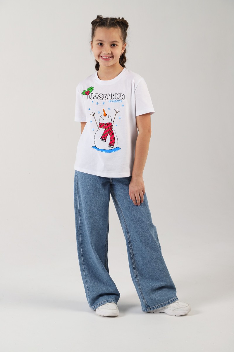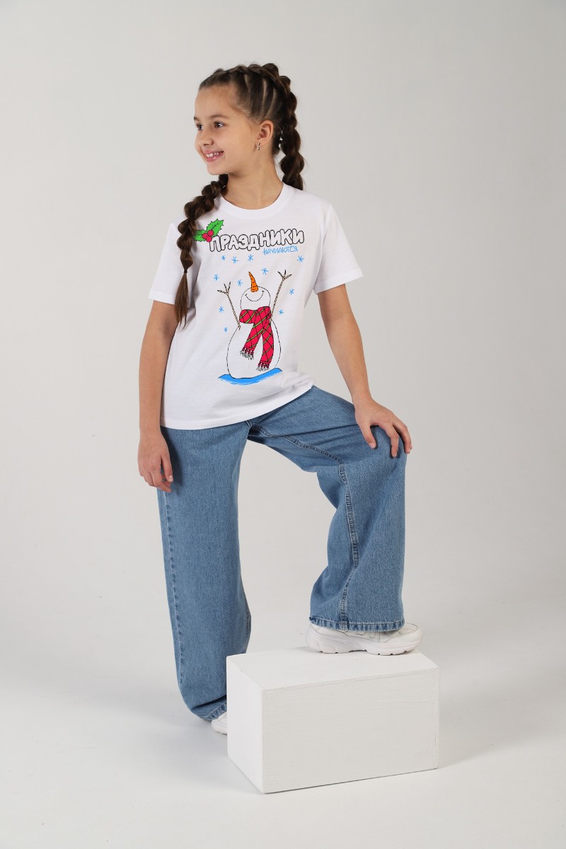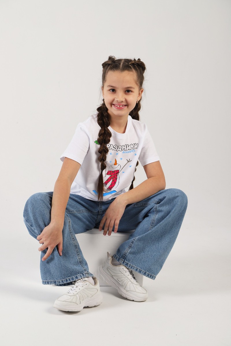 Представляем Вашему вниманию футболку для девочки классического покроя: с короткими втачными рукавами, горловиной овальной формы, обработанной втачной планкой, и принтом в центре переда, выполненным в технике шелкографии. По шву втачивания планки в горловину настрочена отделочная строчка на двухигольной машине. Нижние срезы рукавов и изделия обработаны подгибкой.