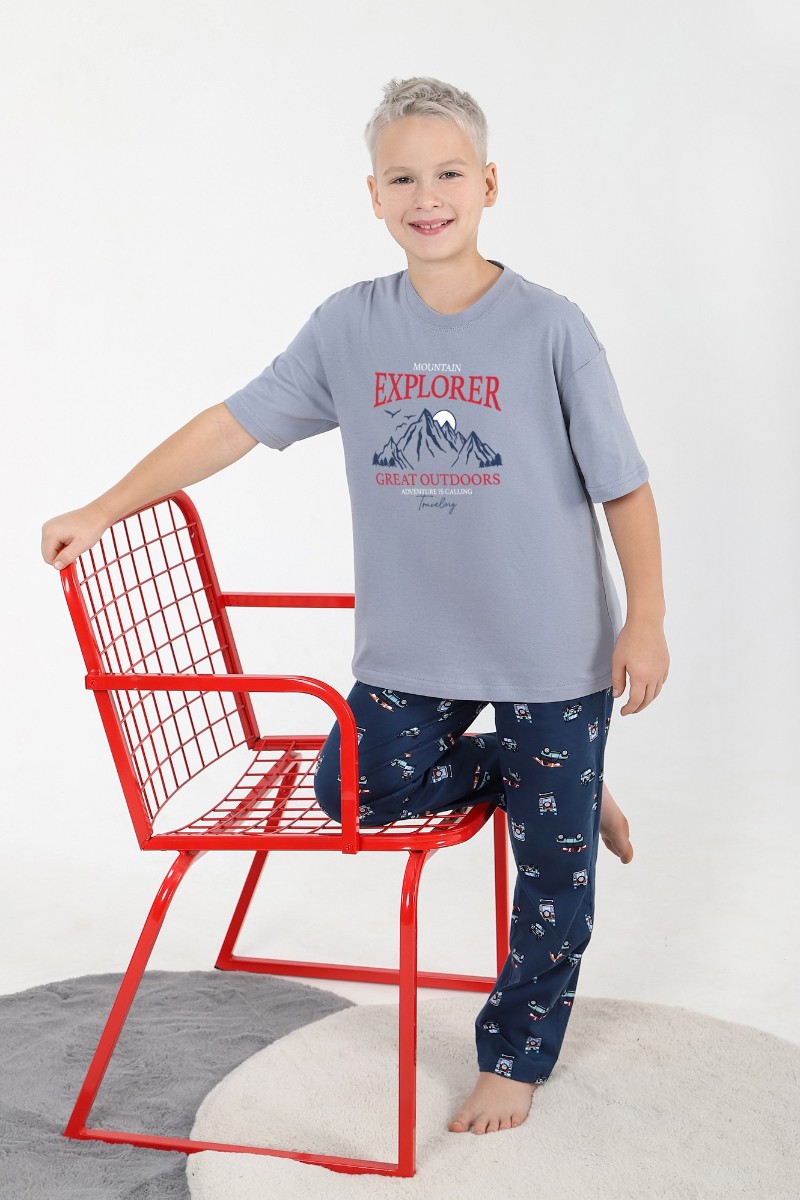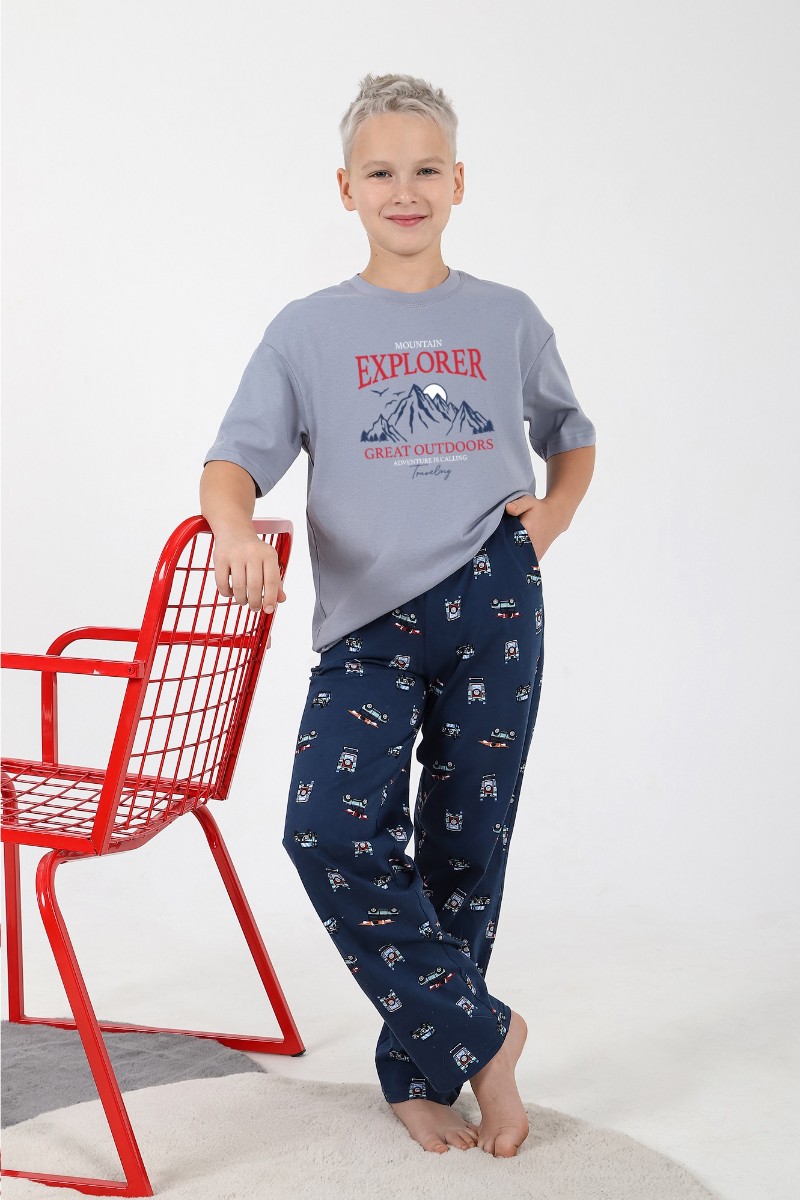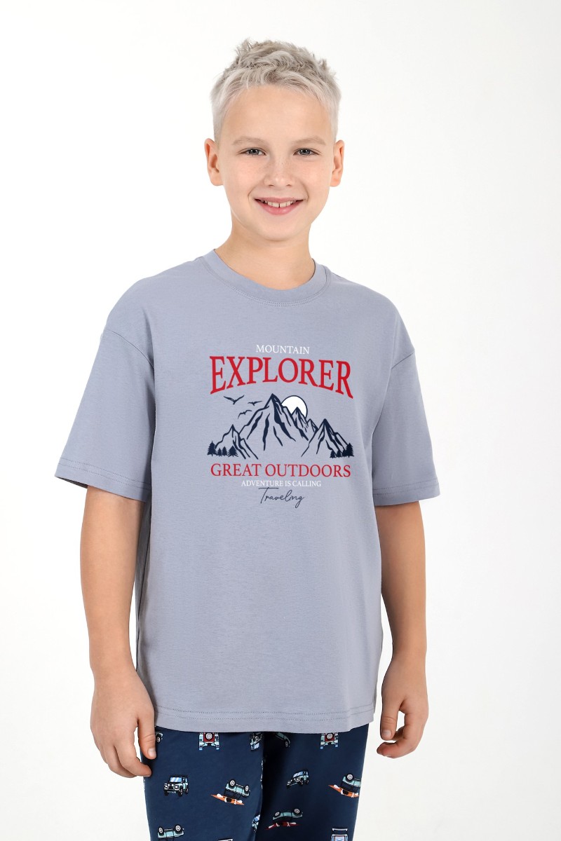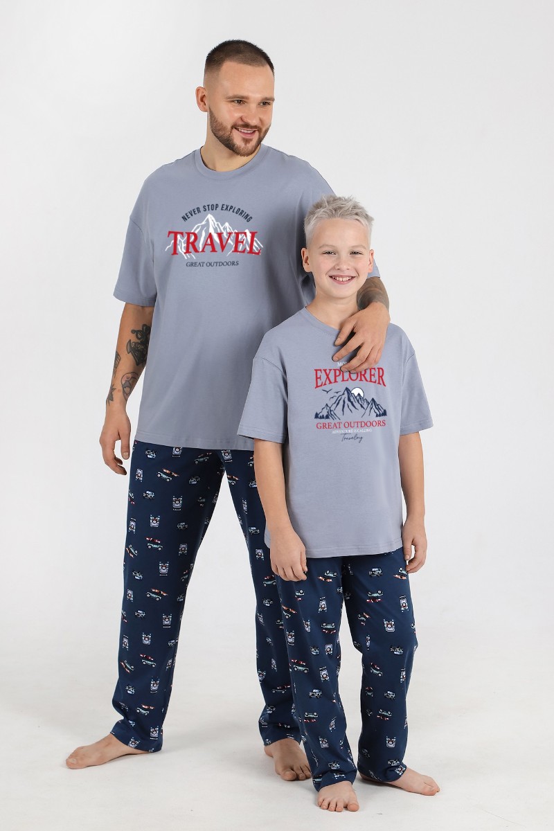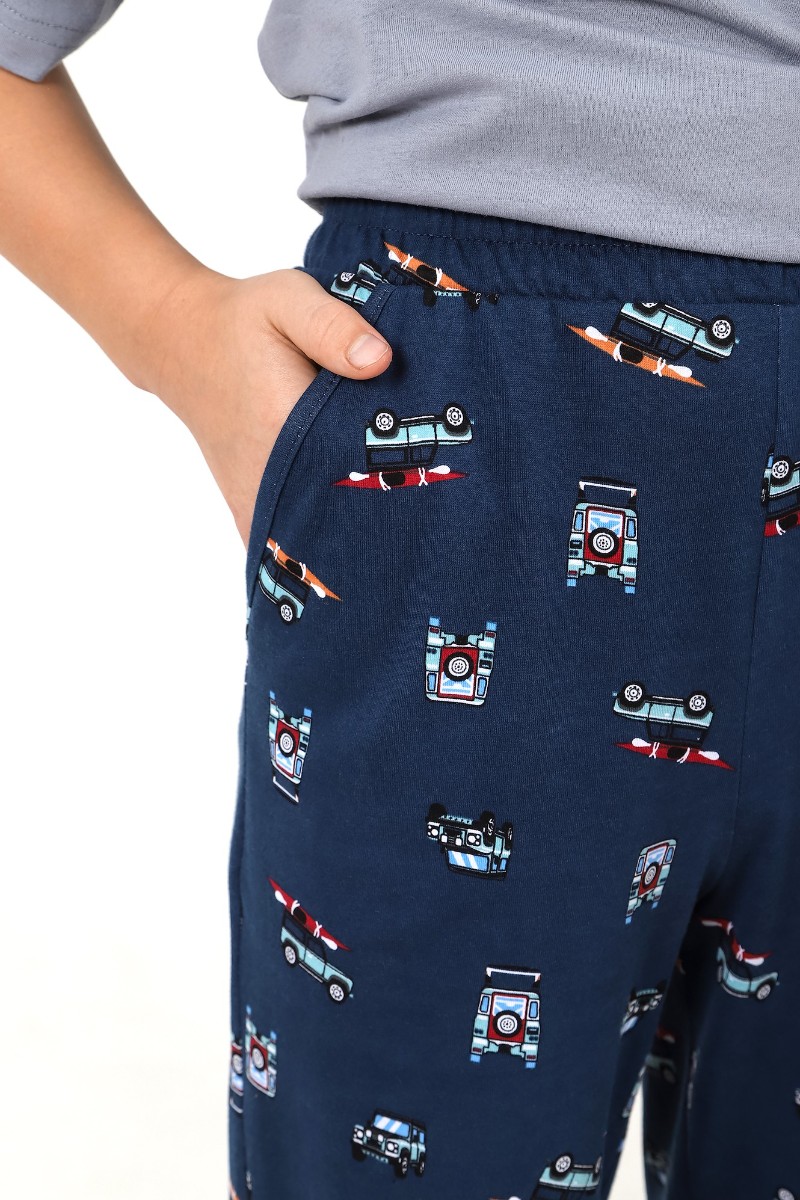 Представляем Вашему вниманию костюм для мальчика, состоящий из футболки и брюк. Футболка - из гладкокрашеного полотна "кулирка", классического покроя, с короткими втачными рукавами, горловиной овальной формы, обработанной втачной планкой, и принтом в центре переда, выполненным в технике шелкографии. Брюки - из полотна с набивным рисунком, прямого силуэта, на притачном поясе с эластичной тесьмой внутри и карманами в боковых швах, входы в которые окантованы основным материалом.