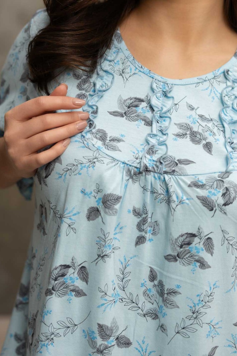 Представляем Вашему вниманию ночную женскую сорочку из хлопка. Модель длиной ниже колена, свободной силуэтной формы с коротким рукавом. Спереди кокетка с рюшем. В нашей сорочке Вы будете чувствовать себя комфортно во время сна.