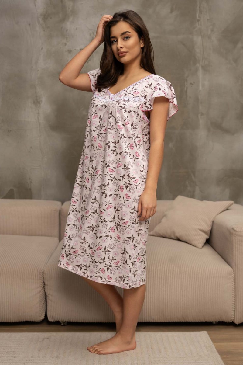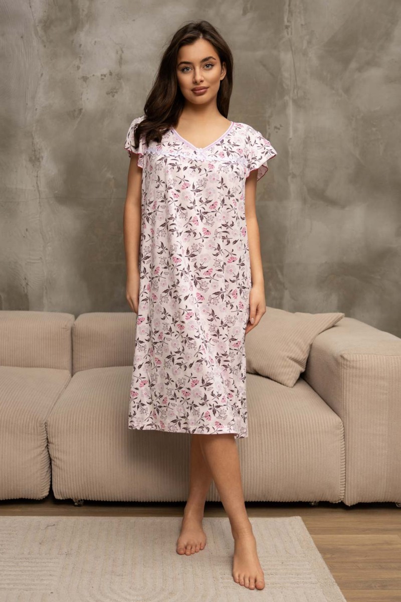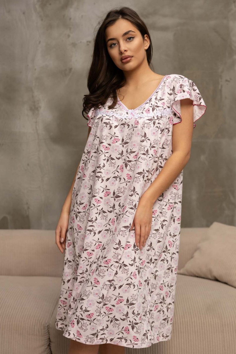 Представляем Вашему вниманию женскую ночную сорочку из хлопка, длиной ниже колена, с рукавом воланом и V-образной горловиной, украшена кружевом. Материал приятный к телу, обеспечивает комфорт во время сна.