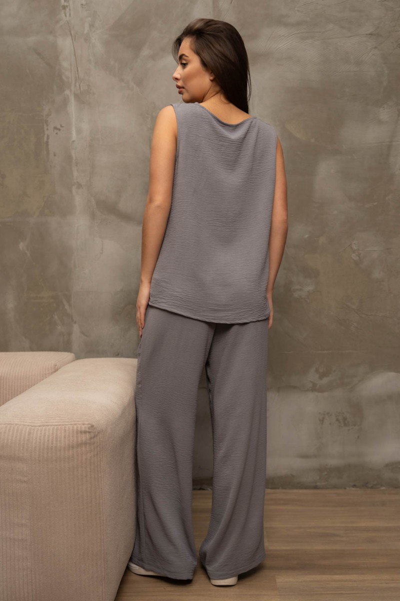 Представляем Вашему вниманию брючный костюм из легкого, воздушного материала с легким жатым эффектом. Майка с О-образной горловиной, до середины бедра. Брюки палаццо с карманами, поясом на резинке и несколькими декоративными строчками. Рост модели 167см.