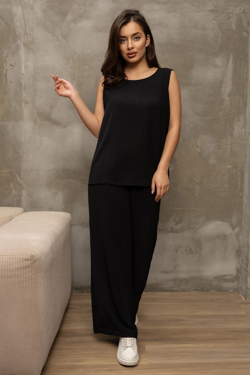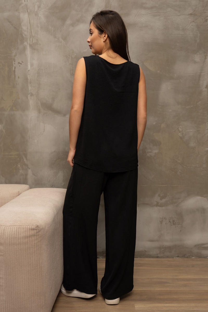 Представляем Вашему вниманию брючный костюм из легкого, воздушного материала с легким жатым эффектом. Майка с О-образной горловиной, до середины бедра. Брюки палаццо с карманами, поясом на резинке и несколькими декоративными строчками. Рост модели 167см.