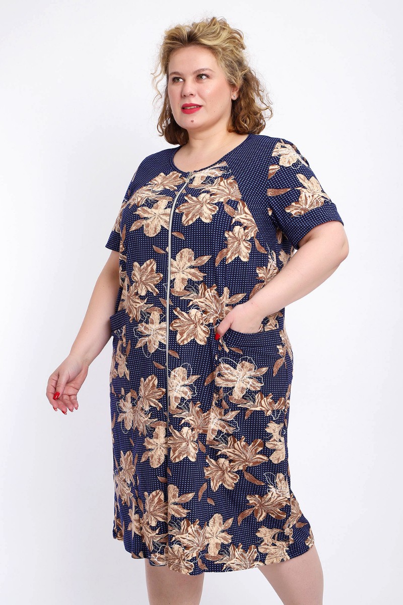 Представляем Вашему вниманию халат женский домашний больших размеров из мягкой хлопковой ткани с очаровательным принтом. Халат на молнии является самой популярной моделью, обеспечивает удобство во время носки, не сковывает движений. Прямой свободный крой платья позволяет скрыть недостатки фигуры и ощущать легкость во время домашнего отдыха. Халат домашний дополнен накладными карманами и стильной круглой горловиной, которая оформлена декоративными планками. Длина платья универсальная, за колено. В наличии есть большие размеры, поэтому выбирайте такой халат в роддом. Изделие выглядит стильно и привлекательно за счет нежных светлых бутонов цветов на контрастном темном фоне. Женская домашняя одежда российского производства имеет идеальную посадку, не линяет, не дает усадку после стирки и долго сохраняет первоначальный внешний вид. Этот женский универсальный халат изготовлен из 100% хлопка, поэтому его можно хорошо использовать как банный халат. Для вашего удобства у халатика есть два боковых кармана, которые хорошо подходят для телефона или всяких мелочей. Размерная сетка включает в себя большие размеры ( до 74 размера). Халат трикотажный выполнен из 100% хлопка. Ткань не вызывает аллергии, не электризуется, хорошо держит форму, не деформируется при стирке. Мягкое трикотажное полотно отлично пропускает воздух, позволяет коже дышать, что актуально в самые жаркие летние дни. Благодаря универсальному крою халат в нежной расцветке подходит для покупательниц любого возраста и любого типа женской фигуры, скрывает недостатки и подчеркивает достоинства. Свободный силуэт позволяют носить его как домашнее платье, даря удобство и комфорт в течение всего дня. Домашний халат с рукавами отлично подойдет в подарок маме, бабушке или сестре на новый год, 8 марта или просто так порадовать.