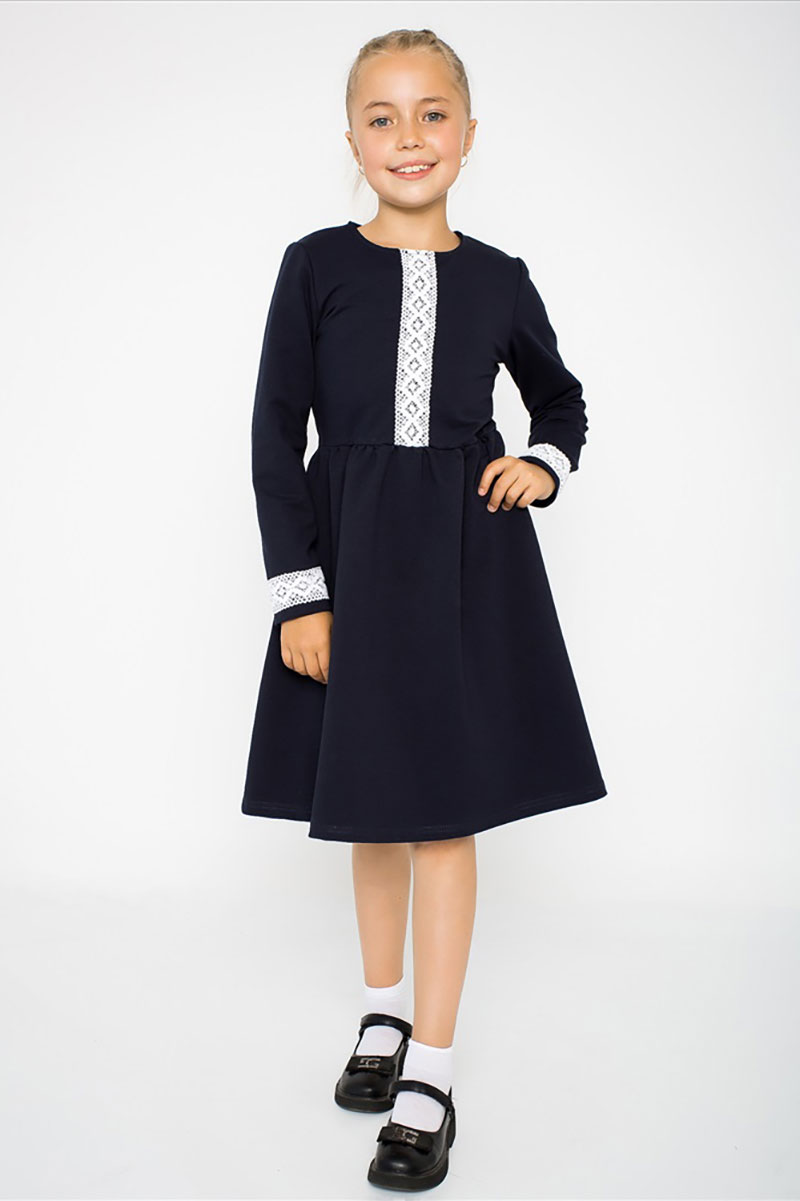 Представляем Вашему вниманию платье для девочек в школу полуприлегающего силуэта, отрезное по талии. Нижняя часть расклешенная с легкой сборкой у талии. Рукав втачной, длинный. Горловина отделана внутренней обтачкой. Для удобства одевания на спинке предусмотрена планка на пуговицах. Украшает платье кружево на полочке и рукавах. Ткань прочная, при носке не деформируется.