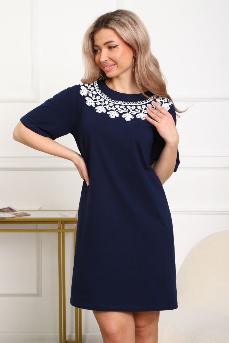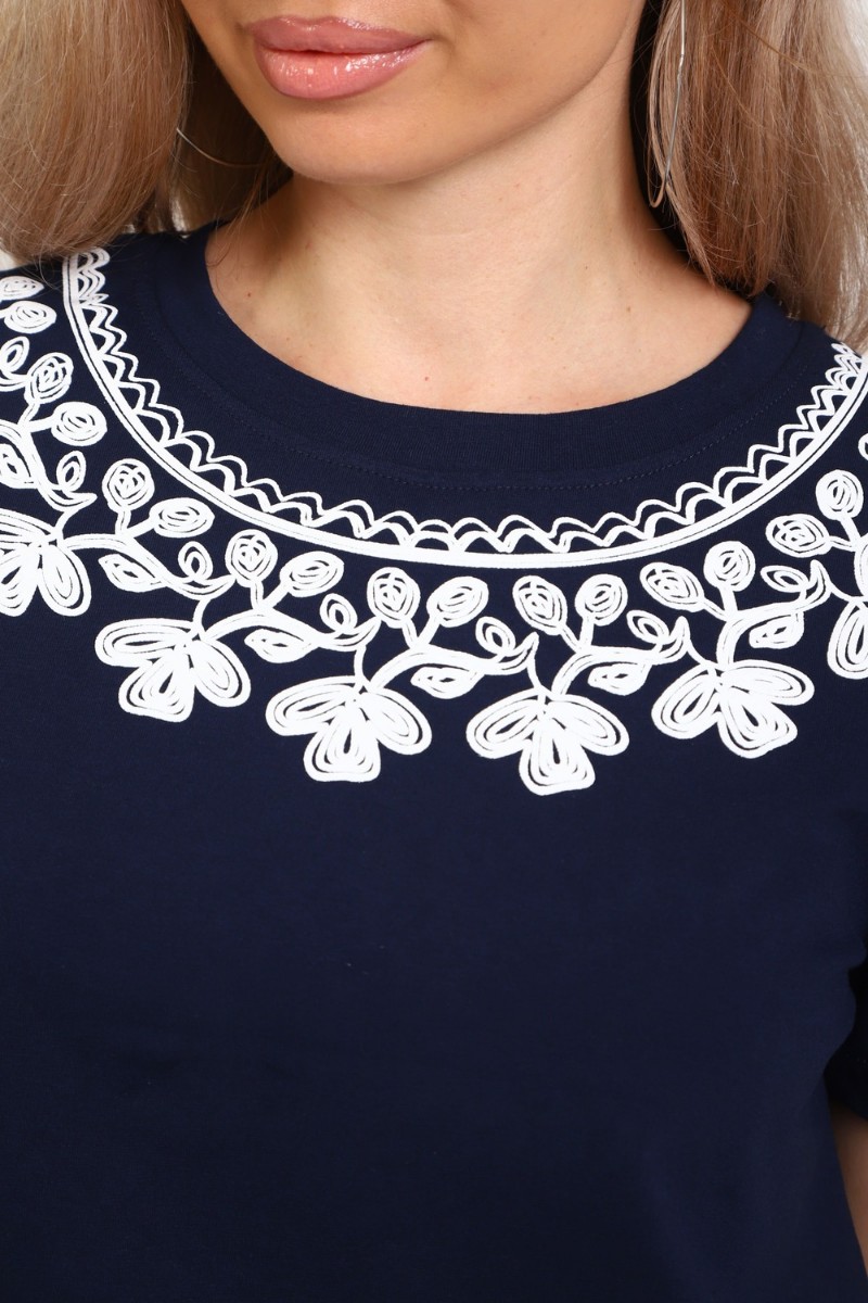 Представляем Вашему вниманию изящную женскую тунику прямого силуэта. Низ изделия прямой. Длинна выше колена, плечо спущенное, рукав короткий. Горловина круглой формы, обработана планкой с отделочной строчкой. Принт (шелкография пуф) в виде кружевного воротника.