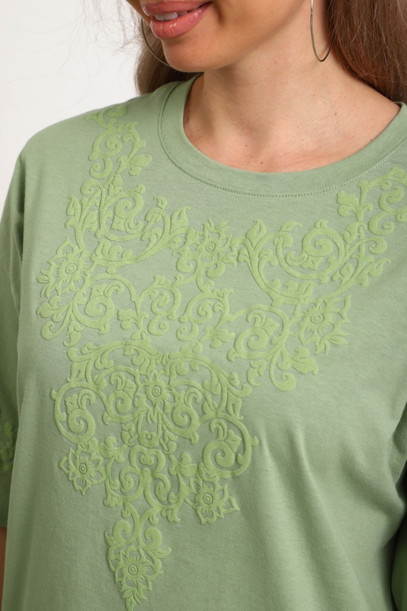 Представляем Вашему вниманию изящную женскую тунику прямого силуэта. Низ изделия прямой. Длинна выше колена, плечо спущенное, рукав короткий. Горловина круглой формы. Принт орнамент (шелкография пуф) располагается по центру переда и на рукавах.