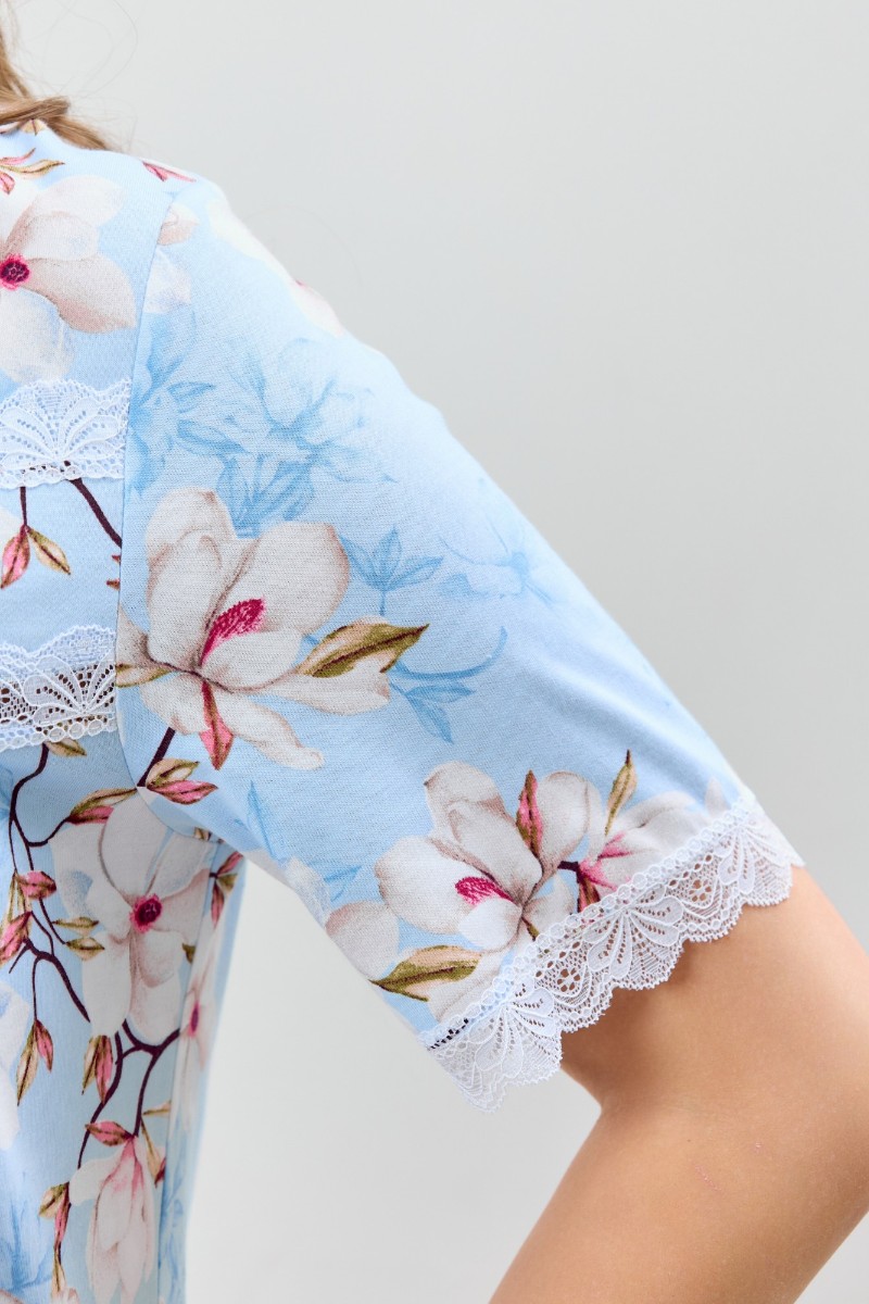 Представляем Вашему вниманию женскую сорочку из трикотажного полотна «кулирка» с набивным рисунком, свободного покроя, расширенная книзу, с короткими втачными рукавами и горловиной фигурной формы. Полочка – с притачной кокеткой V-образной формы, состоящей из двух частей. Нижняя, основная деталь полочки присборена по шву стачивания с кокеткой. Низ рукавов, горловина и кокетка отделаны кружевом. В центре кокетки – два декоративных бантика из узкой атласной ленты.