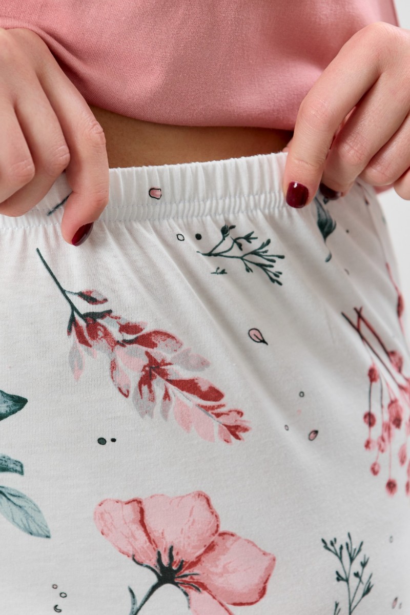 Представляем Вашему вниманию женскую пижаму из трикотажного полотна «кулирка» в комбинации двух видов полотен: с набивным рисунком и гладкокрашенного в единой цветовой гамме, состоящая из футболки и брюк. Футболка - из гладкокрашенного полотна, классического покроя, с короткими втачными рукавами, горловиной овальной формы и принтом на полочке, выполненным в технике «шелкографии». Горловина, низ рукавов обработаны узким притачным кантом контрастного цвета.Брюки - длинные, с эластичной тесьмой по талии и притачными манжетами, которые обработаны с узким кантом контрастного цвета в соединительных швах.