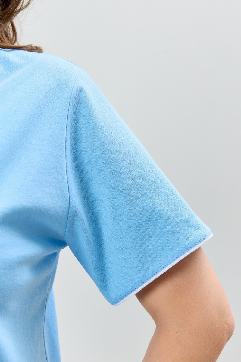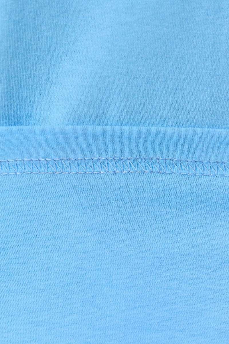 Представляем Вашему вниманию женскую пижаму из трикотажного полотна «кулирка» в комбинации двух видов полотен: с набивным рисунком и гладкокрашенного в единой цветовой гамме, состоящая из футболки и брюк. Футболка - из гладкокрашенного полотна, классического покроя, с короткими втачными рукавами, горловиной овальной формы и принтом на полочке, выполненным в технике «шелкографии». Горловина, низ рукавов обработаны узким притачным кантом контрастного цвета.Брюки - длинные, с эластичной тесьмой по талии и притачными манжетами, которые обработаны с узким кантом контрастного цвета в соединительных швах.
