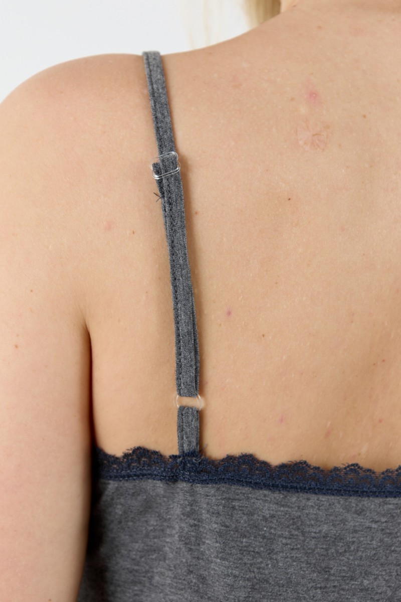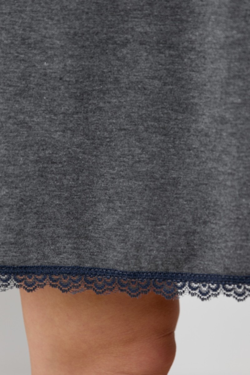 Представляем Вашему вниманию женскую сорочку из трикотажного гладкокрашенного полотна «кулирка меланж», слегка расширенная книзу, на узких бретелях, вытачанных из окантовки. Для регулирования длины бретелей предусмотрены пластмассовые кольца-держатели и фиксаторы. По центру переда застрочен «защип» и пришиты три декоративные пуговицы имитирующие застежку. Вырез горловины переда, спинки, низ изделия отделаны кружевом.