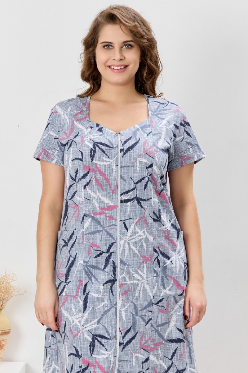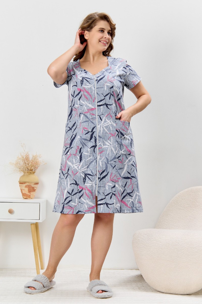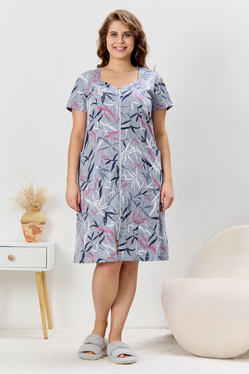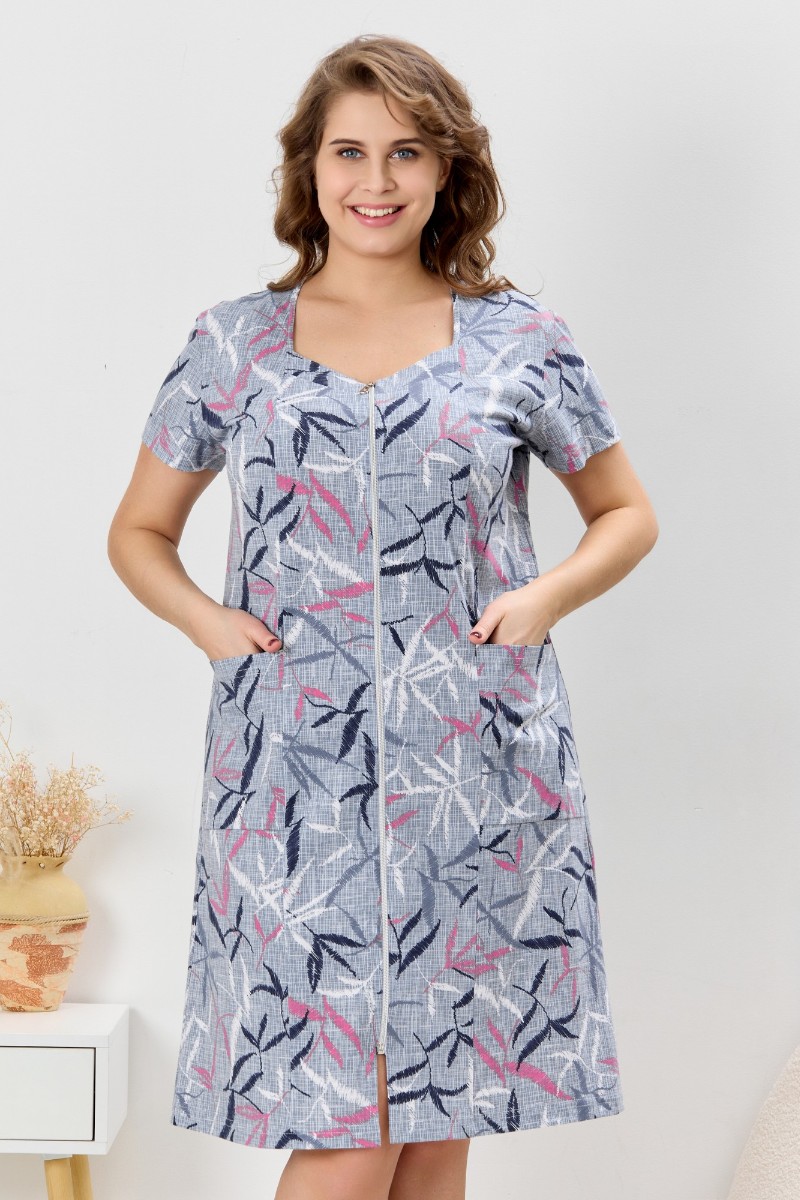 Представляем Вашему вниманию халат женский из трикотажного полотна «кулирка» с набивным рисунком, прямого силуэта, с короткими втачными рукавами, горловиной фигурной формы, двумя накладными карманами на уровне бедер и центральной бортовой застежкой на тесьму «молния». Полочка – с рельефными швами, выходящими из горловины. Нижние срезы горловины обработаны притачными планками. Остальная часть горловины окантована основным материалом.