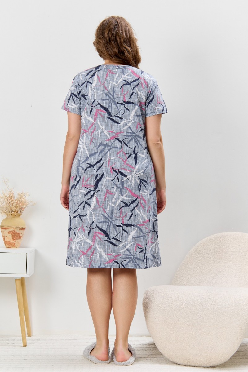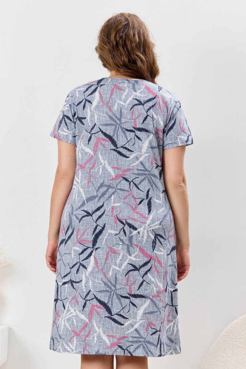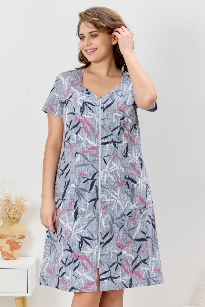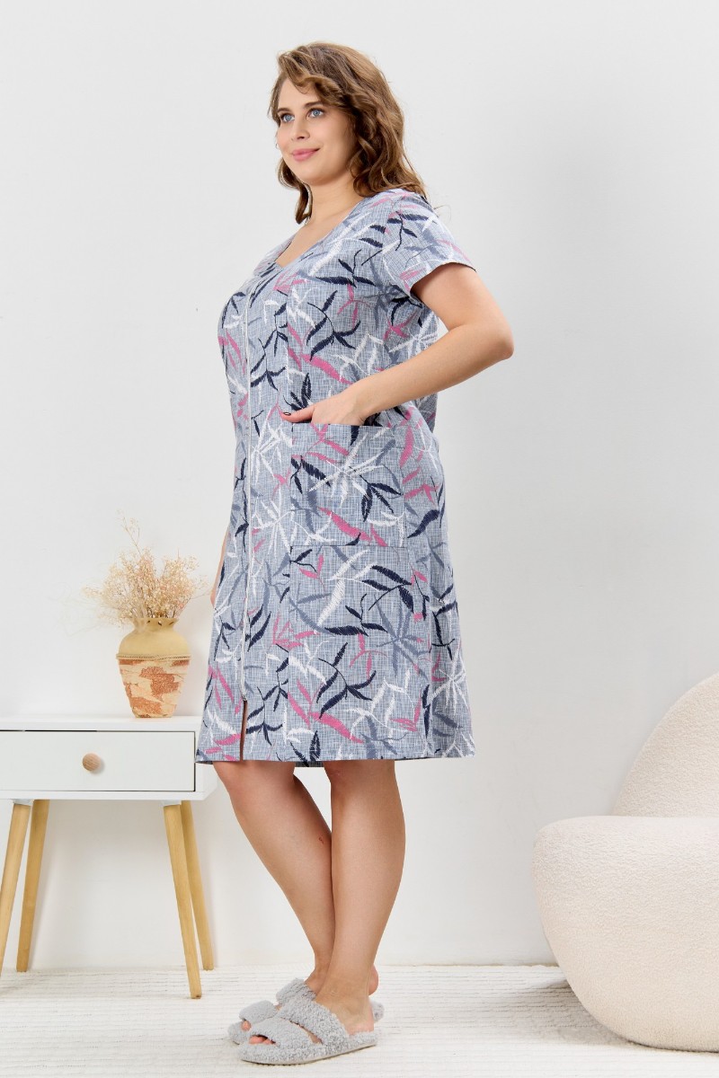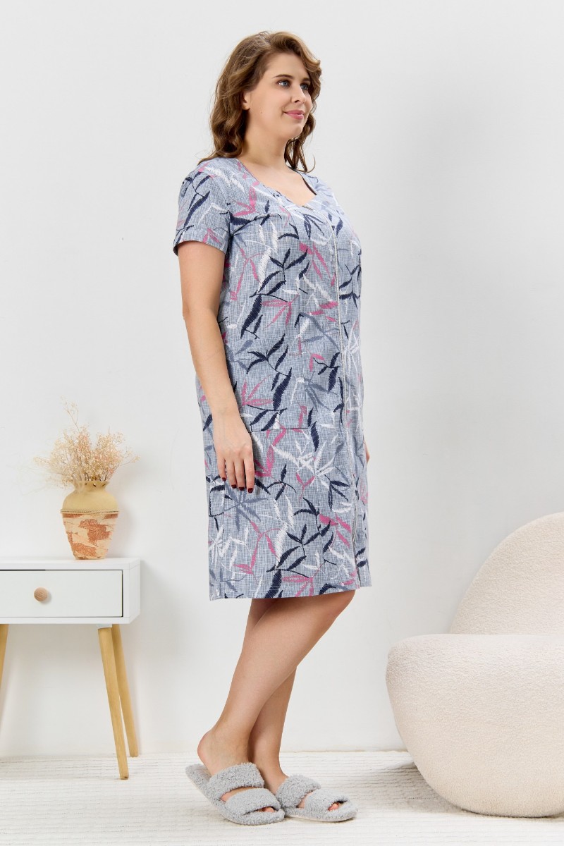 Представляем Вашему вниманию халат женский из трикотажного полотна «кулирка» с набивным рисунком, прямого силуэта, с короткими втачными рукавами, горловиной фигурной формы, двумя накладными карманами на уровне бедер и центральной бортовой застежкой на тесьму «молния». Полочка – с рельефными швами, выходящими из горловины. Нижние срезы горловины обработаны притачными планками. Остальная часть горловины окантована основным материалом.