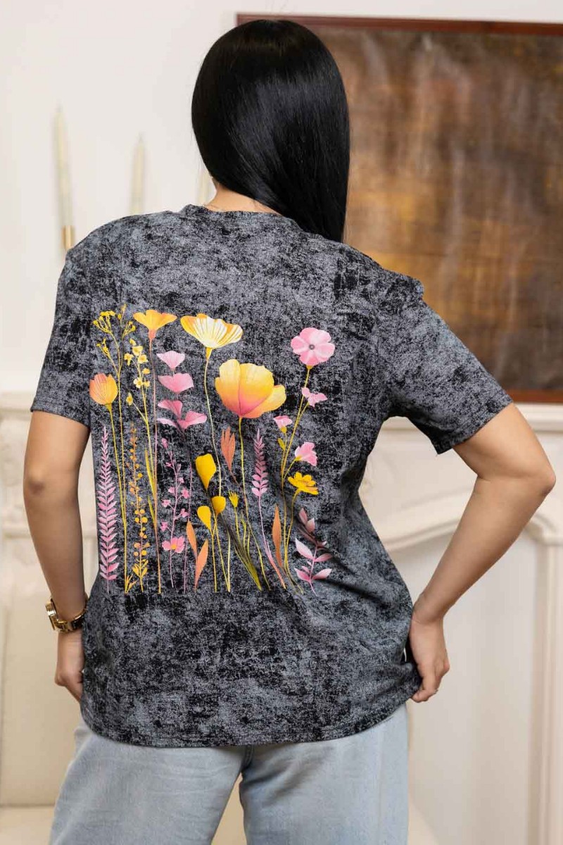 Представляем Вашему вниманию женскую базовую футболку, сшитую из приятного телу, дышащего хлопка с эффектом варенки, спереди и сзади нанесен дизайнерский принт, методом шелкографии. Хорошо сочетается с любым низом, обеспечивая максимум комфорта и полную свободу движений в повседневной носке.