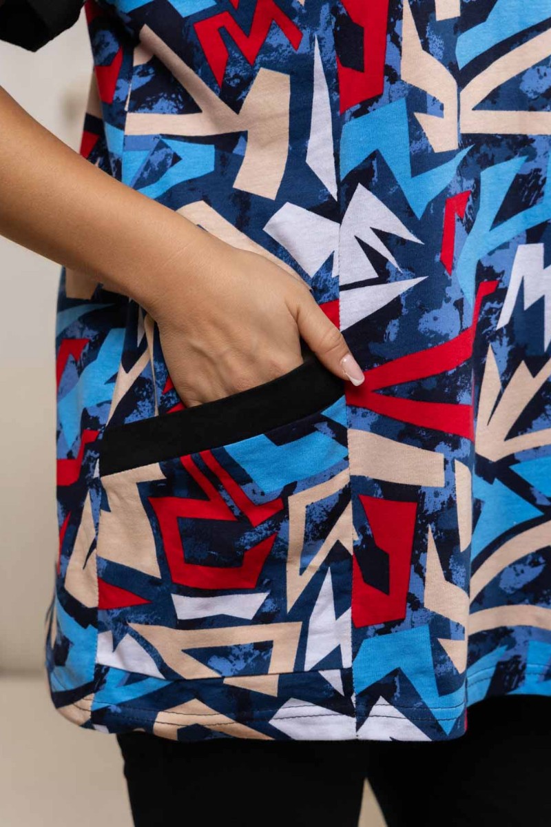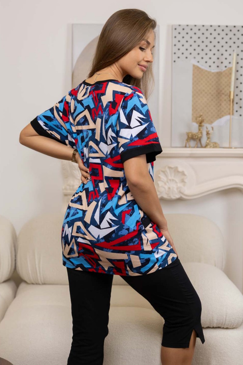 Представляем Вашему вниманию костюм женский из комбинированного трикотажного полотна, состоящий из бридж и кофты. Кофта полуприлегающего силуэта длинной чуть ниже уровня бёдер из набивного трикотажного полотна с отделкой в цвет бридж. Полочка с рельефами и двумя накладными карманами, на которых имеются планки из отделочного материала. Рукав втачной короткий. Вырез горловины О-образный. Бриджи из однотонного трикотажного полотна длинной ниже уровня колена.