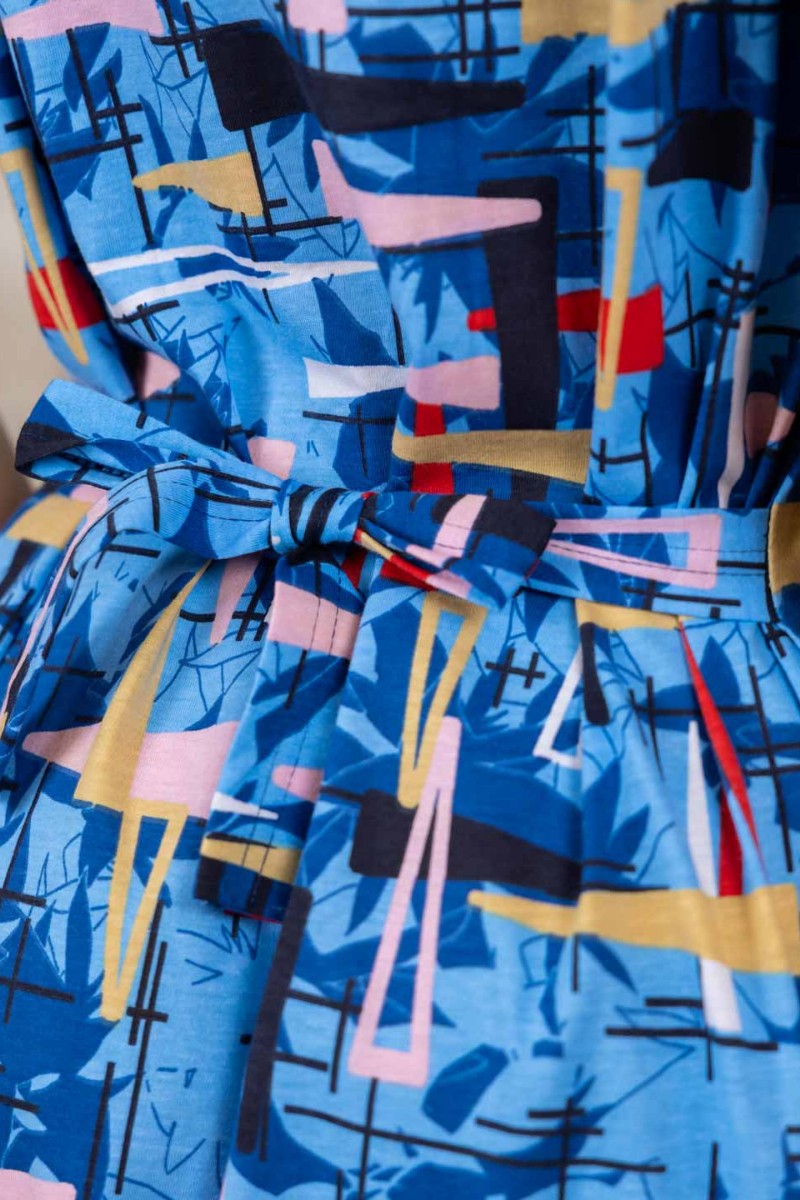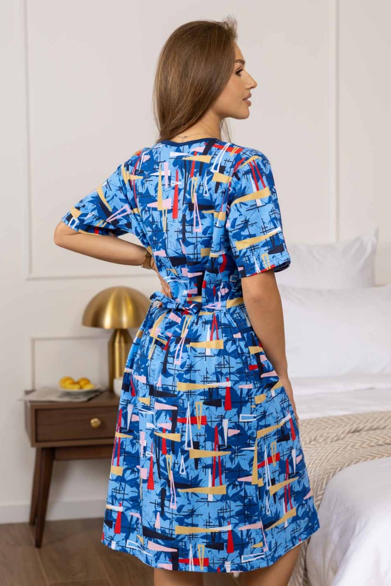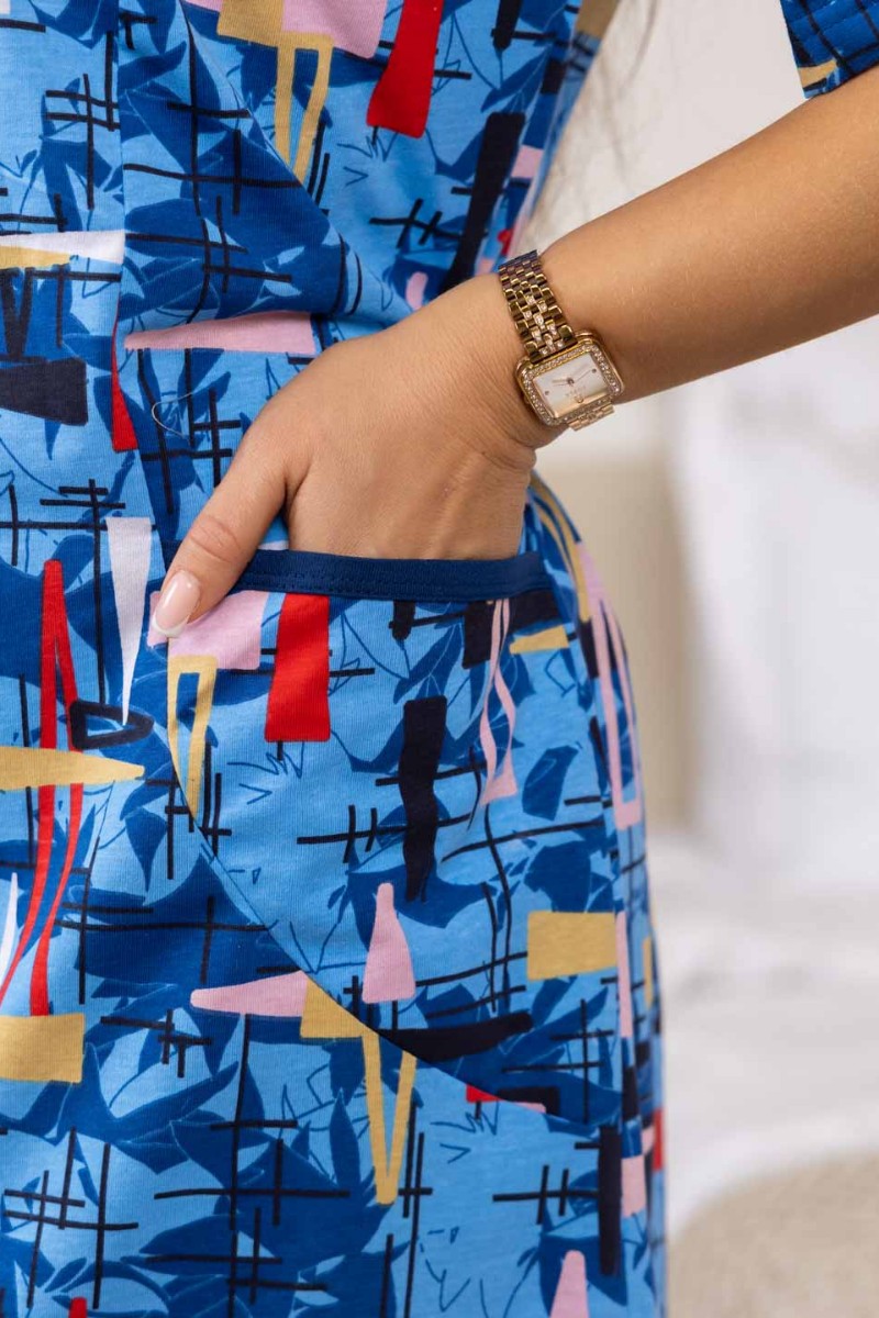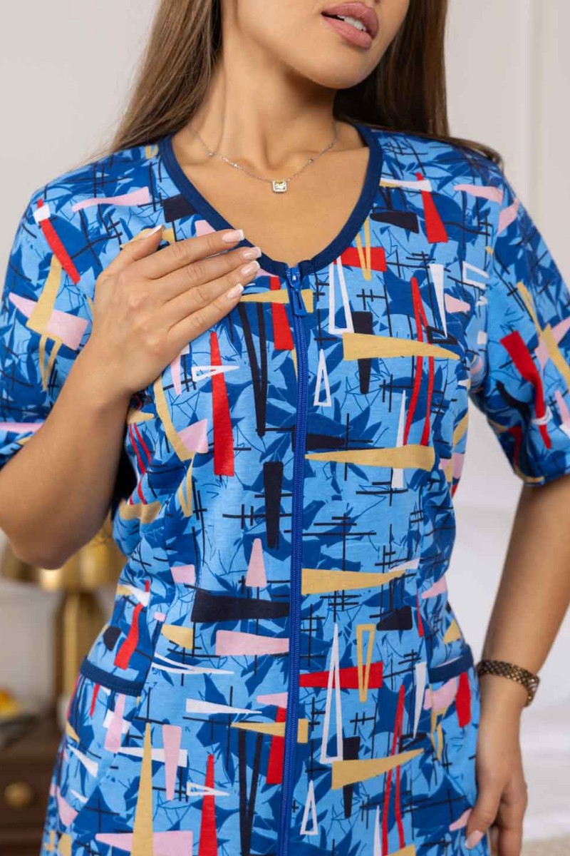 Представляем Вашему вниманию халат женский из 100% хлопка, полуприлегающего силуэта длиной чуть выше уровня колена. Халат выполнен из яркой ткани, с застежкой на молнию. На полочке присутствуют накладные карманы с отделкой в верхней части. Вырез горловины V-образный, обработанный окантовкой. Идеально подойдет для дома, в нашем халате вы будете чувствовать себя комфортно пока занимаетесь домашними делами.