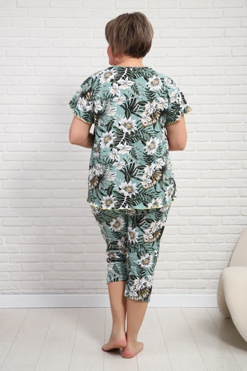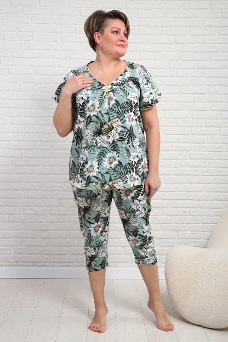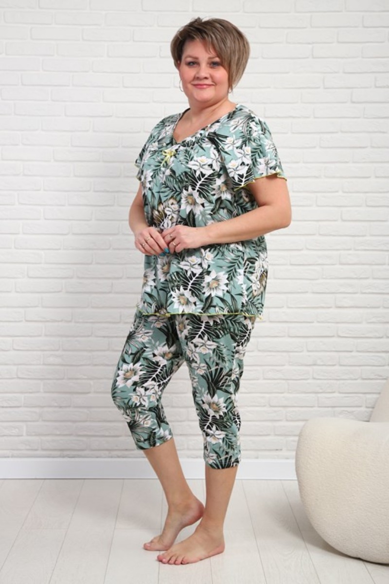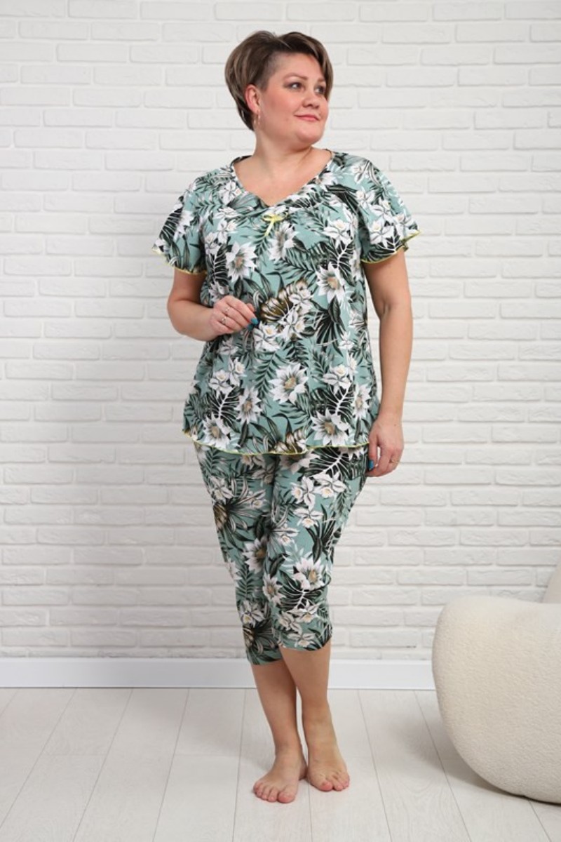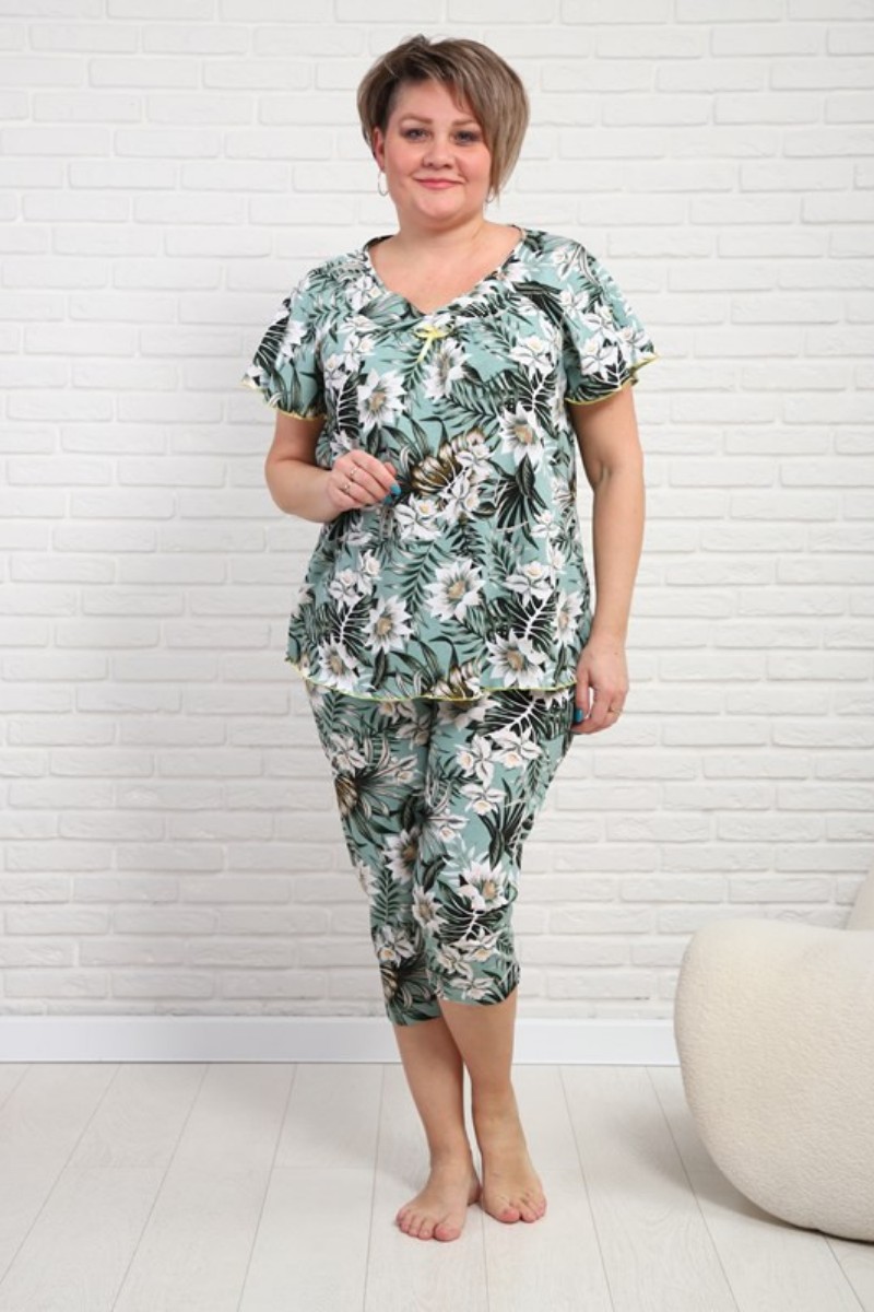 Представляем Вашему вниманию удобную и практичную женскую пижаму с бриджами, отдых в которой будет максимально приятным и расслабляющим. Изящный комплект, украшенный нежным принтом, выполнен из высококачественного, натурального материала, который хорошо пропускает воздух, позволяя коже дышать.