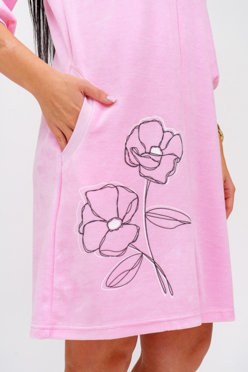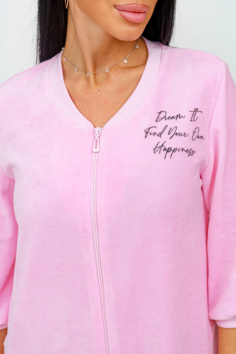 Представляем Вашему вниманию женский велюровый халат на молнии с нежными принтами на полочках. В боковых швах карманы. Срезы халата обработаны рибаной.