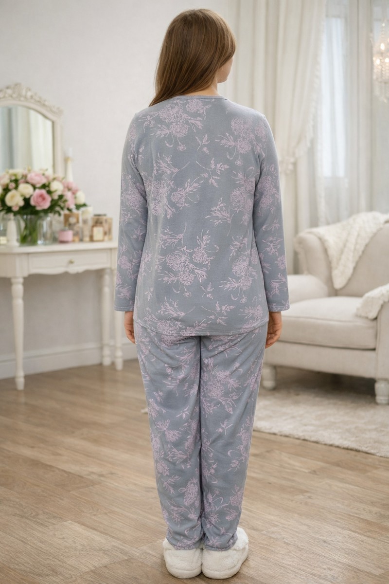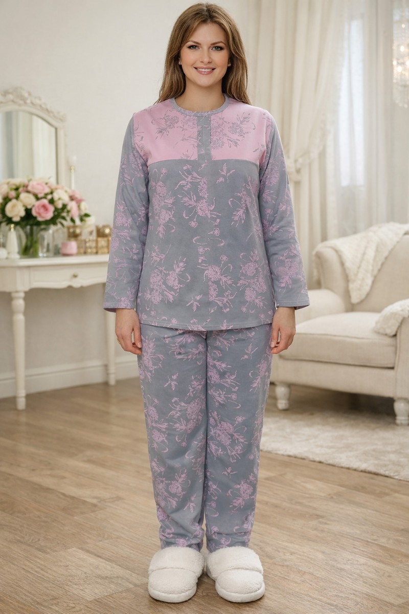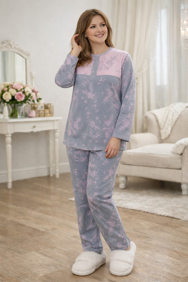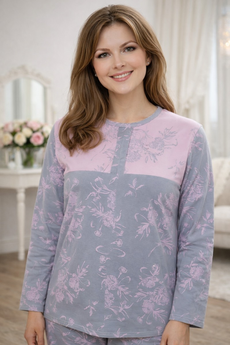 Представляем Вашему вниманию женский домашний костюм, выполненный из мягкого и приятного к телу трикотажа. Модель состоит из лонгслива с длинным рукавом и удобных брюк свободного кроя. Основной цвет — серый и розовый украшенный изящным цветочным принтом в пастельно-розовых оттенках. Верх костюма дополнен контрастной розовой вставкой в зоне груди, которая визуально освежает образ и делает его более женственным. Брюки с эластичным поясом обеспечивают комфортную посадку и свободу движений. Костюм идеально подходит для сна, отдыха и уютных домашних вечеров, сочетая в себе комфорт, практичность и элегантный внешний вид.