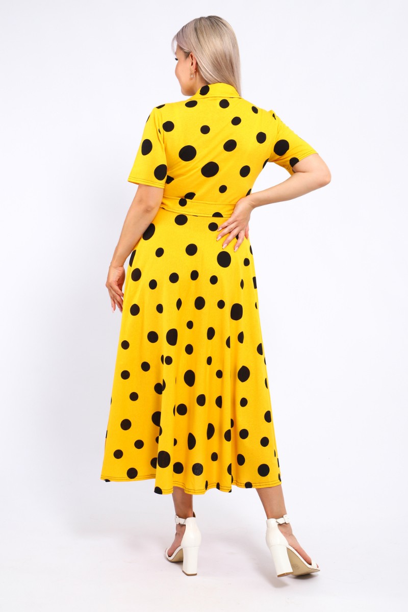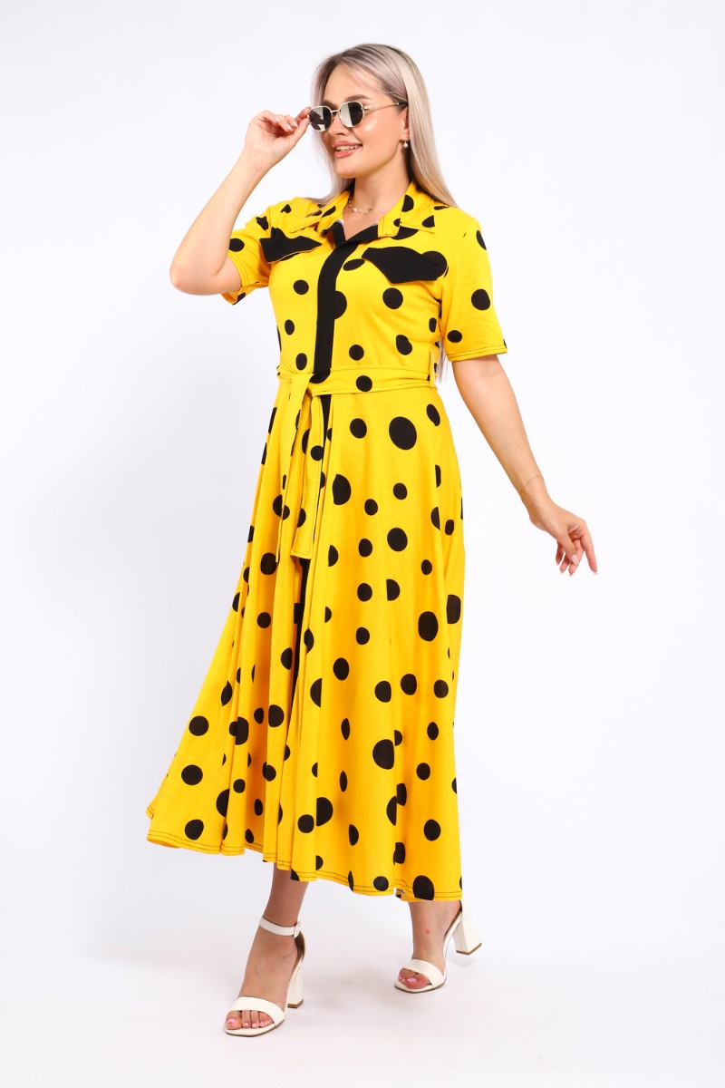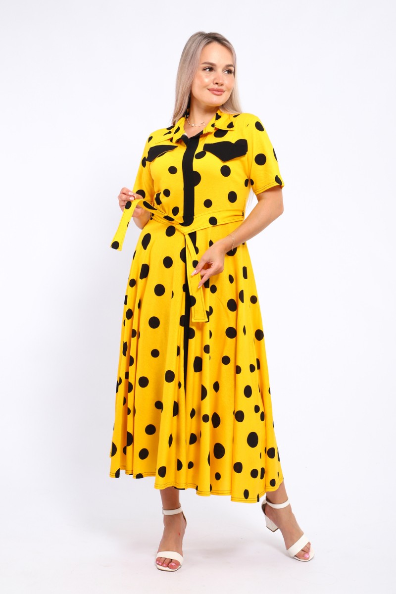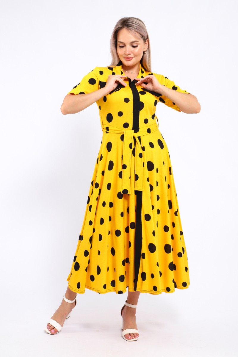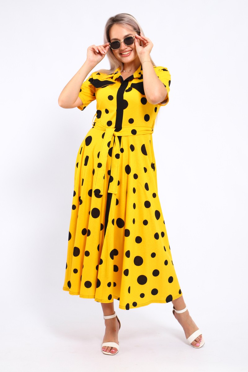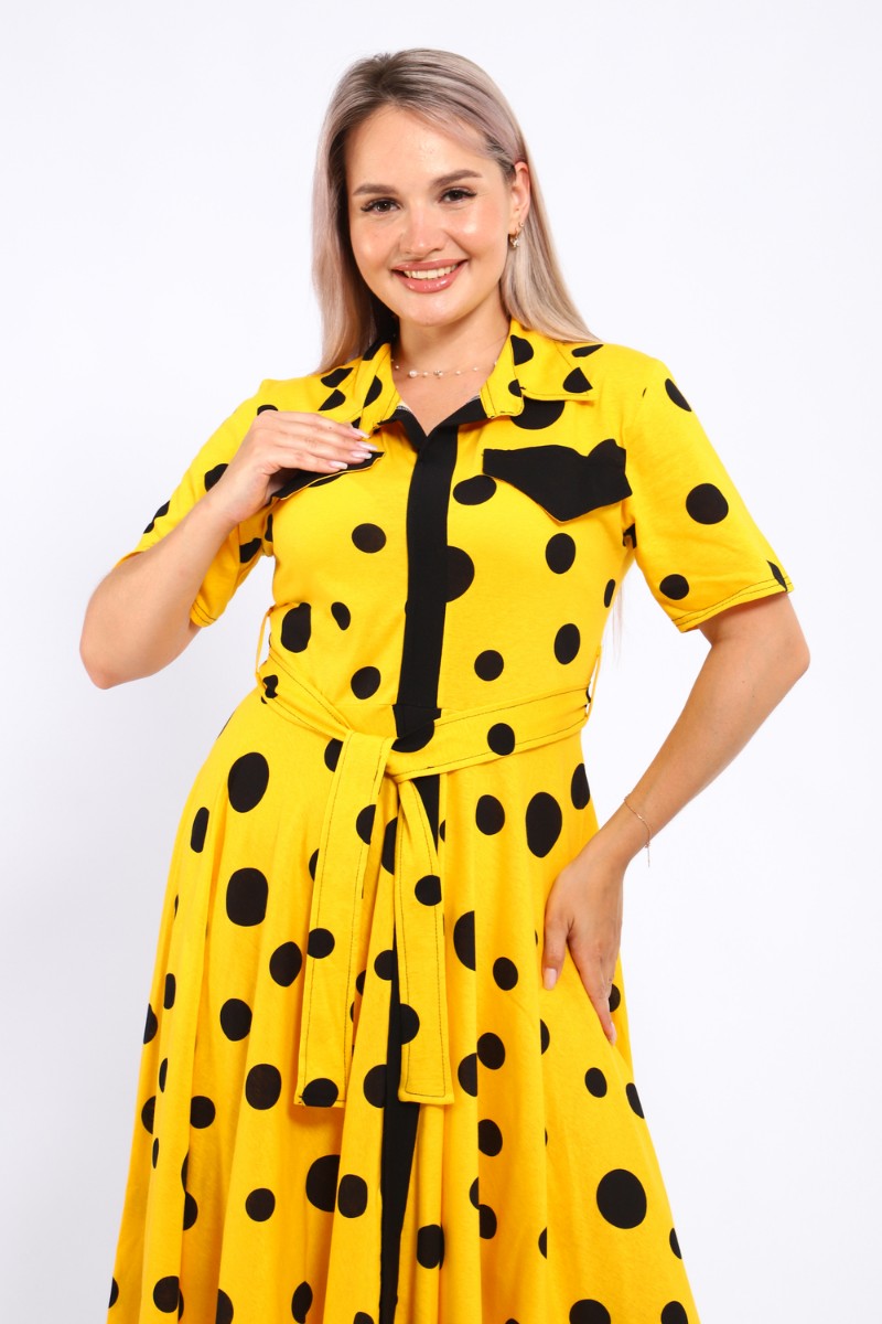 Представляем Вашему вниманию платье, которое сочетает в себе комфорт и уникальный дизайн. Модель выполнена из мягкого материала, что делает её идеальной для повседневной носки. Свободный крой с расклешённой юбкой и акцент на талии с помощью пояса создают воздушный и женственный силуэт. Контрастное сочетание жёлтого и чёрного в гороховом принте — смелое и при этом очень гармоничное решение. Это платье — отличный выбор для прогулок, встреч с друзьями или офиса. Носите его с босоножками на каблуке для создания изысканного образа или с кедами для более расслабленного стиля.
