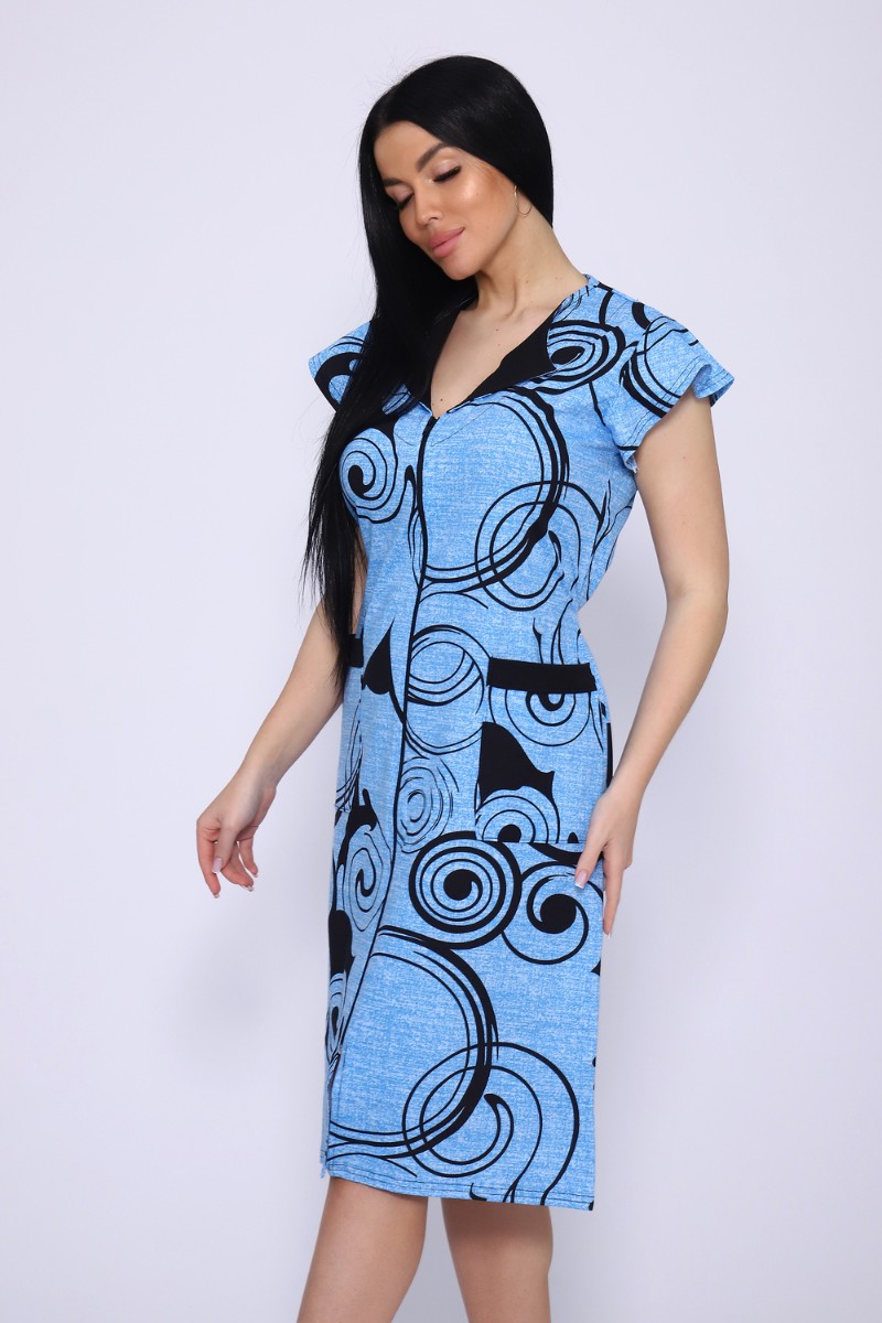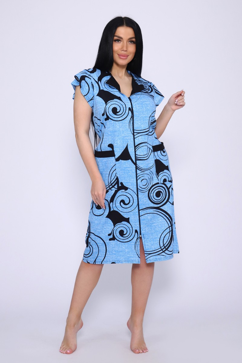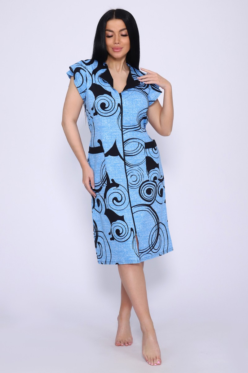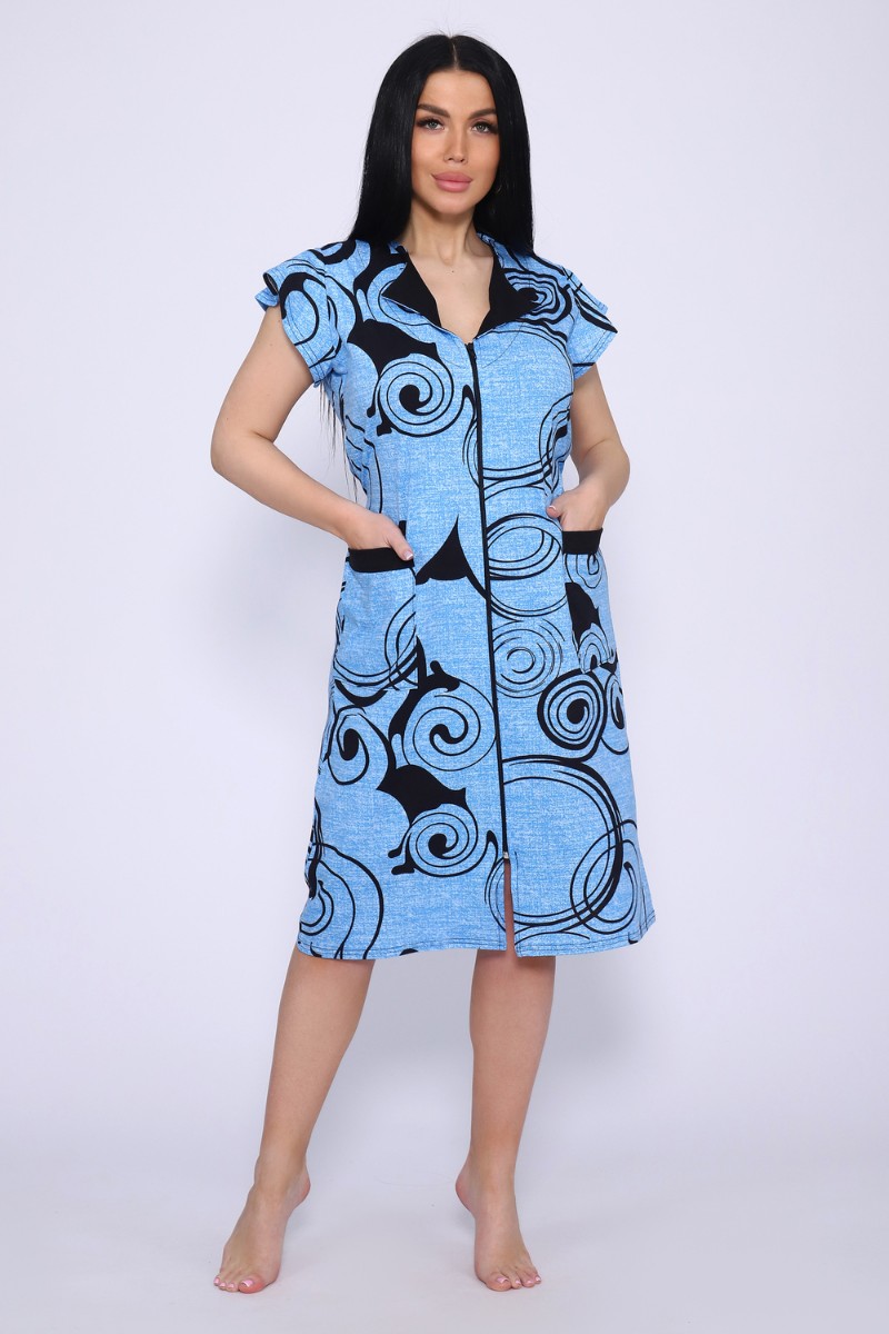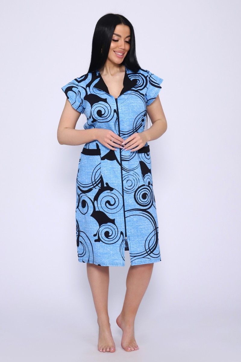 Представляем Вашему вниманию оригинальный женский халат с красивым принтом на ткани. Рукав короткий в форме крылышка, с накладными карманами, отложной треугольный воротник. Застежка-молния, длина ниже колена, очень приятный к телу.