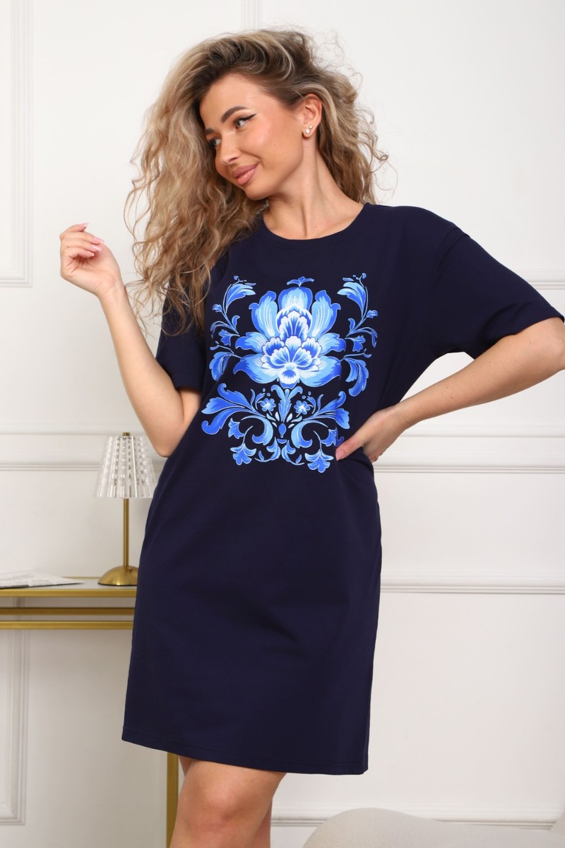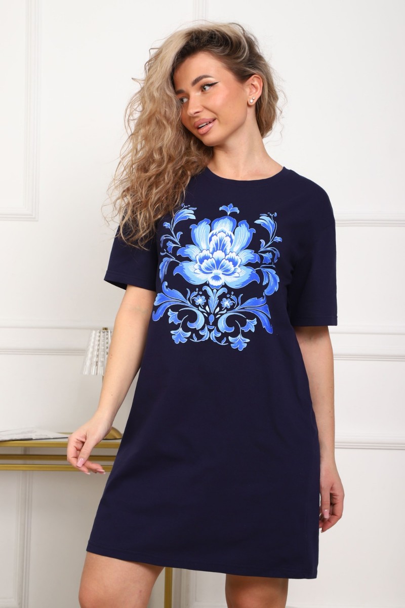 Представляем Вашему вниманию легкую женскую тунику прямого силуэта. Низ изделия прямой. Длинна выше колена, плечо спущенное, рукав короткий. Горловина круглой формы, обработана планкой с отделочной строчкой по шву притачивания. Принт (шелкография) располагается по центру переда.