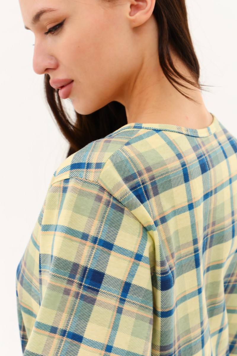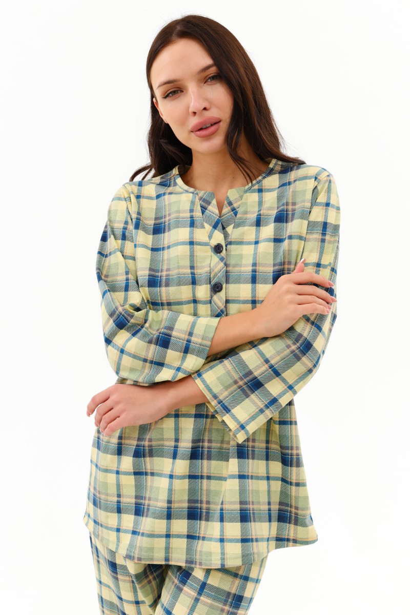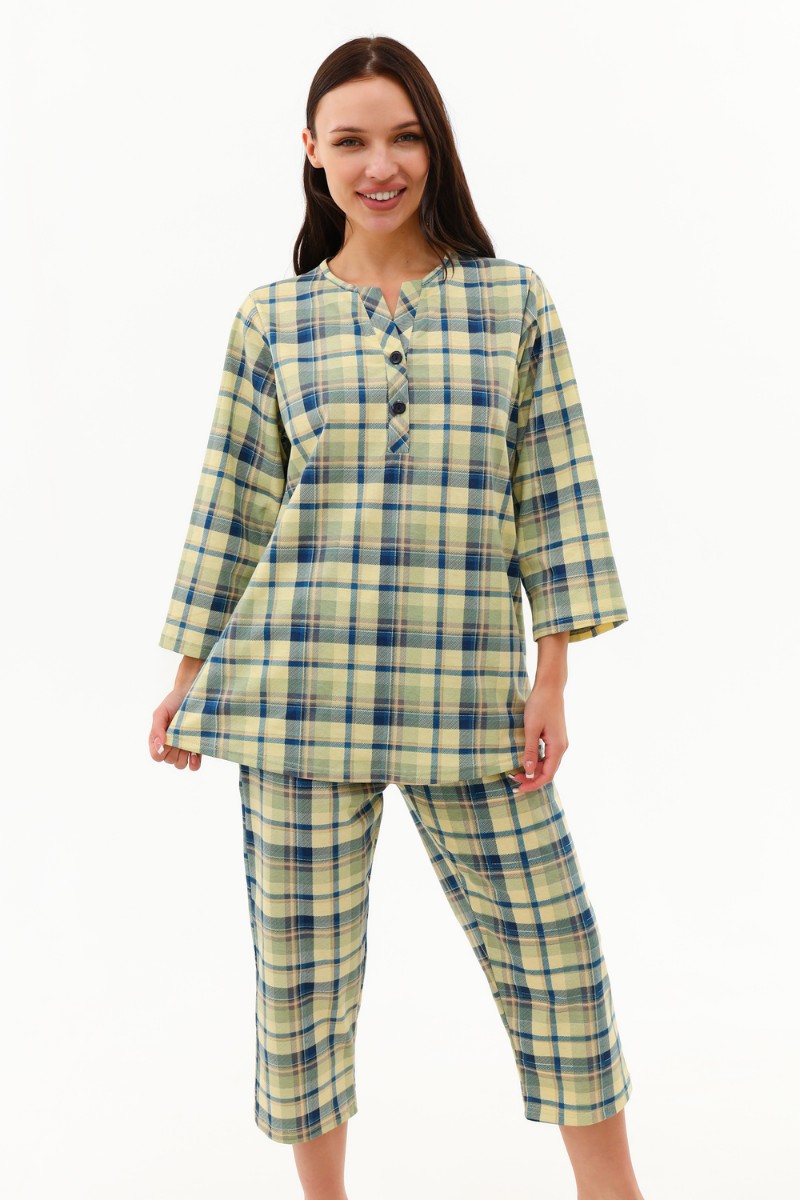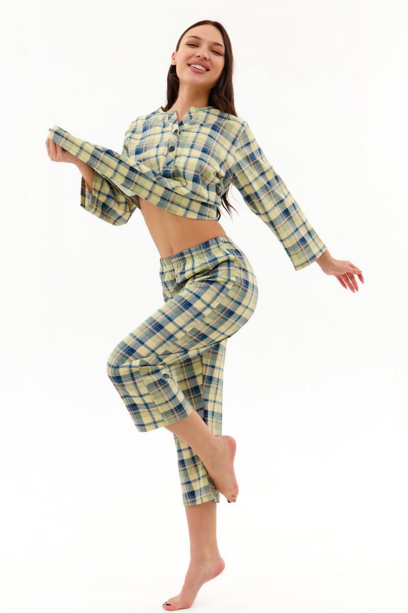 Представляем Вашему вниманию легкую женскую пижаму, сшитую из комфортной приятной к телу ткани. Состоит из удлинённой кофты с застёжкой - поло и бридж. Низ кофты слегка закруглён к боковым срезам. Пижамка хорошо садиться на любой тип фигуры за счёт большого размера припусков на свободу облегания. Бриджи с высокой удобной посадкой на эластичной резинке 3 см. Качественно. Уютно. Для тебя. Носите с удовольствием.