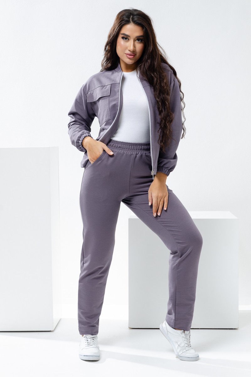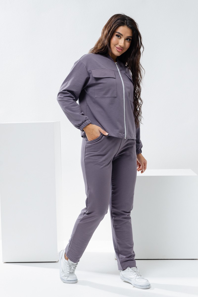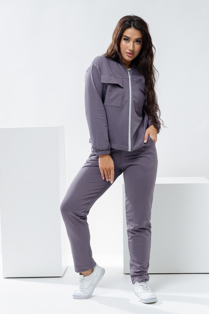 Представляем Вашему вниманию женский костюм двойку, сшитый из футера 2-х нитки. Комплект состоит из курточки и брюк. Брюки с боковыми карманами и на притачном поясе. Курточка с длинным рукавом . Полочка застегивается на молнию. На полочке расположена кокетка и накладные карманы с клапанами. Низ изделия фиксируется резинкой. Низ рукавов на резинке.