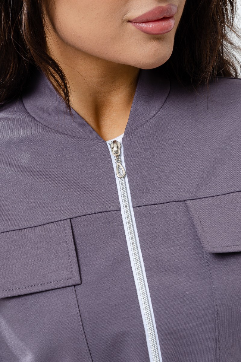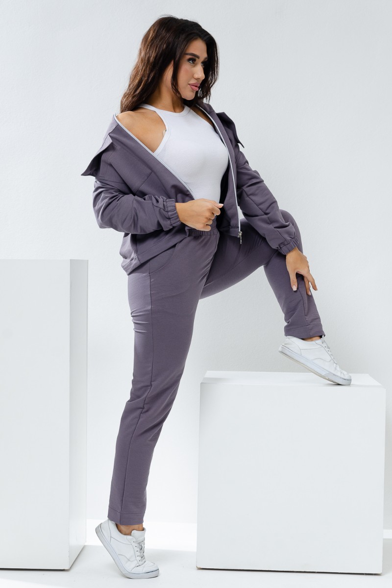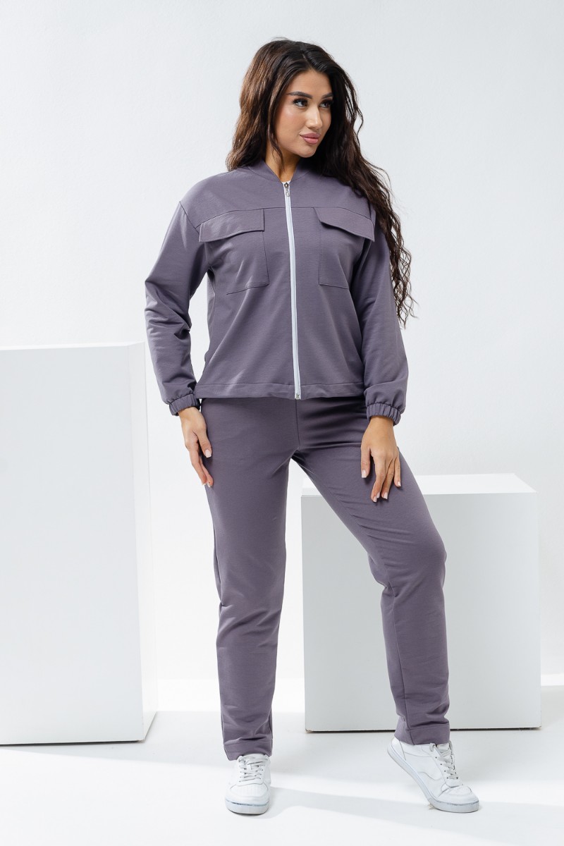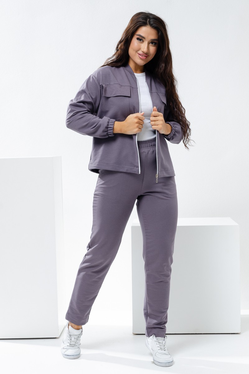 Представляем Вашему вниманию женский костюм двойку, сшитый из футера 2-х нитки. Комплект состоит из курточки и брюк. Брюки с боковыми карманами и на притачном поясе. Курточка с длинным рукавом . Полочка застегивается на молнию. На полочке расположена кокетка и накладные карманы с клапанами. Низ изделия фиксируется резинкой. Низ рукавов на резинке.