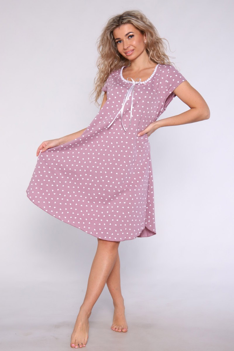 Представляем Вашему вниманию легкую женскую сорочку, сшитую из хлопковой трикотажной кулирки. Силуэт расклёшенный, горловина украшена шитьем из белых ромашек и двойным атласным бантиком, рукавчики - короткие.